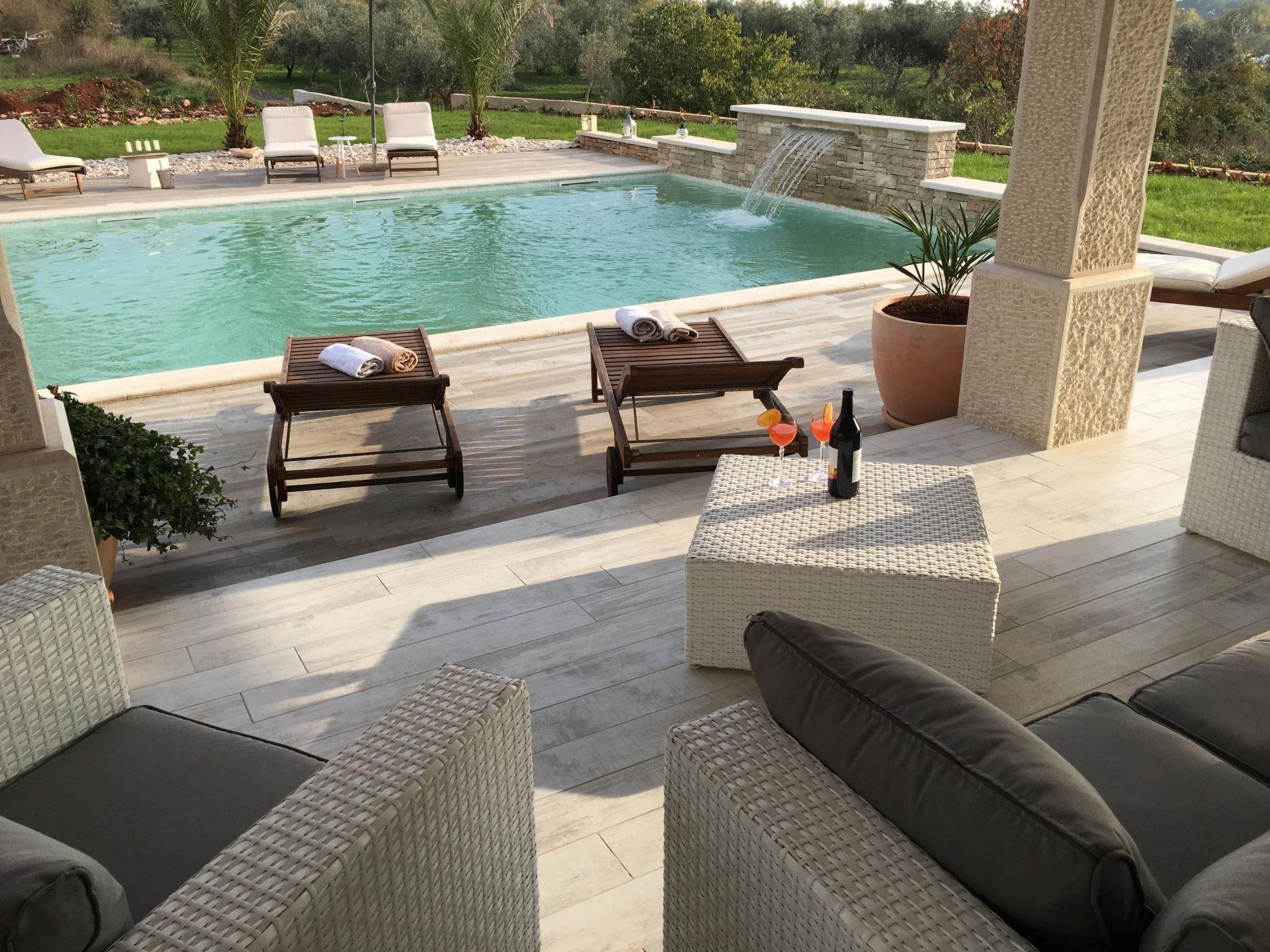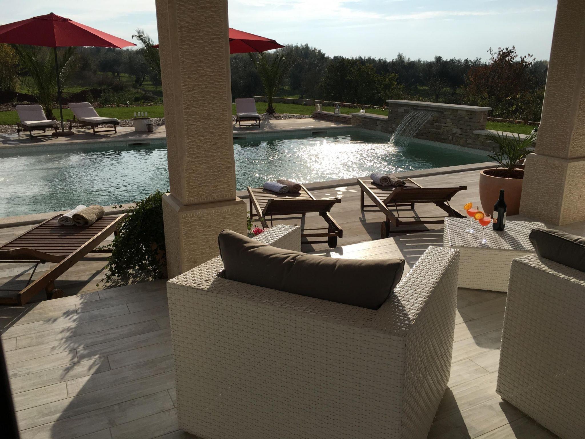 Zur Villa gehört ein komplett umfriedetes, ca. 2000 m² großes Grundstück mit Garten und einem herrlichen Salzwasserpool (60 m²) mit Wasserfall und Massagedüsen. Die Sonnenterrasse rund um das Schwimmbecken ist mit Sonnenliegen, großen Sonnenschirmen und Schaukeln ausgestattet. Vor dem Gebäude befindet sich eine große Veranda, die mit einem großen Esstisch und Stühlen ausgestattet ist: der ideale Platz, um im Sommer die Mahlzeiten einzunehmen und gesellig zusammen zu sitzen. Ein Teil der Veranda ist mit bequemen Sitzmöbeln aus Korb versehen: der Lieblingsplatz für gute Gespräche und für Eltern, die ihre Kinder im Pool gern im Auge behalten möchten. Für Grillabende unter dem Sternenhimmel ist dank des Barbecues auch gesorgt. Für die Fahrzeuge sind Parkplätze im Hof hinter der Villa vorhanden.