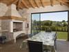 Die Terrasse der Villa verfügt über einen 32 m2 großen türkisfarbenen Pool, Liegestühle, einen Holzkohlegrill und einen Esstisch.