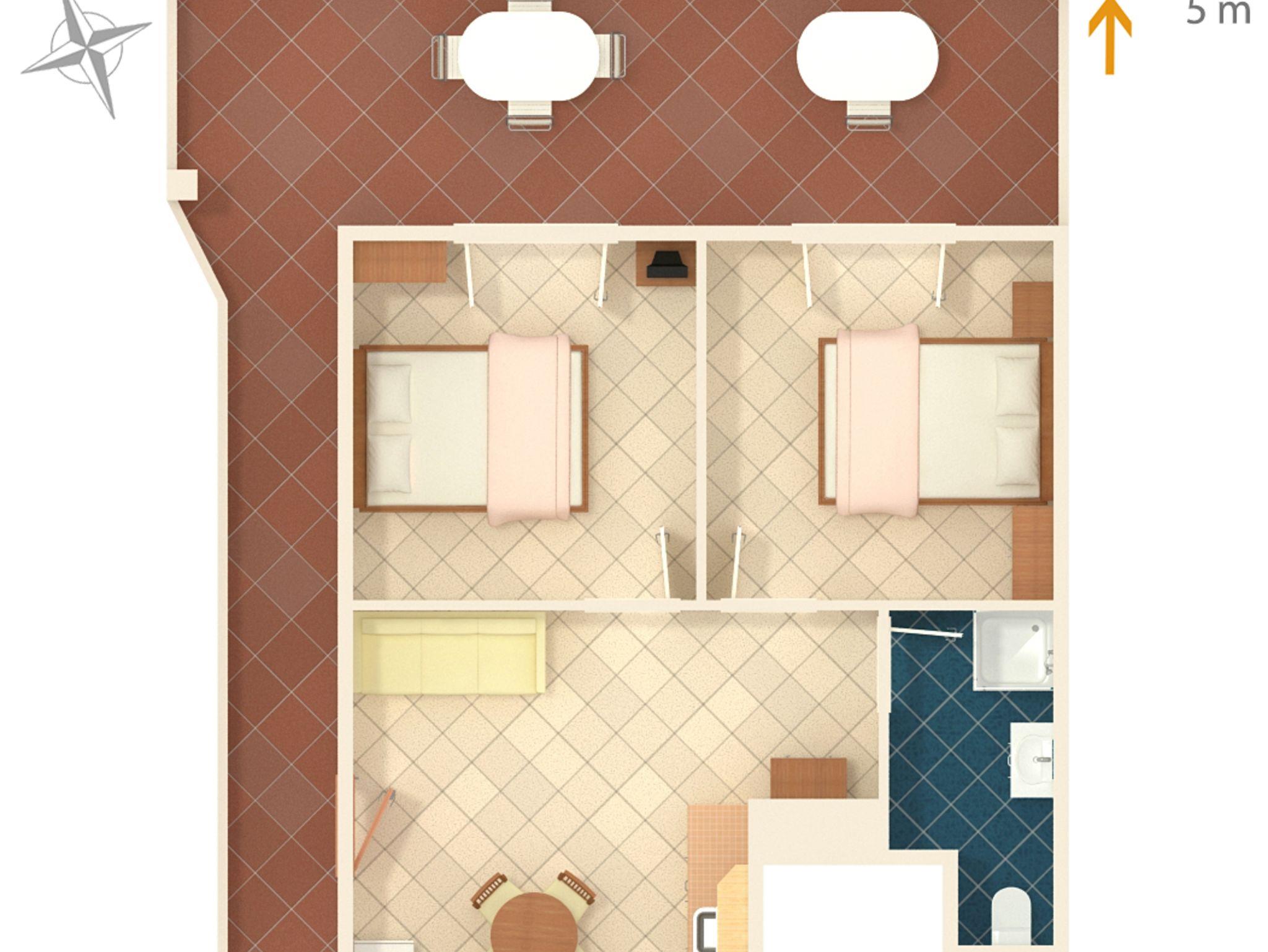 Ferienwohnung bietet Platz für 5 Gäste. Die Betten sind in Schlafzimmern, die es 2 gibt, und in Esszimmer, innerhalb einer Gesamtfläche von 40m2, angeordnet. Die Gäste haben eine eigene Terrasse zur Verfügung, auf der sie in warmen Sommernächten genießen können. Das Apartment bietet Meerblick. Es ist erlaubt, Speisen auf dem Gemeinschafts-Grill vorzubereiten. In der Unterkunftseinheit besteht die Möglichkeit des Mitbringens von Haustieren gegen Aufpreis. IM PREIS INBEGRIFFEN: Kurtaxe, Endreinigung, Klimatisierung, Parkplatz, Internet, Bootsanlegeplatz, Kinderbett, Bügeleisen, Bügelbrett, tragbarer Grill. VERBINDLICHE ZUSÄTZLICHE KOSTEN: Aufzahlung für Kurzaufenthalte (prozentualer Zuschlag pro Nächtigungsanzahl: 30% - 1, 20% - 2, 10% - 3). UNVERBINDLICHE ZUSÄTZLICHE KOSTEN: Haustiere (5,00 € pro Nacht). Die Verfügbarkeit zusätzlicher Dienstleistungen in Ihrem reservierten Termin und die Preise derselben (falls nicht aufgeführt) müssen im Voraus überprüft werden. Zusätzliche Dienstleistungen die in der Zahlungsaufforderung nicht aufgeführt sind werden direkt beim Vermieter bezahlt, angenommen der Gast nutzt auch diese.