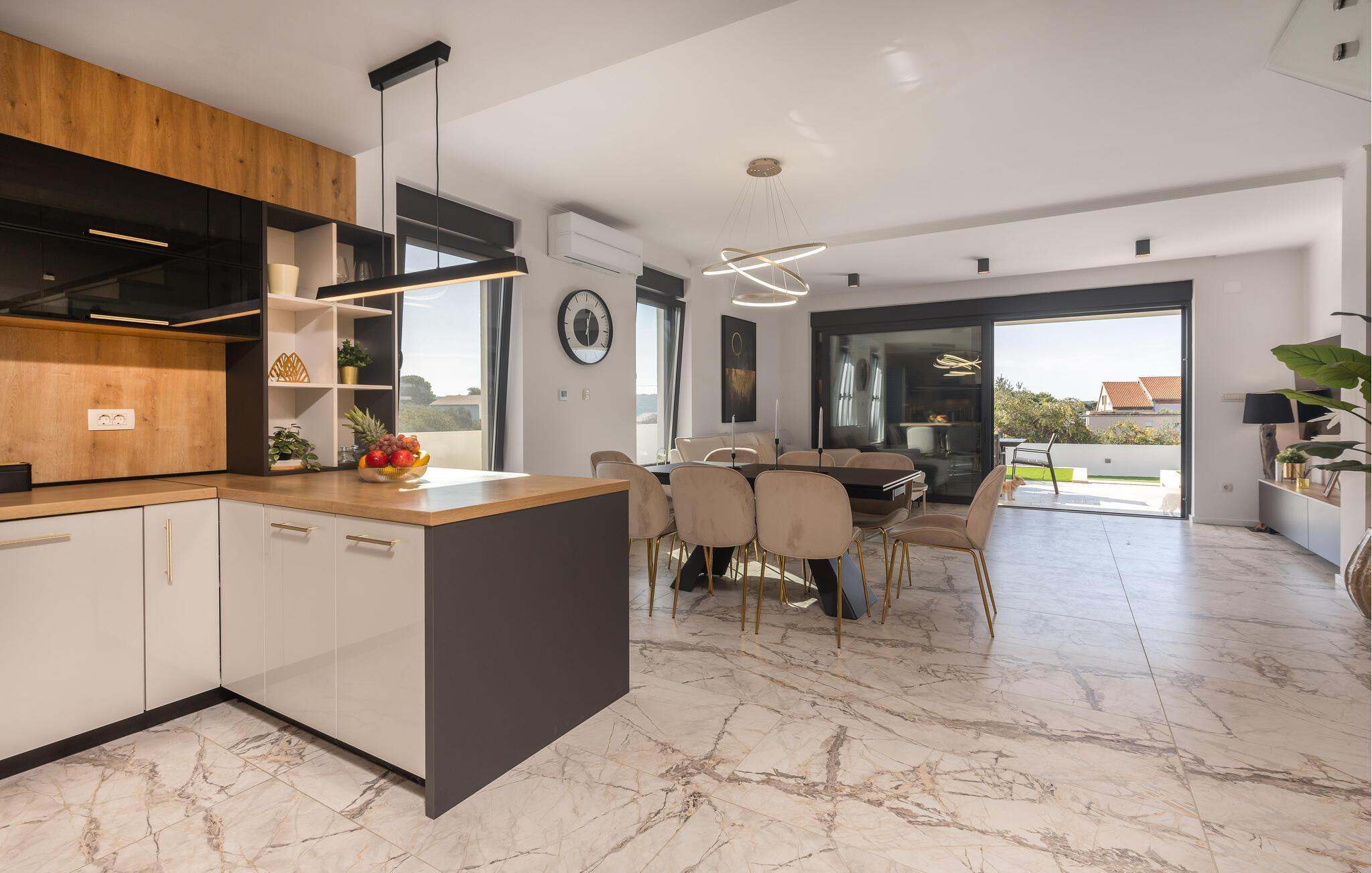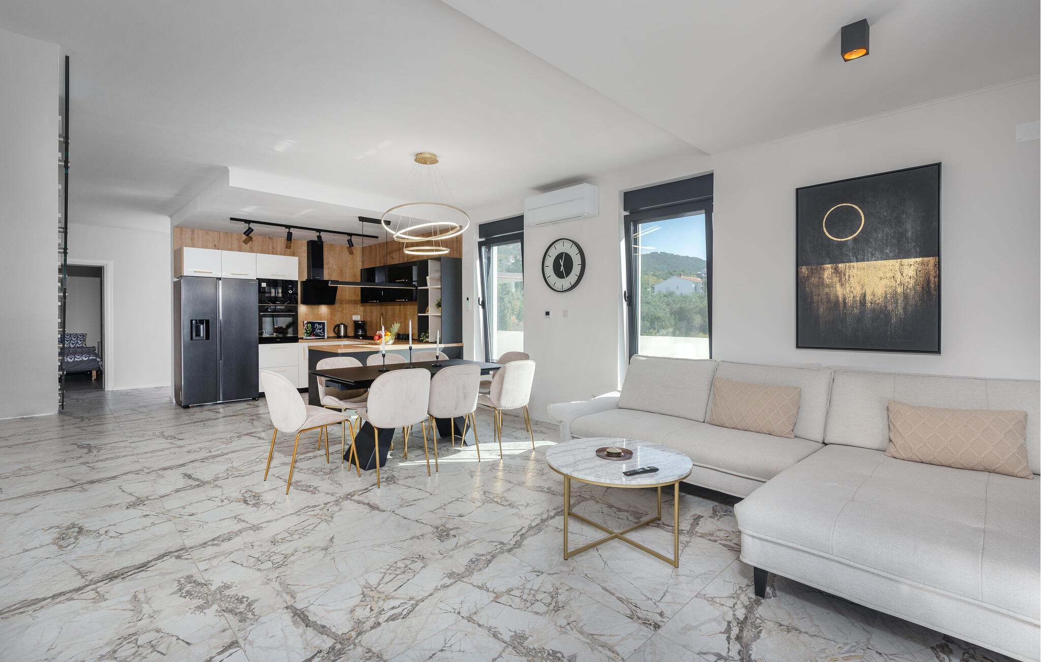 Dieses moderne Ferienhaus in Banjol bietet Ihnen und Ihrer Familie oder Freunden auf zwei Etagen ein stilvolles Ambiente und herrlichen Blick auf das Meer. Die hochwertigen, individuell eingerichteten Schlafzimmer sorgen für Komfort und Entspannung, während der offene Wohnbereich Raum zum gemeinsamen Kochen, Essen und Relaxen bietet. Die Sommerküche im Freien lädt Sie zu geselligen Abenden ein, und der beheizte Außenpool sorgt für Erfrischung und Entspannung. Umgeben von einem gepflegten, umzäunten Garten mit hochwertigen Gartenmöbeln können Sie hier die Sonne genießen.