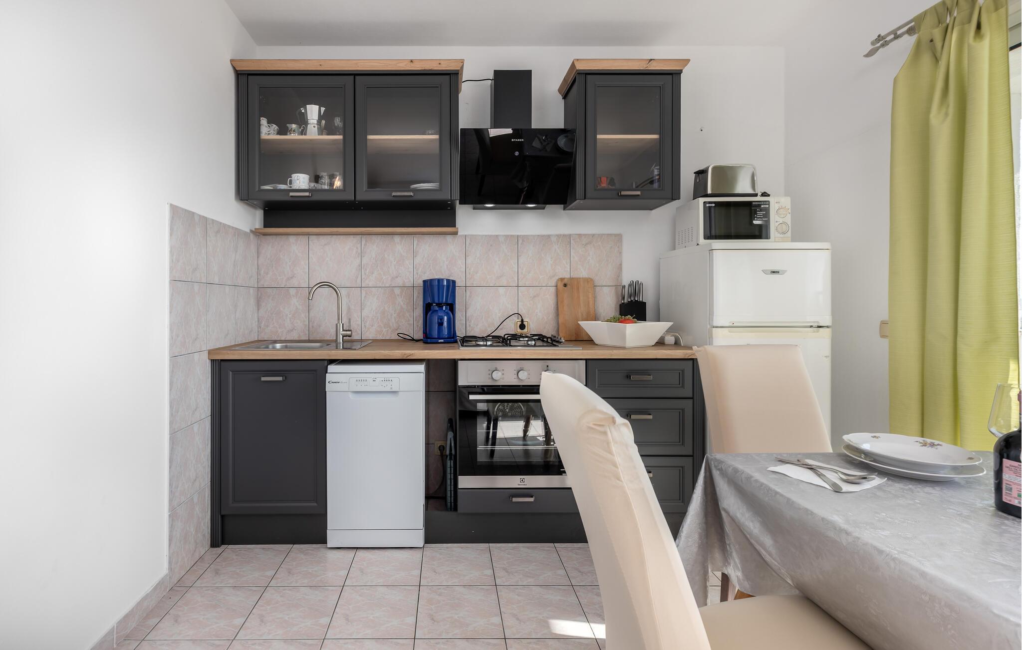 Diese malerisch auf der Insel Rab gelegene Wohnung ist wie geschaffen für eine Auszeit vom Alltag. Entspannen Sie sich bei einer Tasse Kaffee in dem schönen Wohnbereich, durch dessen große Fenster viel helles Licht ins Innere fällt. Schmieden Sie Pläne für den kommenden Urlaubstag oder veranstalten Sie in der praktischen Küche zu ein kleines Kochduell zu zweit.