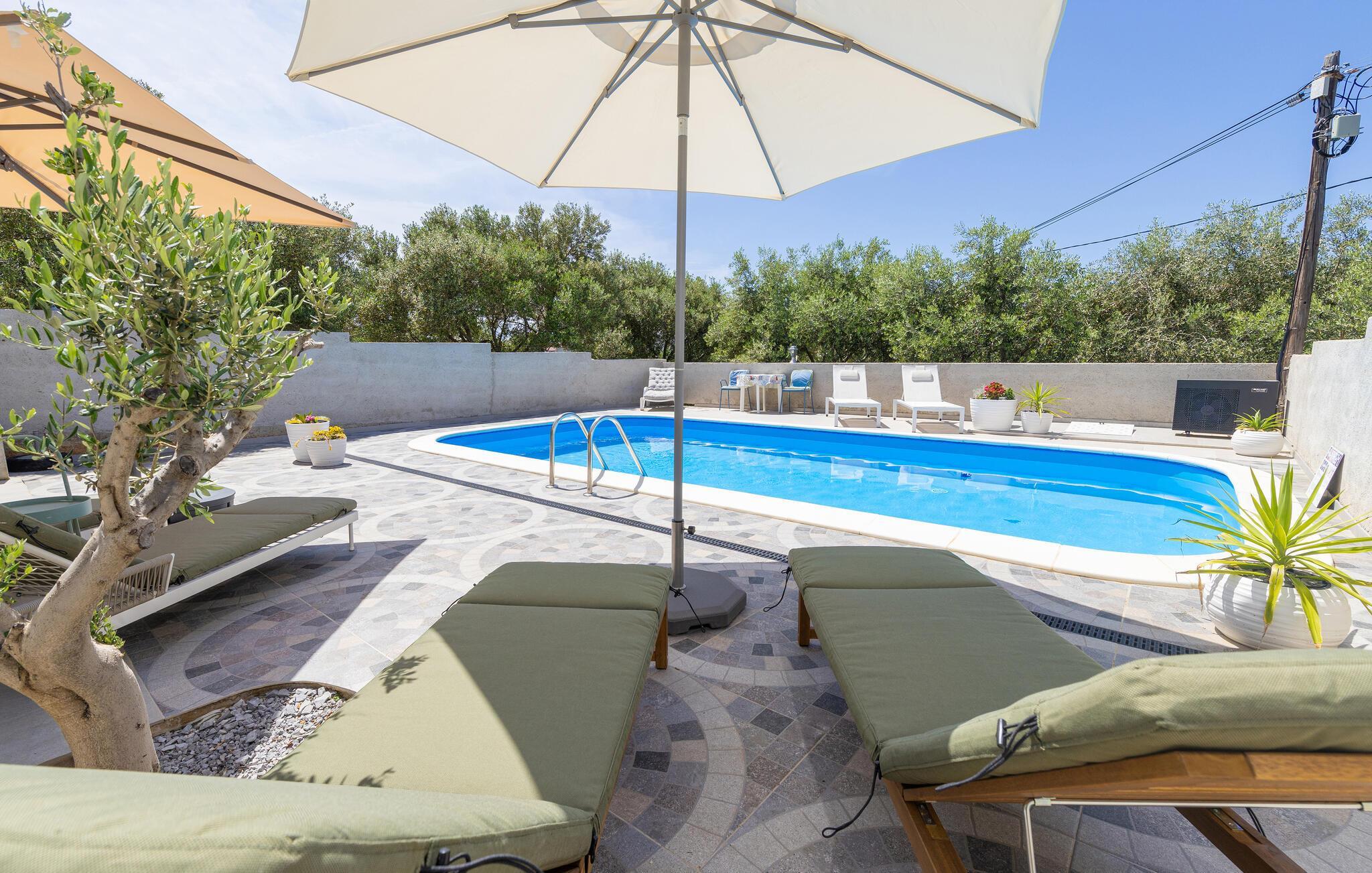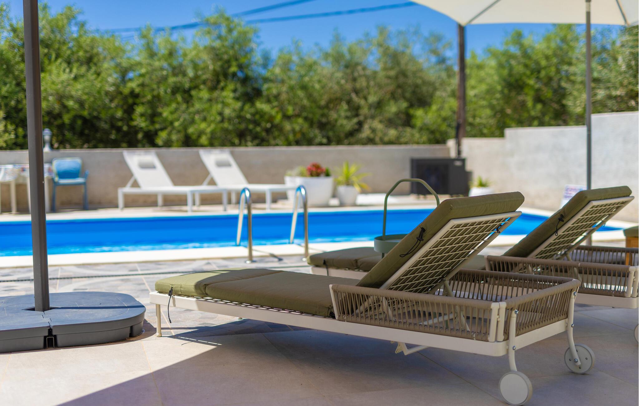 Mehrere Terrassen bieten den idealen Rahmen für schöne Stunden im Freien, genießen Sie den wunderbaren Blick auf das Meer beim ersten Kaffee. Am Haus lädt der gemeinsame eingezäunte Pool zu einem Sprung ins Wasser ein, auf der Gemeinschaftsterrasse können Sie gemütlich grillen.