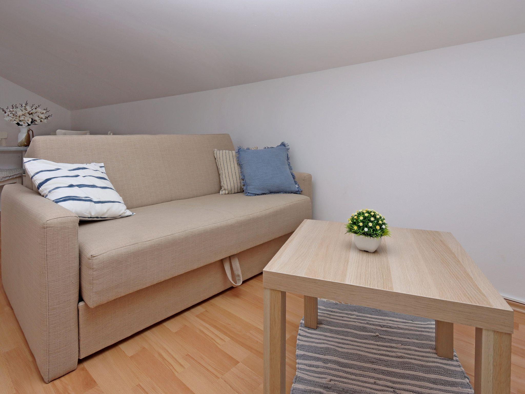 Studio bietet Platz für 4 Gäste. Die Betten sind in Schlafzimmern, die es 1 gibt, innerhalb einer Gesamtfläche von 42m2, angeordnet. Die Gäste haben eine eigene Terrasse zur Verfügung, auf der sie in warmen Sommernächten genießen können. Es ist erlaubt, Speisen auf dem Gemeinschafts-Grill vorzubereiten. In der Unterkunftseinheit besteht die Möglichkeit des Mitbringens von Haustieren gegen Aufpreis. IM PREIS INBEGRIFFEN: Kurtaxe, Endreinigung, Klimatisierung, Parkplatz, Internet, Kinderbett, Bügeleisen, Bügelbrett, Föhn, tragbarer Grill, Liegestühle. VERBINDLICHE ZUSÄTZLICHE KOSTEN: Aufzahlung für Kurzaufenthalte (prozentualer Zuschlag pro Nächtigungsanzahl: 30% - 1, 20% - 2, 10% - 3). UNVERBINDLICHE ZUSÄTZLICHE KOSTEN: Haustiere (8,00 € pro Nacht), Zusatzbett (20,00 € pro Nacht). Die Verfügbarkeit zusätzlicher Dienstleistungen in Ihrem reservierten Termin und die Preise derselben (falls nicht aufgeführt) müssen im Voraus überprüft werden. Zusätzliche Dienstleistungen die in der Zahlungsaufforderung nicht aufgeführt sind werden direkt beim Vermieter bezahlt, angenommen der Gast nutzt auch diese. Ermäßigung auf den Grundpreis: Gratistag 14=13 (bei einem Aufenthalt von 14 Tagen oder mehr erhalten Sie einen Gratistag für den Aufenthalt bis 31.12.26).
