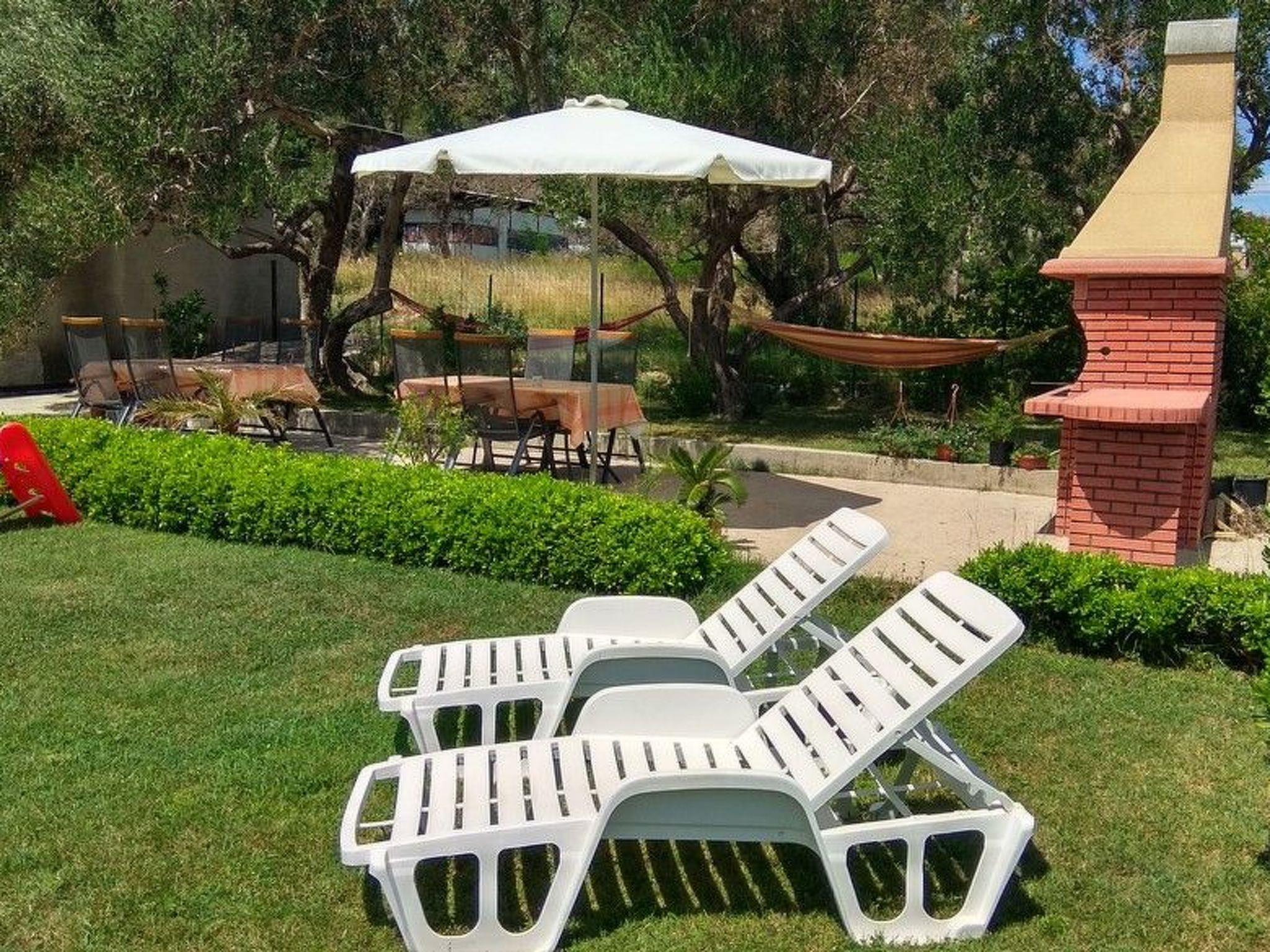 Neben dem Haus gibt es einen Garten und eine große offene Terrasse mit Grill.