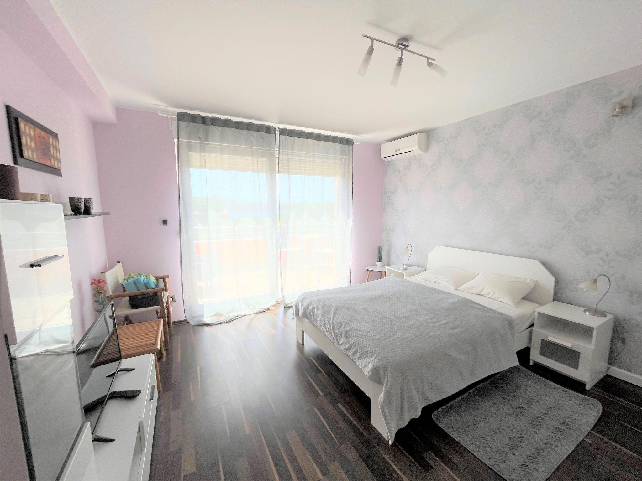 Das offene Erdgeschoss bietet ein Wohnzimmer mit Essbereich und Küche, von wo aus Sie direkten Zugang zum Pool und der überdachten Terrasse haben. Im Esszimmer können Sie auf dem großen Schlafsofa Platz nehmen und den Blick auf den Garten und den Pool genießen, oder sich einfach nur ausruhen und einen Flachbildfernseher anschauen. Ein Schlafzimmer mit Doppelbett und eigenem Bad, sowie ein Gäste-WC befinden sich ebenfalls im Erdgeschoss. Morgens können Sie vom Schlafzimmer im Erdgeschoss aus den direkten Zugang zum Pool nutzen und das Schwimmen direkt vom Bett aus genießen. Im ersten Stock befinden sich 2 Schlafzimmer mit Bad und ein Apartment mit Küche, Wohnzimmer, Schlafzimmer und Bad. Alle Schlafzimmer haben TV und Klimaanlage. Alle Schlafzimmer im ersten Stock sind mit einer offenen Terrasse verbunden, während die Wohnung einen überdachten Balkon mit einer gemütlichen Sitzecke hat, von wo aus sich ein schöner Blick über die Umgebung und das Meer in der Ferne erstreckt.