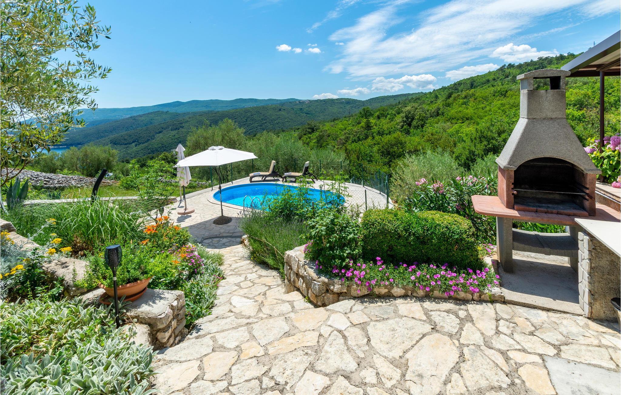 Ansprechendes Ferienhaus mit Pool und Meerblick. Es liegt auf einem Hügel und ist umgeben von Olivenbäumen und mediterranen Pflanzen. Es befindet sich im touristischen Zentrum von Rabac, das für seine wunderschönen Badestrände und kristallklares Wasser bekannt ist. Das Ferienhaus verfügt über verschiedene Terrassen, von denen Sie beim Morgenkaffe den Blick auf das Meer genießen können. Am Abend erleben Sie romantische Sonnenuntergänge und entspannen Sie am Pool. Auch die Zubereitung Ihrer Lieblingsgerichte auf dem Grill wird Ihnen hier eine Freude bereiten. Da das Haus auf hügeligem Gelände liegt, empfiehlt es sich zum Stand mit dem Auto zu fahren. In nur 10 Minuten Autofahrt erreichen Sie die Altstadt von Labin, mit ihren kleinen Galerien oder unternehmen Sie einen Tagesausflug mit dem Boot auf die umliegenden Inseln.