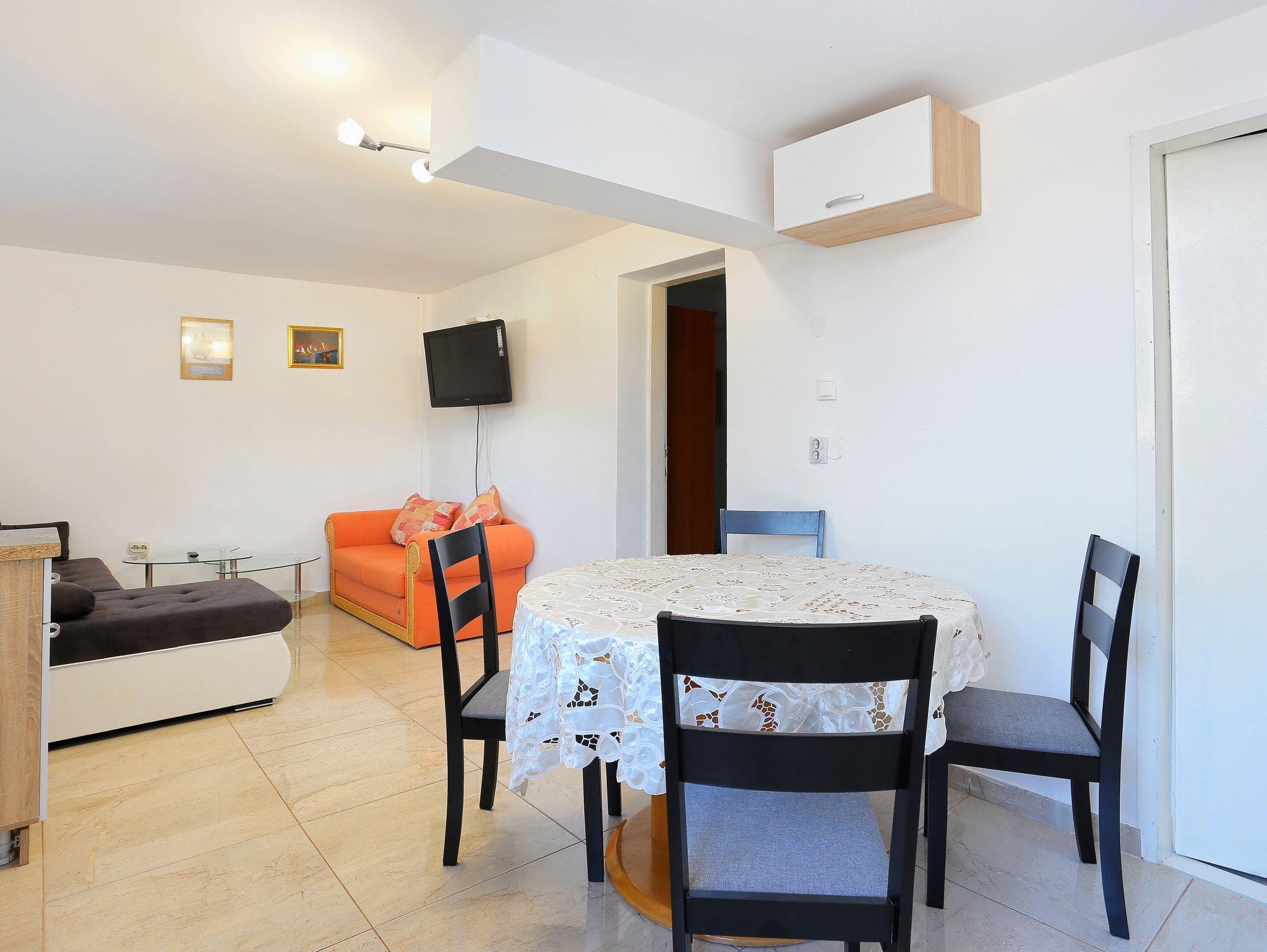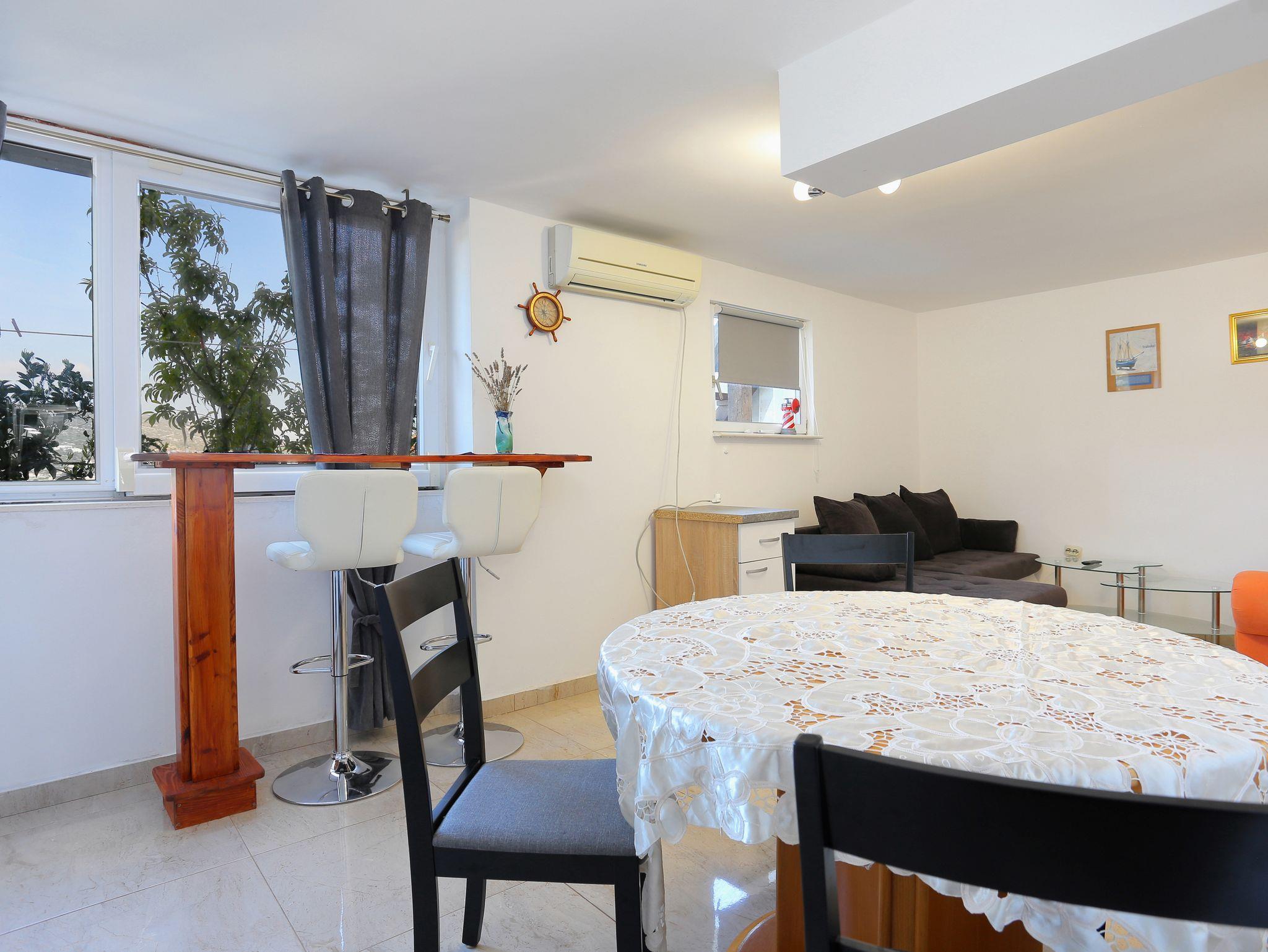 Ferienwohnung bietet Platz für 5 Gäste. Die Betten sind in Schlafzimmern, die es 2 gibt, und in Wohnzimmer, innerhalb einer Gesamtfläche von 54m2, angeordnet. Die Gäste haben eine eigene Terrasse zur Verfügung, auf der sie in warmen Sommernächten genießen können. Das Apartment bietet Meerblick. Es ist erlaubt, Speisen auf dem Gemeinschafts-Grill vorzubereiten. Durch die Terrasse der gebuchten Unterkunftseinheit gehen auch andere Gäste oder Vermieter. IM PREIS INBEGRIFFEN: Kurtaxe, Endreinigung, Klimatisierung, Parkplatz, Internet, Bügeleisen, Föhn, Sonnenschirm, Liegestühle. VERBINDLICHE ZUSÄTZLICHE KOSTEN: Aufzahlung für Kurzaufenthalte (prozentualer Zuschlag pro Nächtigungsanzahl: 30% - 1, 20% - 2, 10% - 3). Die Verfügbarkeit zusätzlicher Dienstleistungen in Ihrem reservierten Termin und die Preise derselben (falls nicht aufgeführt) müssen im Voraus überprüft werden. Zusätzliche Dienstleistungen die in der Zahlungsaufforderung nicht aufgeführt sind werden direkt beim Vermieter bezahlt, angenommen der Gast nutzt auch diese.