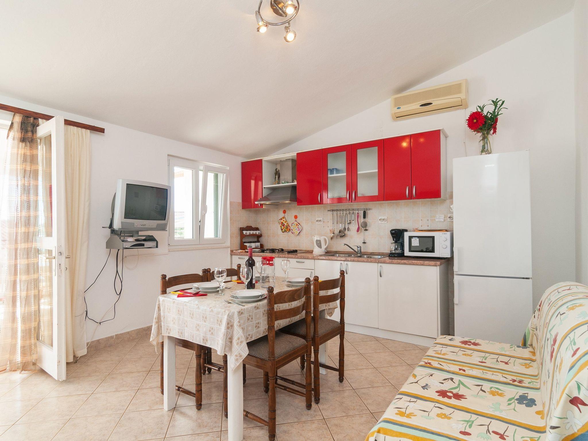Ferienwohnung bietet Platz für 4 Gäste. Die Betten sind in Schlafzimmern, die es 2 gibt, innerhalb einer Gesamtfläche von 44m2, angeordnet. Die Gäste haben eine eigene Terrasse zur Verfügung, auf der sie in warmen Sommernächten genießen können. Das Apartment bietet Meerblick. Es ist erlaubt, Speisen auf dem Gemeinschafts-Grill vorzubereiten. In der Unterkunftseinheit besteht die Möglichkeit des Mitbringens von Haustieren gegen Aufpreis. IM PREIS INBEGRIFFEN: Kurtaxe, Endreinigung, Parkplatz, Internet, Bootsanlegeplatz, Kinderbett, Bügeleisen, Bügelbrett, Föhn. UNVERBINDLICHE ZUSÄTZLICHE KOSTEN: Klimatisierung (5,00 € pro Nacht), Wäschewaschen (5,00 € Waschen), Haustiere (5,00 € pro Nacht). Die Verfügbarkeit zusätzlicher Dienstleistungen in Ihrem reservierten Termin und die Preise derselben (falls nicht aufgeführt) müssen im Voraus überprüft werden. Zusätzliche Dienstleistungen die in der Zahlungsaufforderung nicht aufgeführt sind werden direkt beim Vermieter bezahlt, angenommen der Gast nutzt auch diese. Ermäßigung auf den Grundpreis: Gratistag 14=13 (bei einem Aufenthalt von 14 Tagen oder mehr erhalten Sie einen Gratistag für den Aufenthalt bis 31.12.26).