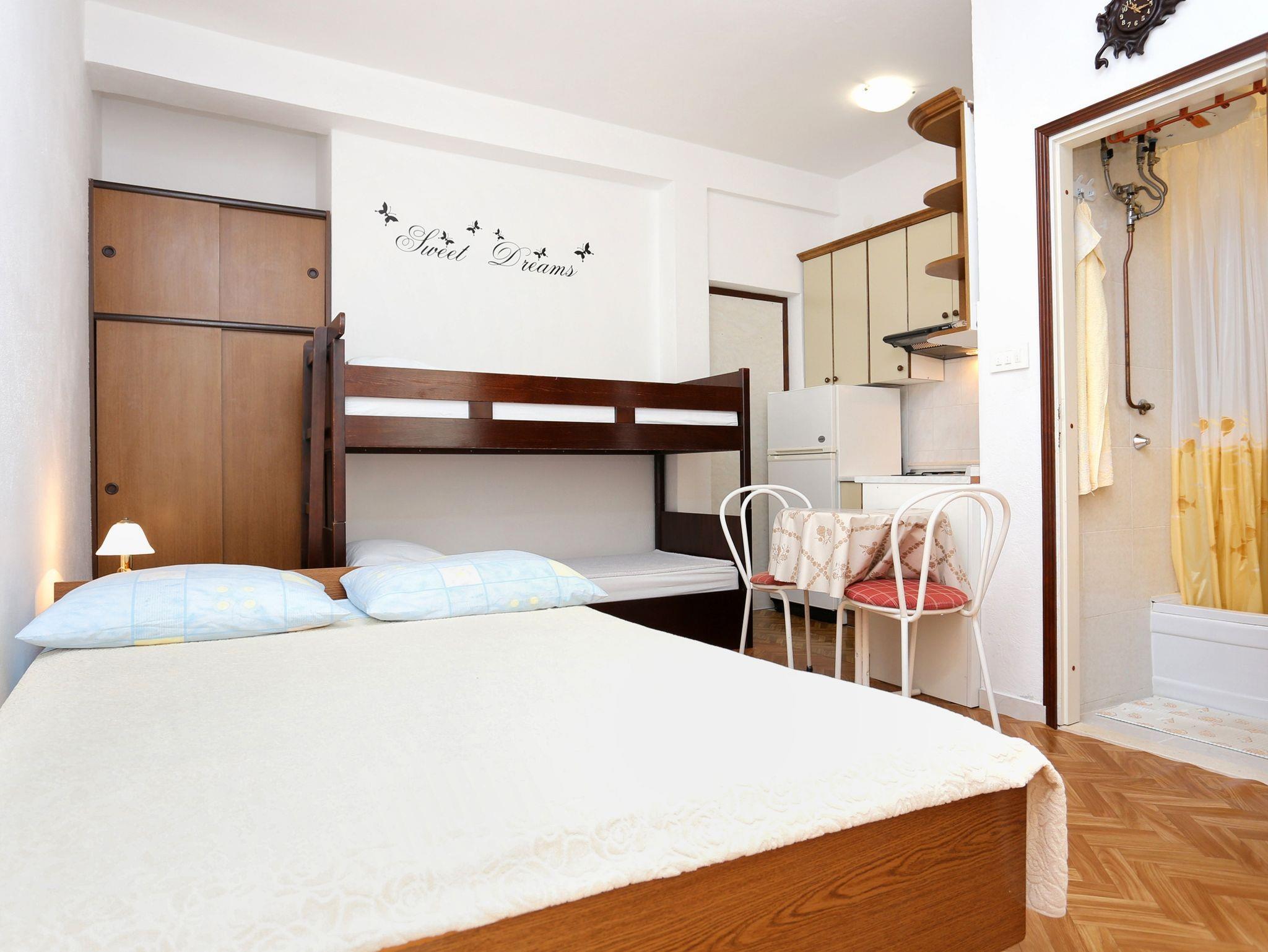 Studio bietet Platz für 4 Gäste. Die Betten sind in Schlafzimmern, die es 1 gibt, innerhalb einer Gesamtfläche von 17m2, angeordnet. Die Gäste haben eine eigene Terrasse zur Verfügung, auf der sie in warmen Sommernächten genießen können. Das Studio-Apartment bietet Meerblick. Es ist erlaubt, Speisen auf dem Gemeinschafts-Grill vorzubereiten. IM PREIS INBEGRIFFEN: Kurtaxe, Endreinigung, Parkplatz, Internet, Bootsanlegeplatz. VERBINDLICHE ZUSÄTZLICHE KOSTEN: Aufzahlung für Kurzaufenthalte (prozentualer Zuschlag pro Nächtigungsanzahl: 30% - 1, 20% - 2, 10% - 3). UNVERBINDLICHE ZUSÄTZLICHE KOSTEN: Klimatisierung (10,00 € pro Nacht), Wäschewaschen (5,00 € Waschen). Die Verfügbarkeit zusätzlicher Dienstleistungen in Ihrem reservierten Termin und die Preise derselben (falls nicht aufgeführt) müssen im Voraus überprüft werden. Zusätzliche Dienstleistungen die in der Zahlungsaufforderung nicht aufgeführt sind werden direkt beim Vermieter bezahlt, angenommen der Gast nutzt auch diese.