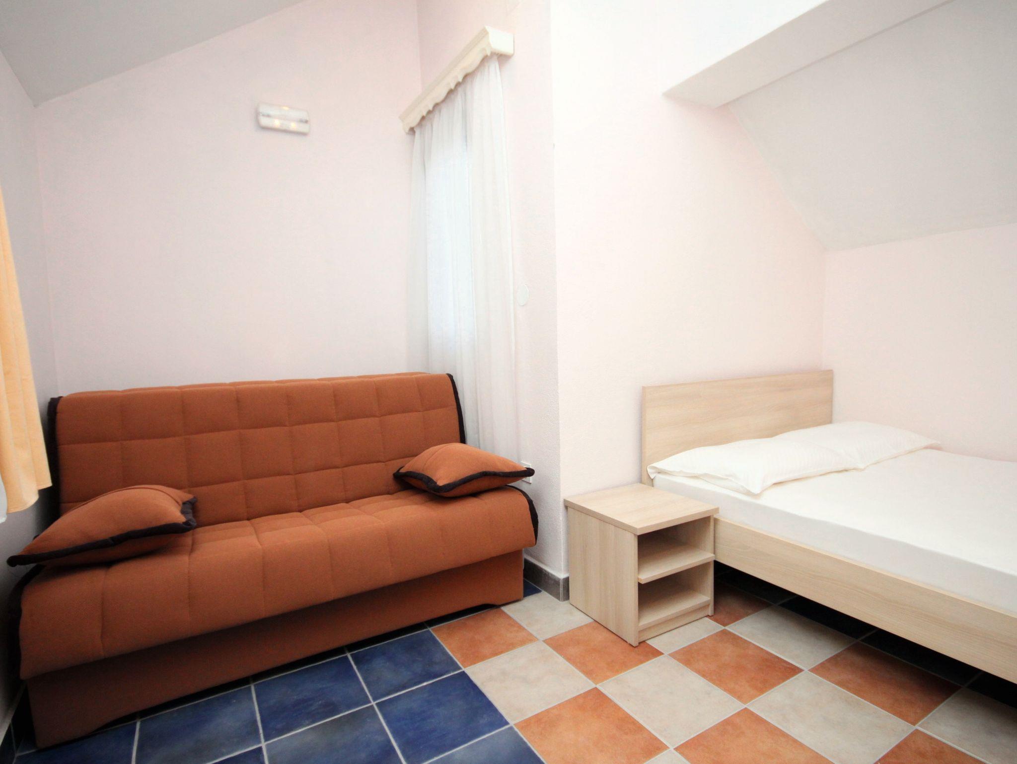 Ferienwohnung bietet Platz für 5 Gäste. Die Betten sind in Schlafzimmern, die es 2 gibt, innerhalb einer Gesamtfläche von 31m2, angeordnet. Die Gäste haben eine eigene Terrasse zur Verfügung, auf der sie in warmen Sommernächten genießen können. Das Apartment bietet Meerblick. Es ist erlaubt, Speisen auf dem Gemeinschafts-Grill vorzubereiten. In der Unterkunftseinheit besteht die Möglichkeit des Mitbringens von Haustieren gegen Aufpreis. In der gebuchten Unterkunftseinheit zahlt man am Ort ein Depositum ( der Preis ist an der Internetseite angeführt ). IM PREIS INBEGRIFFEN: Kurtaxe, Endreinigung, Parkplatz, Internet, Kinderbett, Föhn. VERBINDLICHE ZUSÄTZLICHE KOSTEN: Kaution (100,00 € Einmalzahlung), Aufzahlung für Kurzaufenthalte (prozentualer Zuschlag pro Nächtigungsanzahl: 30% - 1, 20% - 2, 10% - 3). UNVERBINDLICHE ZUSÄTZLICHE KOSTEN: Wäschewaschen (5,00 € Waschen), Bootsanlegeplatz (25,00 € pro Nacht), Haustiere (20,00 € pro Nacht). Die Verfügbarkeit zusätzlicher Dienstleistungen in Ihrem reservierten Termin und die Preise derselben (falls nicht aufgeführt) müssen im Voraus überprüft werden. Zusätzliche Dienstleistungen die in der Zahlungsaufforderung nicht aufgeführt sind werden direkt beim Vermieter bezahlt, angenommen der Gast nutzt auch diese.