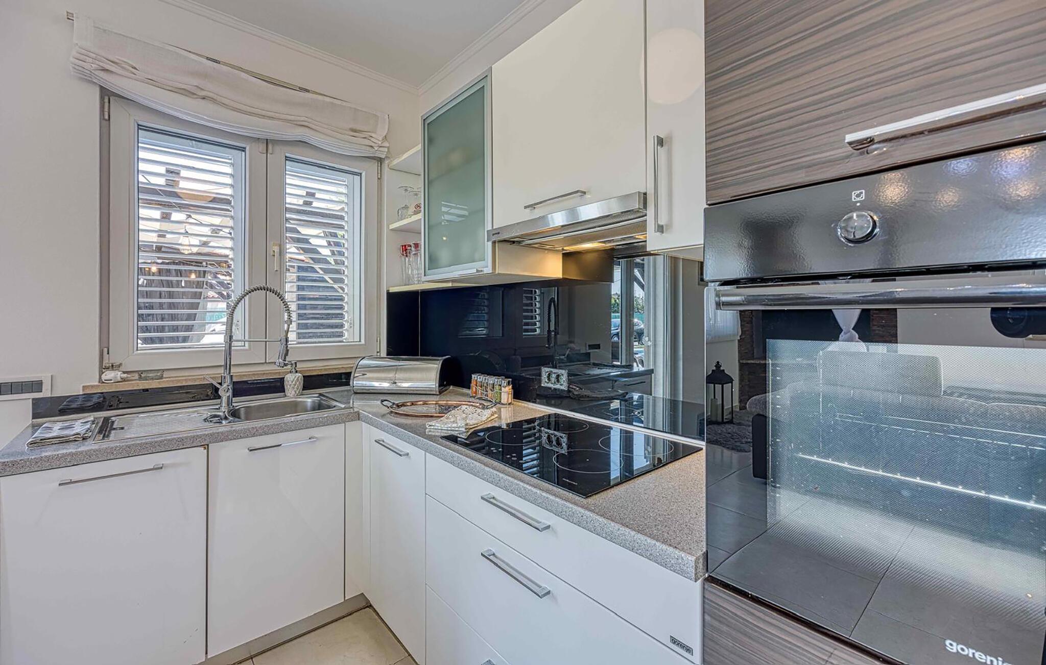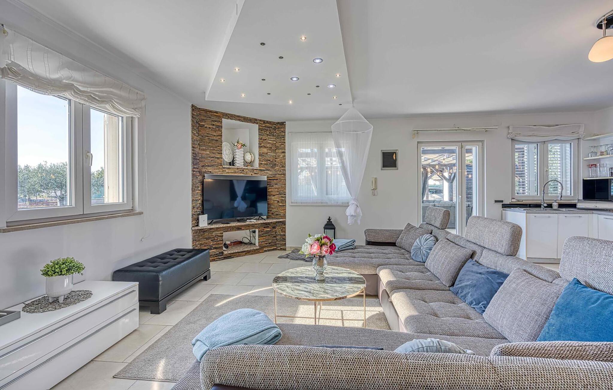 In diesem großzügigen Haus vereinen sich Komfort und Eleganz auf harmonische Weise. Dezente Farben, Natursteinelemente und ein interessantes Lichtdesign schaffen eine Atmosphäre, in der Sie sich schnell zu Hause fühlen. Entspannen Sie sich auf der bequemen Sofalandschaft bei einem gemeinsamen Filmabend oder bereiten Sie sich in der Küche eine frische Mahlzeit zu. Mit einem Glas guten kroatischem Wein schmeckt diese besonders lecker.
