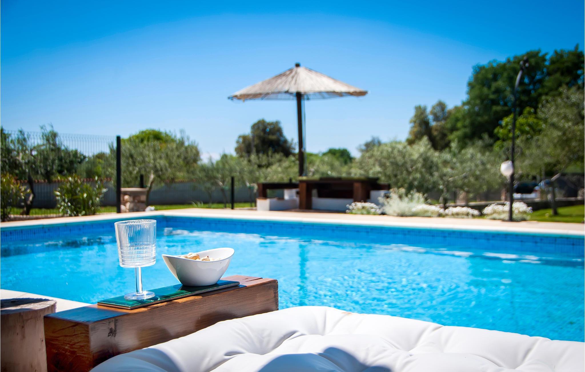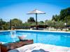 Schönes Ferienhaus mit Pool umgeben von viel Grün.