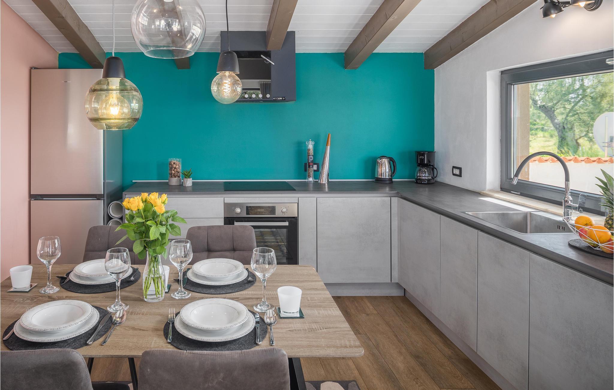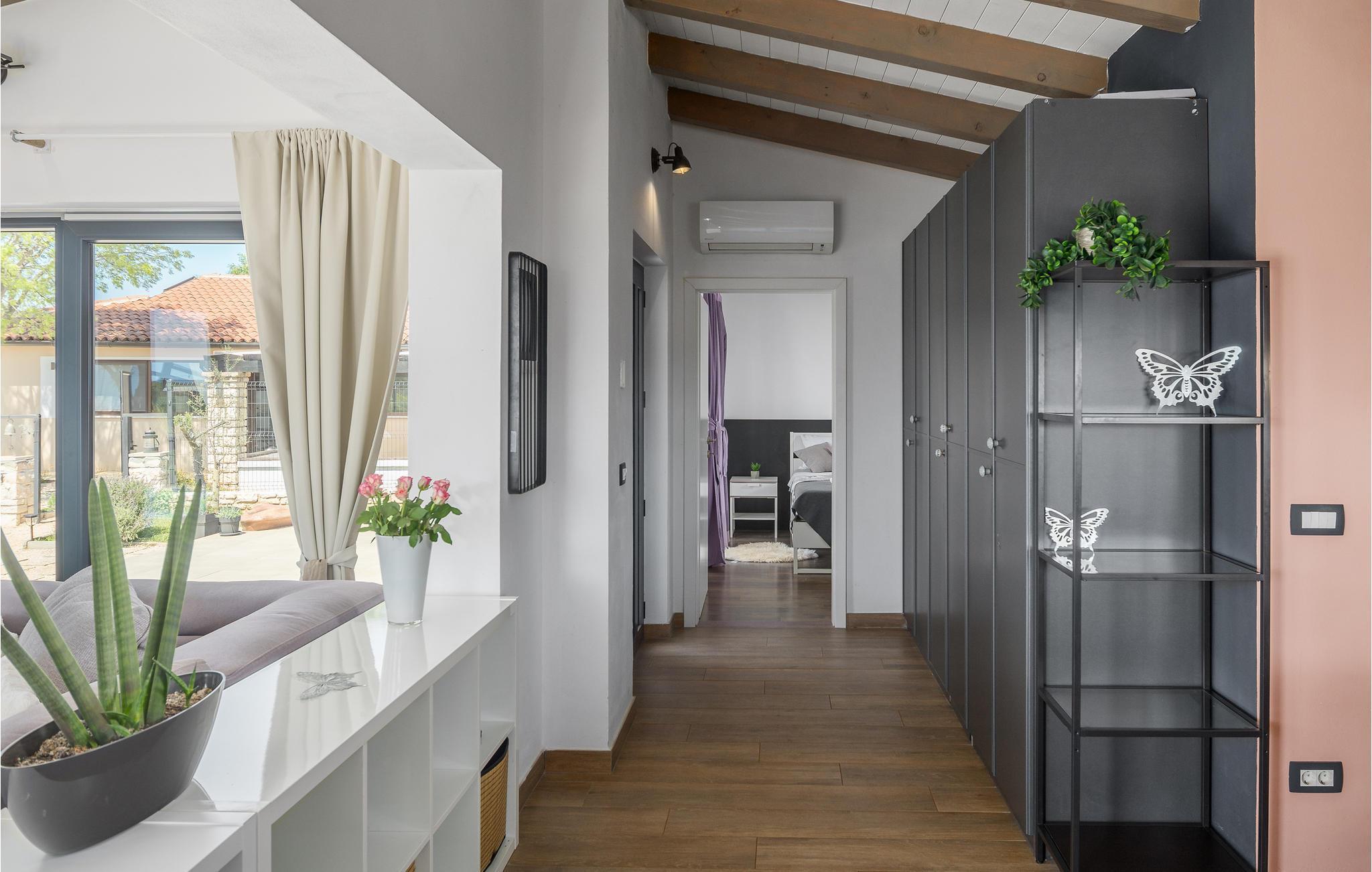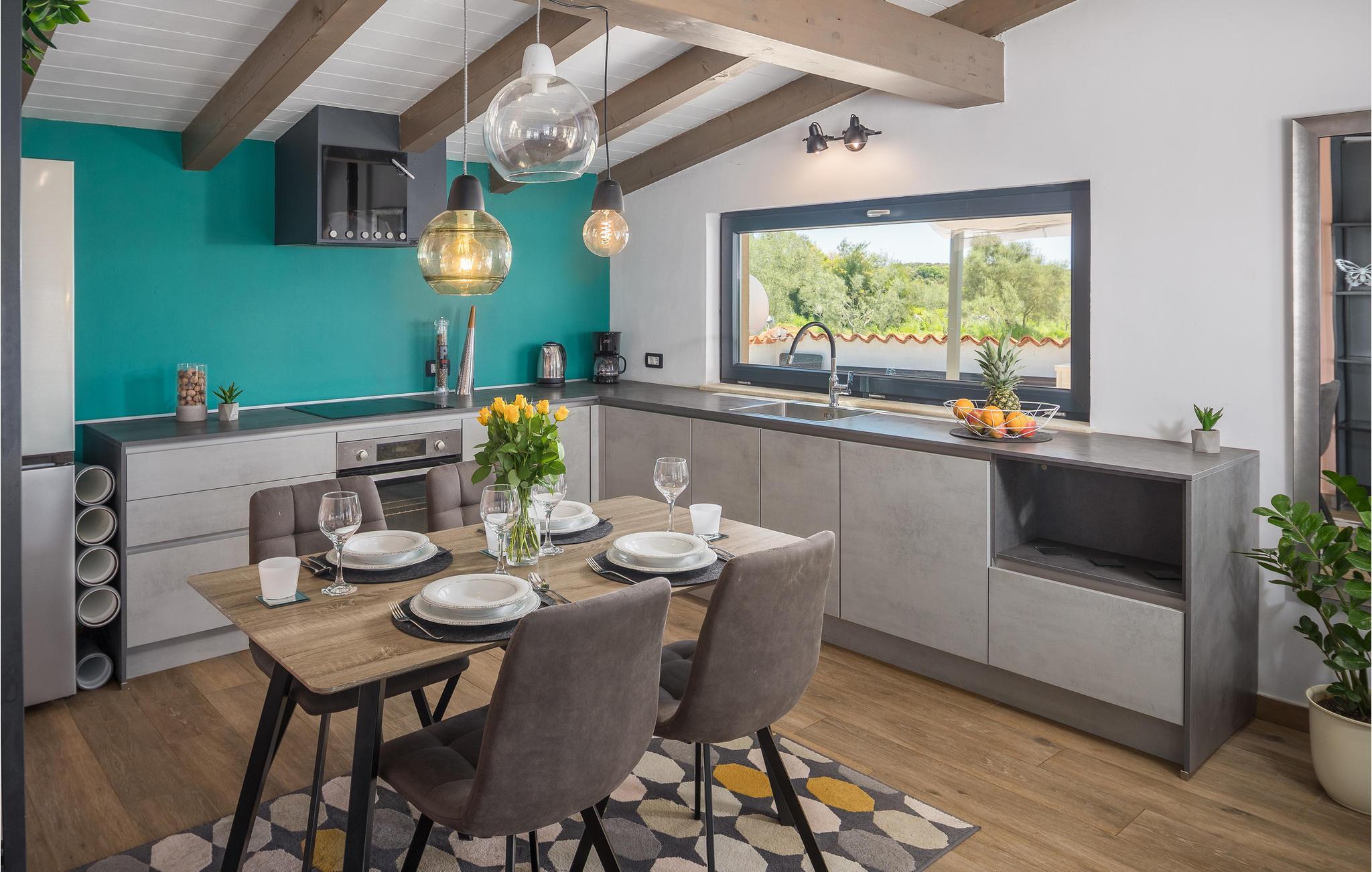 Das Herz des Hauses ist der Wohnbereich mit offener Küche, von dem Sie einen Ausblick auf den Poolbereich haben. Bereiten Sie zusammen in der modernen Küche die Mahlzeiten des Urlaubs zu oder entspannen Sie auf dem großen Sofa bei einem Filmabend. Ihnen steht außerdem ein Schlafzimmer mit Doppelbett zur Verfügung.