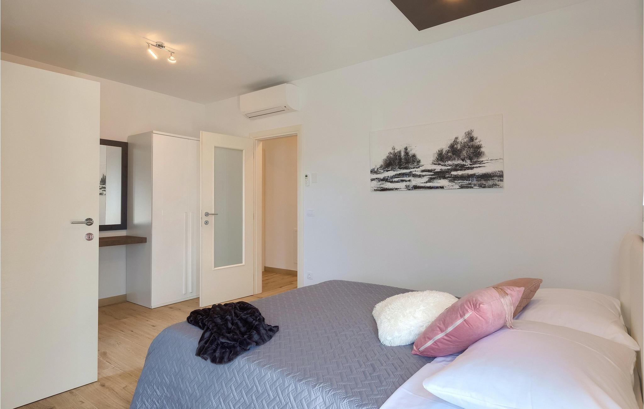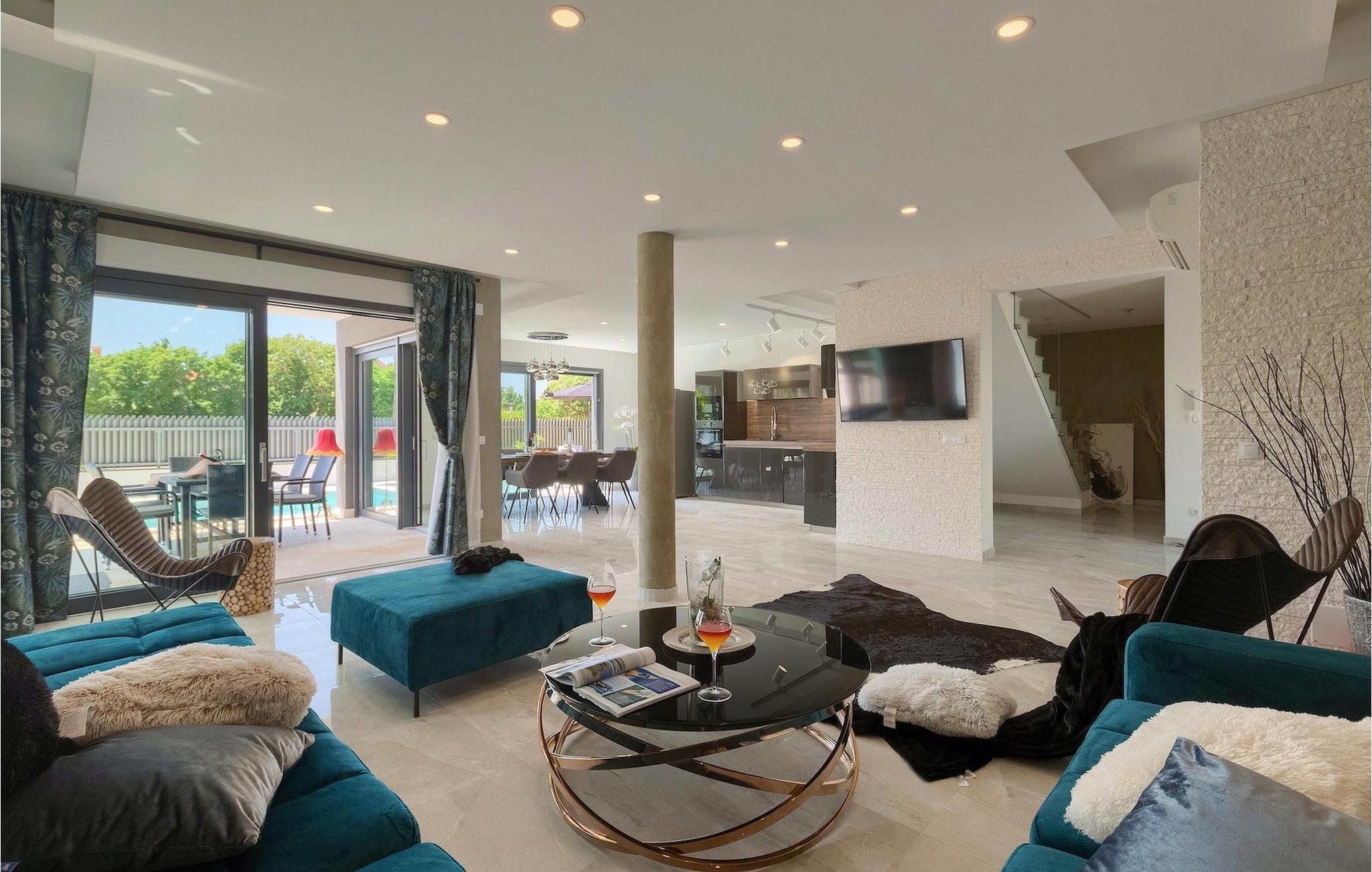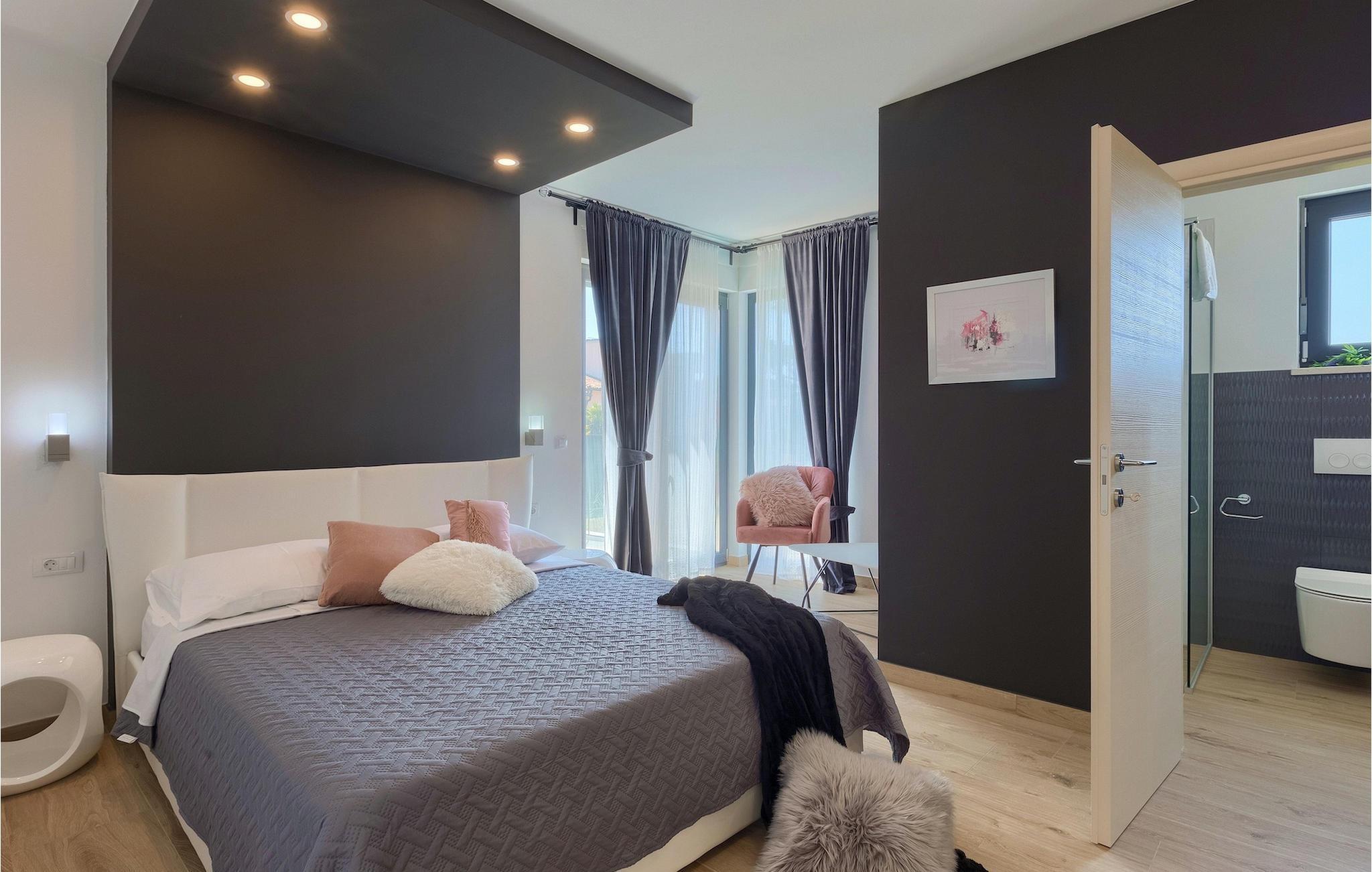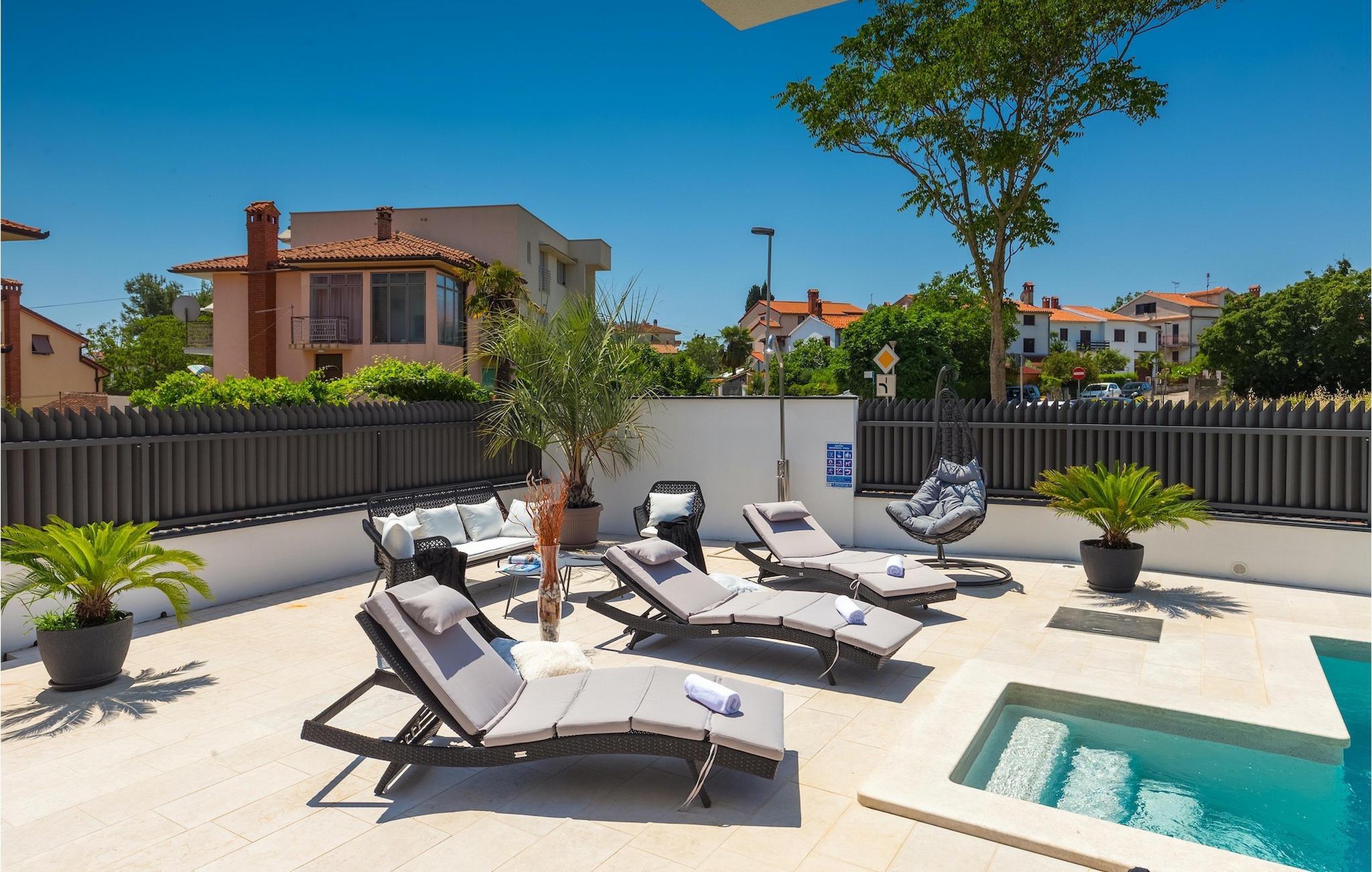 Träumen Sie von einem erholsamen Urlaub in einer Designer-Villa in der Nähe von einer touristischen Stadt und wunderschönen Stränden? Dann ist Villa Orion perfekt für Sie! Diese schöne, moderne Villa bietet nicht nur ein exklusives Interieur an, sondern auch reichliche zusätzliche Aktivitäten zum Erholen wie die finnische Sauna oder der Jacuzzi im Wellnessbereich im Erdgeschoss der Villa. Hier befindet sich auch das in blau gestyltes Wohnzimmer im offenen Konzept verbunden mit Speisezimmer und einer modernen, komplett ausgestatteten Küche. Während Sie gemeinsam Essen können Sie den einladenden Pool betrachten, der nur ein paar Schritte weiter ist. Natürlich können Sie aber auch draußen im Offenen essen und den Grill benutzen. Der Außenbereich bietet auch viel Gartenmöbel und Sonnenliegen an, zum Entspannen am privaten Pool der Erfrischung bietet. Im ersten Stock befinden sich die liebevoll eingerichtete Schlafzimmer mit eleganten Details wie zeitgenössischen Gemälden und wunderbaren Farbkombinationen. Dazu kommen noch private Badezimmer für jedes Schlafzimmer. Aus zwei Schlafzimmern kommen Sie zum Balkon, ideal für den ersten Kaffee. Villa Orion wird Sie mit Ihrem atemberaubenden Interieur und guten Erholungsmöglichkeiten verwöhnen, das alles während Sie in der Nähe vom Strand und dem Stadt Rovinj Ihren Urlaub genießen!