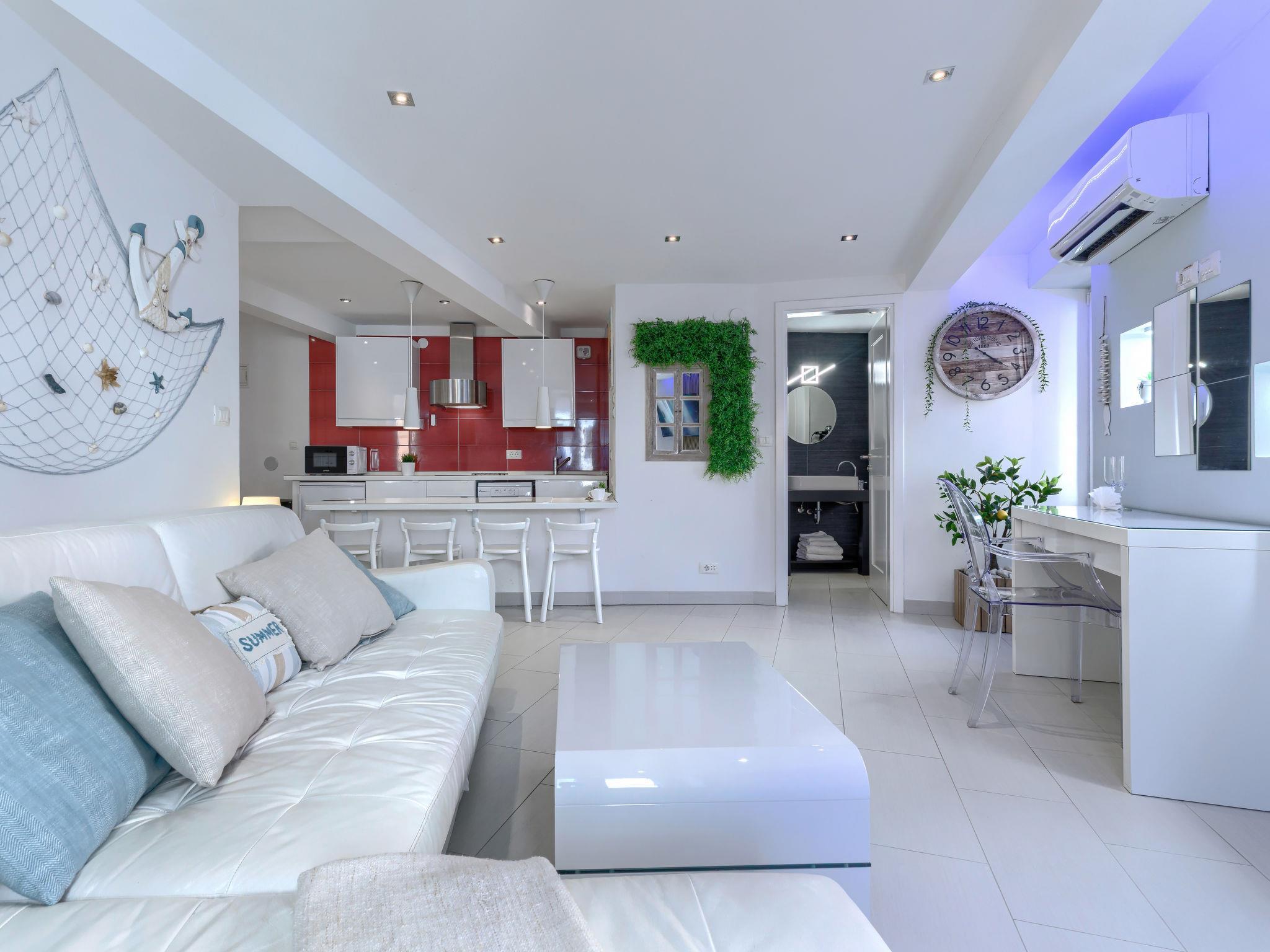 "Ambient", 2-Zimmer-Wohnung 45 m2 im 1. Stock. Hell, modern und geschmackvoll eingerichtet: Wohn-/Esszimmer mit 1 Doppeldiwanbett (160 cm, Länge 200 cm), Kabel-TV und Klimaanlage. 1 Zimmer mit 1 franz. Bett (160 cm, Länge 200 cm), Kabel-TV. Offene Küche (Geschirrspüler, 2 Glaskeramikplatten, Toaster, Wasserkocher, Mikrowelle, elektrische Kaffeemaschine). Bad/WC mit Eckbadewanne. Warmluftheizung. Zur Verfügung: Waschmaschine, Safe, Bügeleisen, Haartrockner. Internet (WLAN, gratis). 1 kleines Haustier/Hund erlaubt.