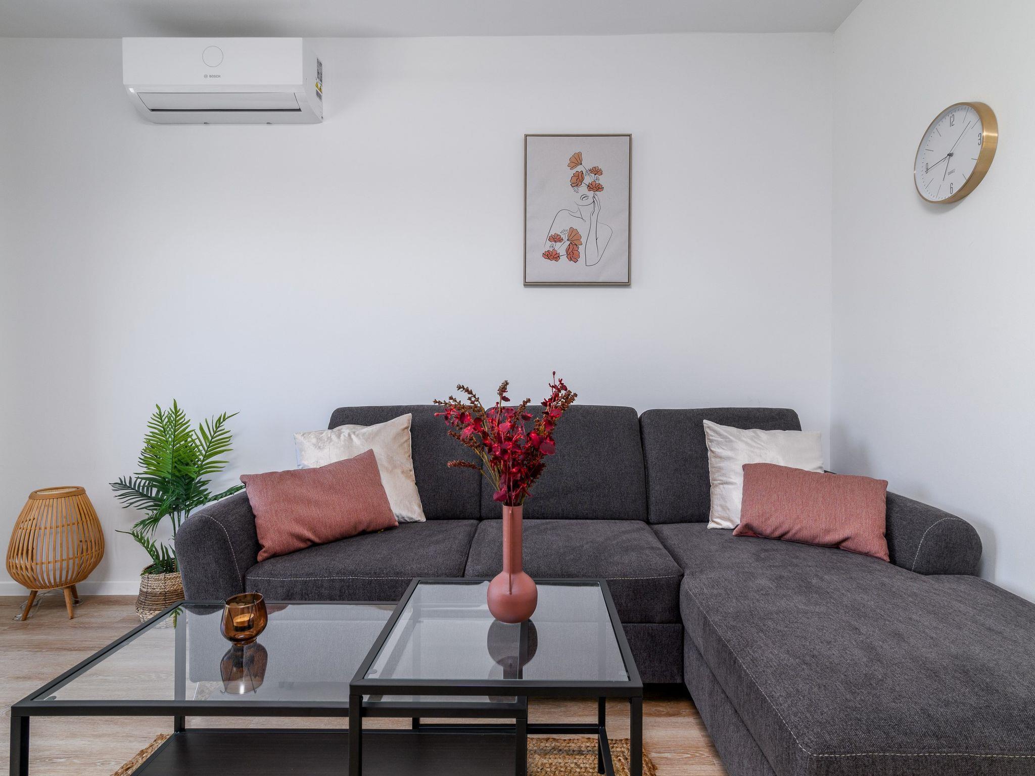 "Prinz", 2-Zimmer-Wohnung 30 m2, im Obergeschoss. Einfach und gemütlich eingerichtet: Wohn-/Esszimmer 18 m2 mit 1 Doppeldiwanbett (160 cm, Länge 200 cm), Sat-TV und Klimaanlage. Ausgang zur Terrasse. 1 Zimmer mit 1 franz. Bett (160 cm, Länge 200 cm). Kleine, offene Küche (2 Glaskeramikplatten, Wasserkocher, Mikrowelle). Dusche/WC. Warmluftheizung. Terrassenmöbel. Zur Verfügung: Safe, Fliegengitter. Internet (Wireless LAN, gratis). Parkplatz (1 Auto). Bitte beachten: Kühlschrank ohne Gefrierfach. 1 kleines Haustier/Hund erlaubt. Terrasse (45 m2) wird mit den Gästen aus der Wohnung HR2500.500.6 geteilt.