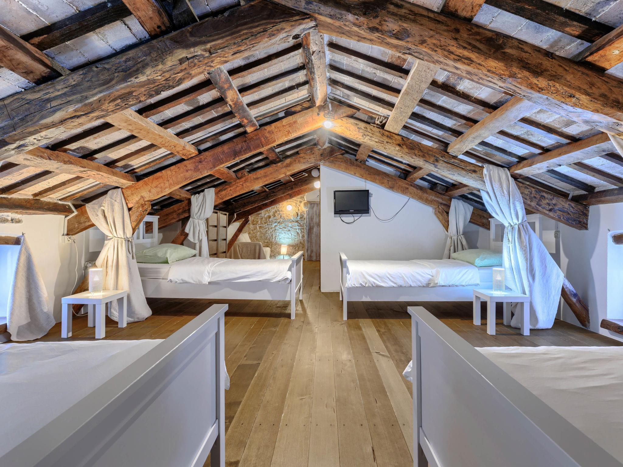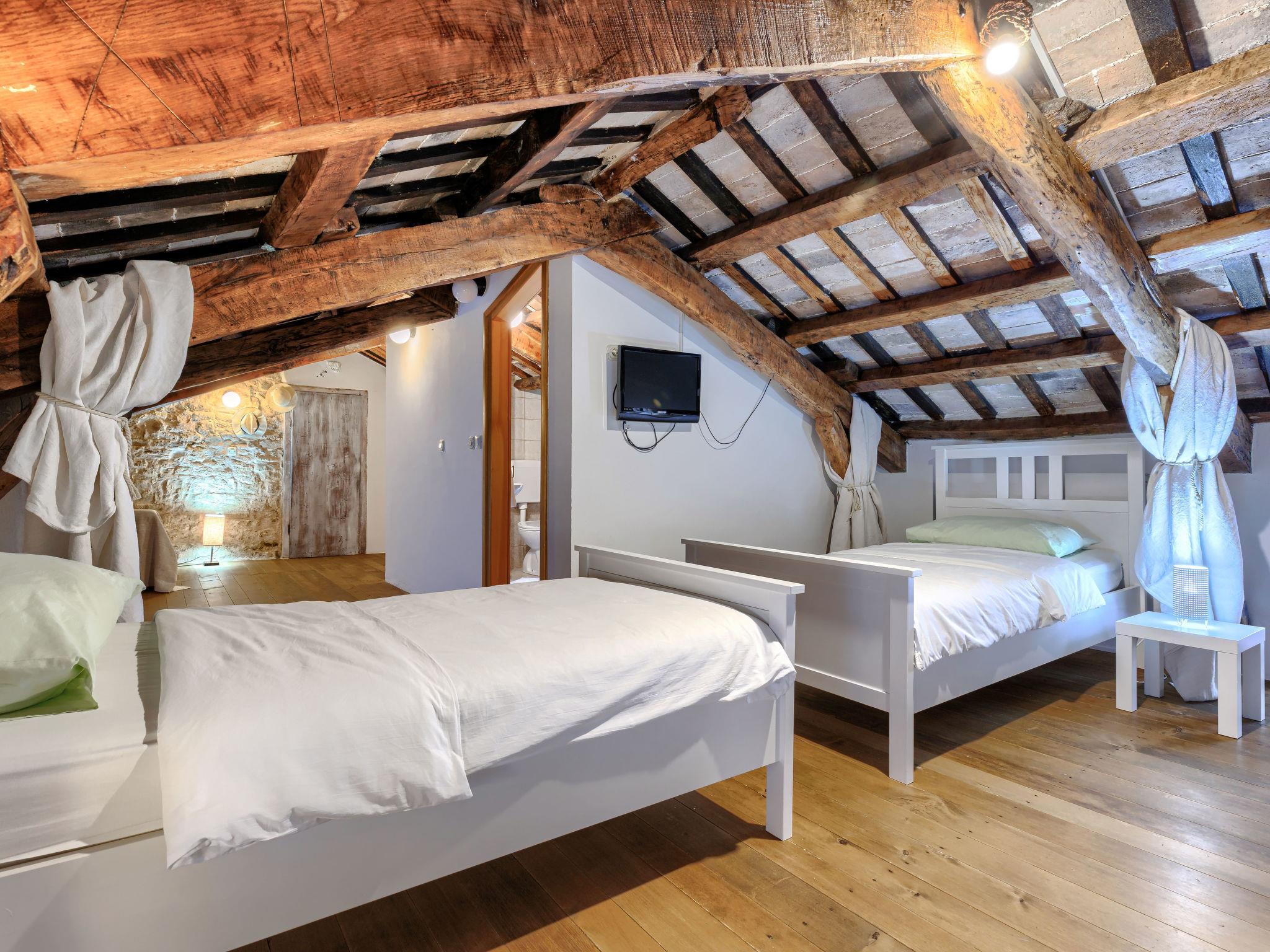 4-Zimmer-Haus 140 m2 auf 3 Stockwerken. Wohn-/Esszimmer mit offenem Kamin und Sat-TV (Flachbildschirm), Klimaanlage. Offene Küche (4 Kochplatten, Backofen, Geschirrspüler, Toaster, Mikrowelle, elektrische Kaffeemaschine). 2 sep. WC's. Obergeschoss: 1 Zimmer mit 1 Bett, 1 Doppelbett, Dusche/WC und Klimaanlage. 1 Zimmer mit 1 Doppelbett, Dusche/WC und Klimaanlage. Dachgeschoss: 1 abgeschrägtes Zimmer mit 4 Betten, Dusche/WC und Klimaanlage. Terrasse 30 m2, überdacht. Terrassenmöbel, Gartengrill (mobil), Liegestühle. Zur Verfügung: Waschmaschine. Internet (WLAN, gratis). Bitte beachten: Nichtraucher-Haus. Maximal 2 Haustiere/Hunde erlaubt. UP/I-335-03/24-01/1081