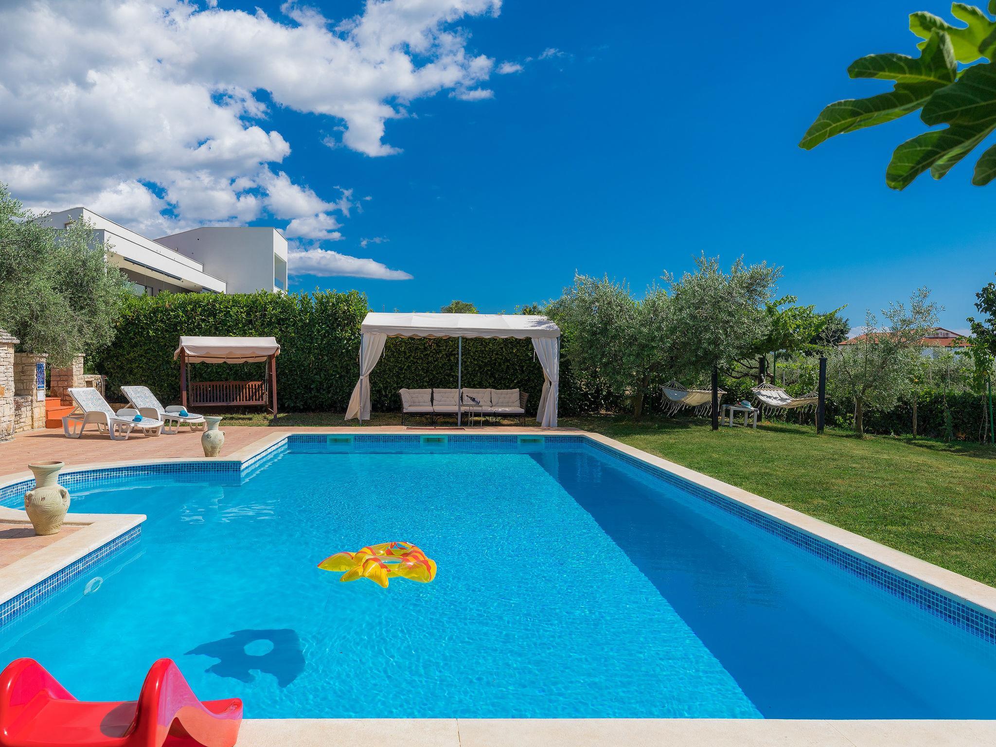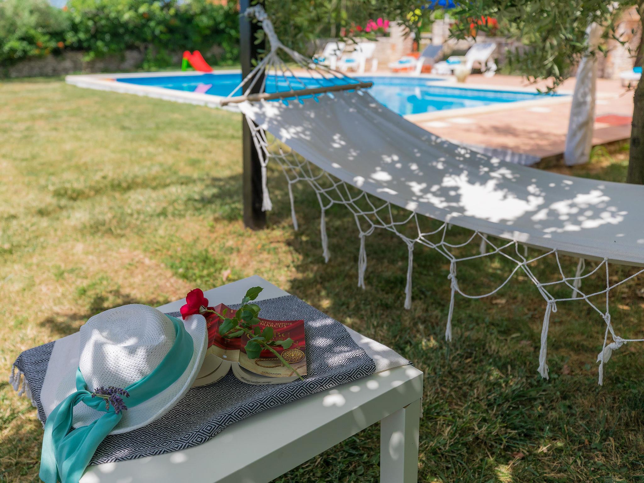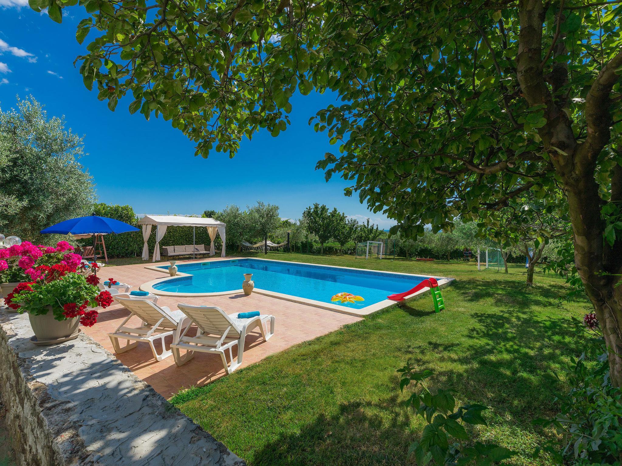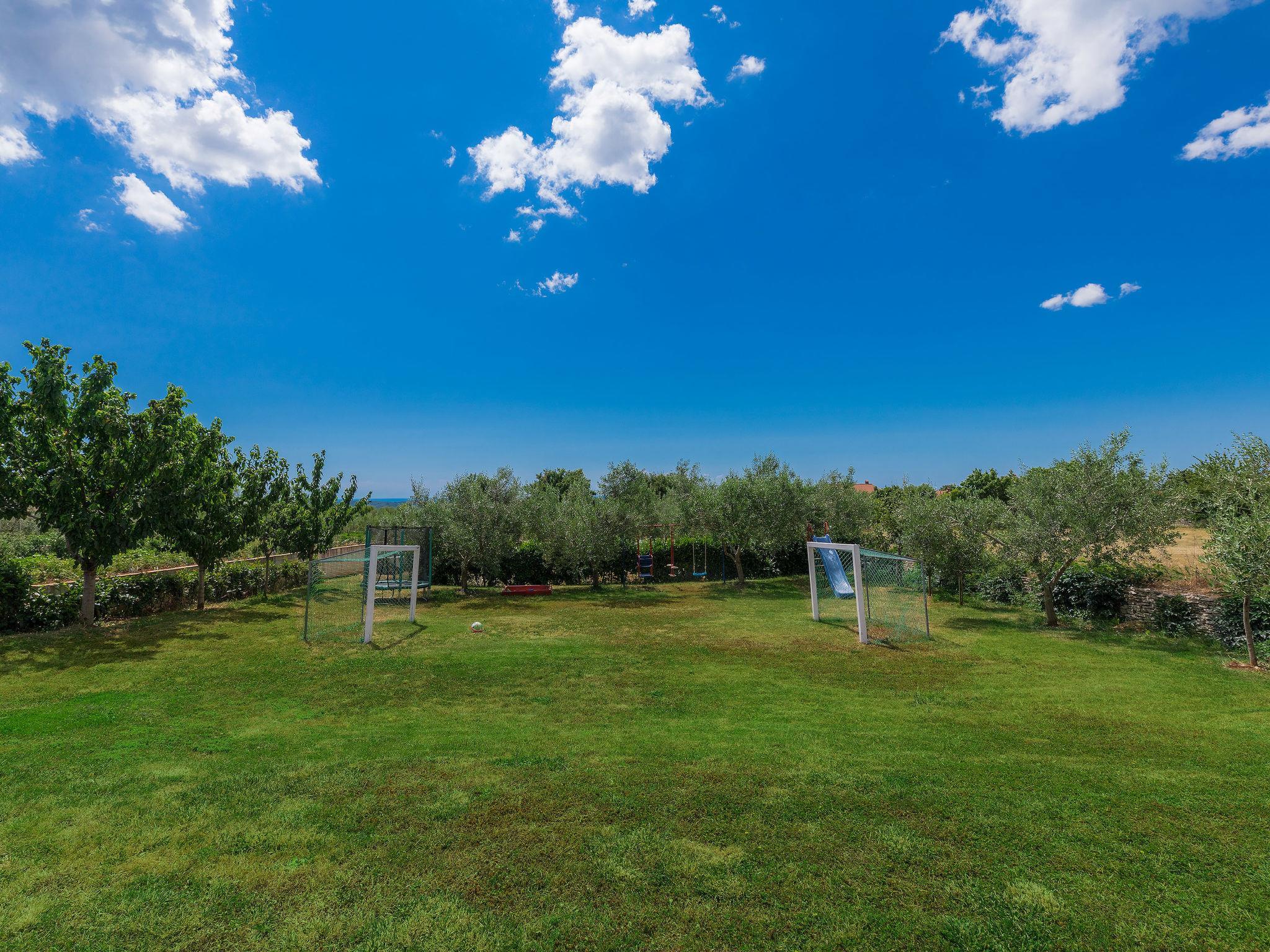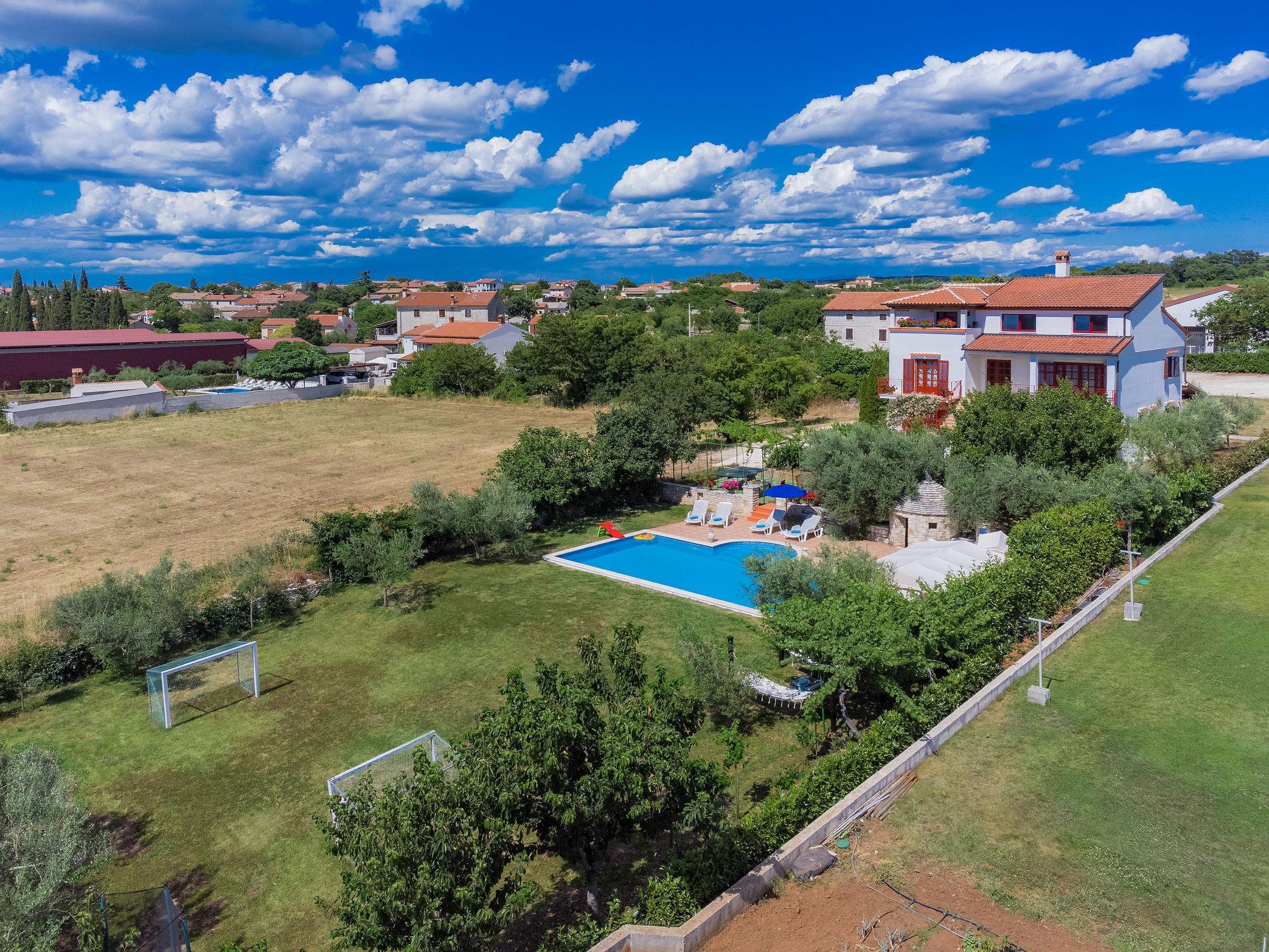 Mehrfamilienhaus "Ivan & Tina". 500 m vom Zentrum von Kanfanar, 17 km vom Zentrum von Rovinj, 17 km vom Meer. Zur Mitbenutzung: Grundstück 3'000 m2 mit Rasen und Bäumen, Schwimmbad eckig (10 x 5 m, 135 cm tief, saisonale Verfügbarkeit: 23.Mai. - 26.Sep.) mit Innentreppe. Aussendusche, Tischtennis, Boccia, Volleyball, Badminton, Laube, Terrasse, Gartenmöbel, Grill (Rutschbahn, Schaukel, Sandkasten). Im Hause: Internetzugang, Tischfussball, Trampolin, Einstellraum für Fahrräder. Parkplatz auf dem Grundstück. Einkaufsgeschäft 400 m, Bushaltestelle 600 m, Kieselstrand 17 km. Nahe gelegene Sehenswürdigkeiten: Lim valley 6 km. Der Besitzer organisiert Angeltouren und Bootsausflüge und vermietet ein Boot (Bezahlung und Absprache vor Ort).