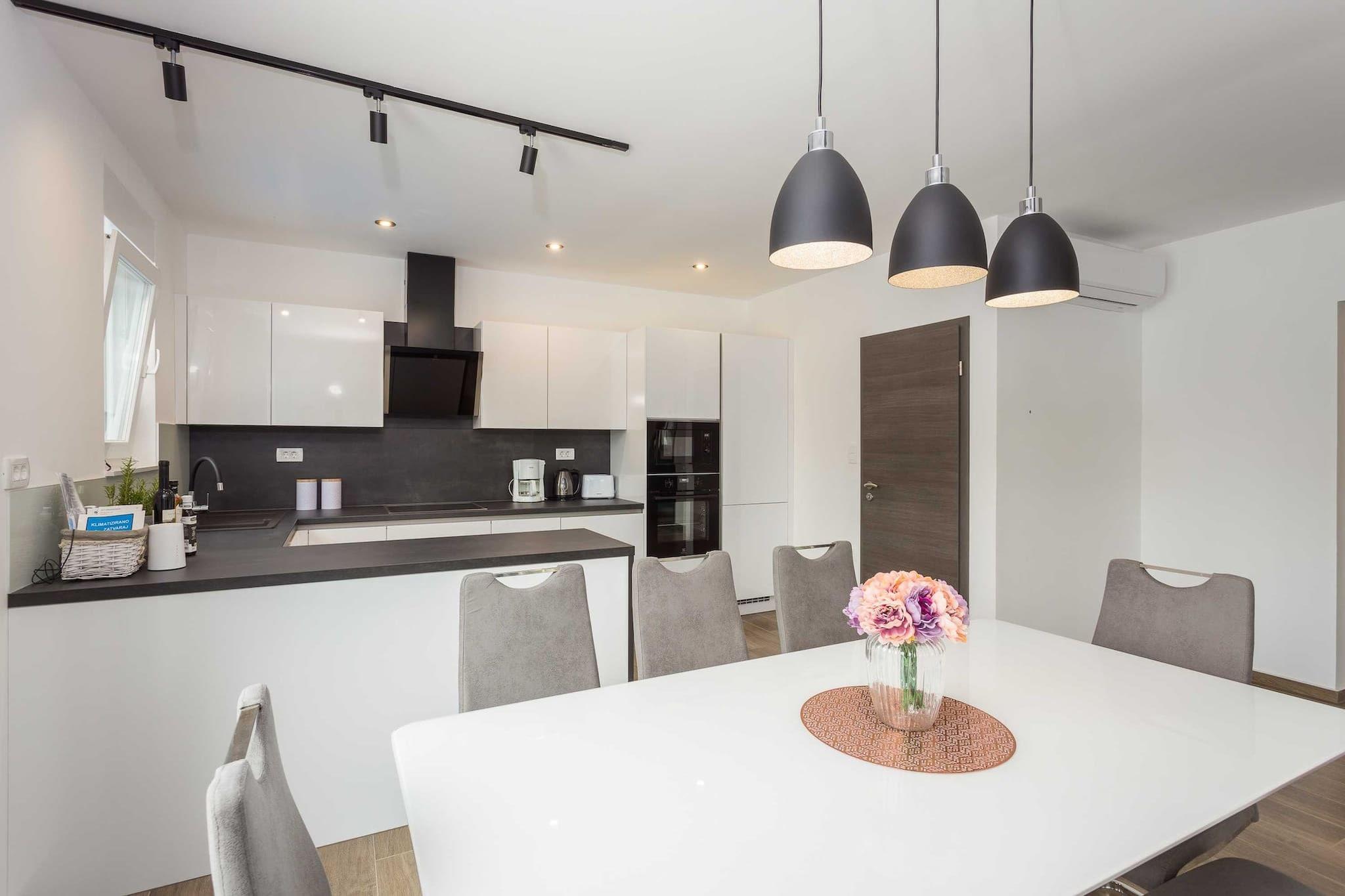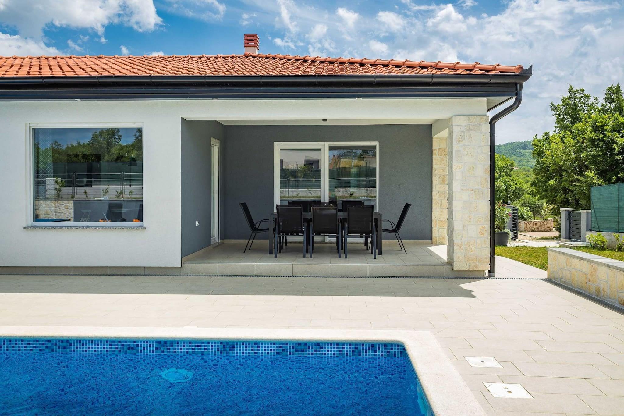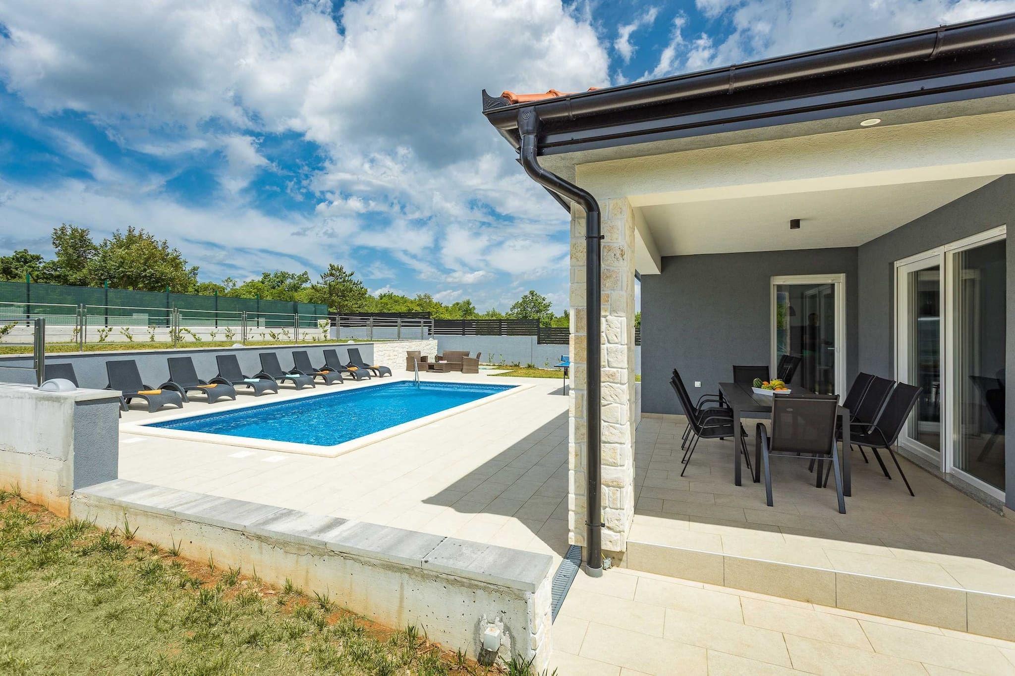 Dieses geräumige und gut ausgestattete Ferienhaus in Salakovci bietet den perfekten Rückzugsort für Familien oder Gruppen von bis zu 8 Personen. Es verfügt über 4 komfortable Schlafzimmer, jedes mit Klimaanlage und eigenem Bad, die Privatsphäre und Komfort gewährleisten. Das Anwesen bietet außerdem einen privaten Swimmingpool, eine Sonnenterrasse mit Liegestühlen, einen Essbereich im Freien, ein Trampolin und einen Holzkohlegrill für zusätzlichen Genuss. Das Haus befindet sich vollständig im Erdgeschoss und ist daher leicht zugänglich. Zu den weiteren Annehmlichkeiten gehören kostenlose Privatparkplätze. Babybetten und Hochstühle sind auf Anfrage erhältlich. Eingebettet im ruhigen Dorf Salakovci ist dieses Haus nur eine kurze Autofahrt von der pulsierenden Stadt Labin (6 km) und den wunderschönen Stränden von Rabac (10 km) entfernt. Die nahegelegene Stadt Labin bietet mit ihrer Altstadt und den Bergwerksausstellungen ein reichhaltiges kulturelles Erlebnis. Die mit der Blauen Flagge ausgezeichneten Strände von Rabac, wie Girandella und Maslinica, laden zum Sonnenbaden und Schwimmen ein. Aktive Gäste können den 17 km langen Radweg zwischen Labin und Raša erkunden oder den Sv. besuchen. Das Tauchzentrum Marina liegt nur 4 km entfernt. Das Haus verfügt über eine voll ausgestattete Küche mit modernen Geräten, ein Wohnzimmer zum Entspannen und ein separates WC mit Waschmaschine. Kostenloses WLAN sorgt für Konnektivität im gesamten Gebäude. Handtücher und Bettwäsche werden regelmäßig gewechselt und sind im Preis inbegriffen. Bei der Ankunft ist eine Kaution in Höhe von 300 EUR zu hinterlegen. Diese wird Ihnen beim Check-out erstattet, sofern keine Schäden entstehen. Bitte beachten Sie, dass in dieser Unterkunft keine Jugendgruppen und keine Haustiere erlaubt sind.