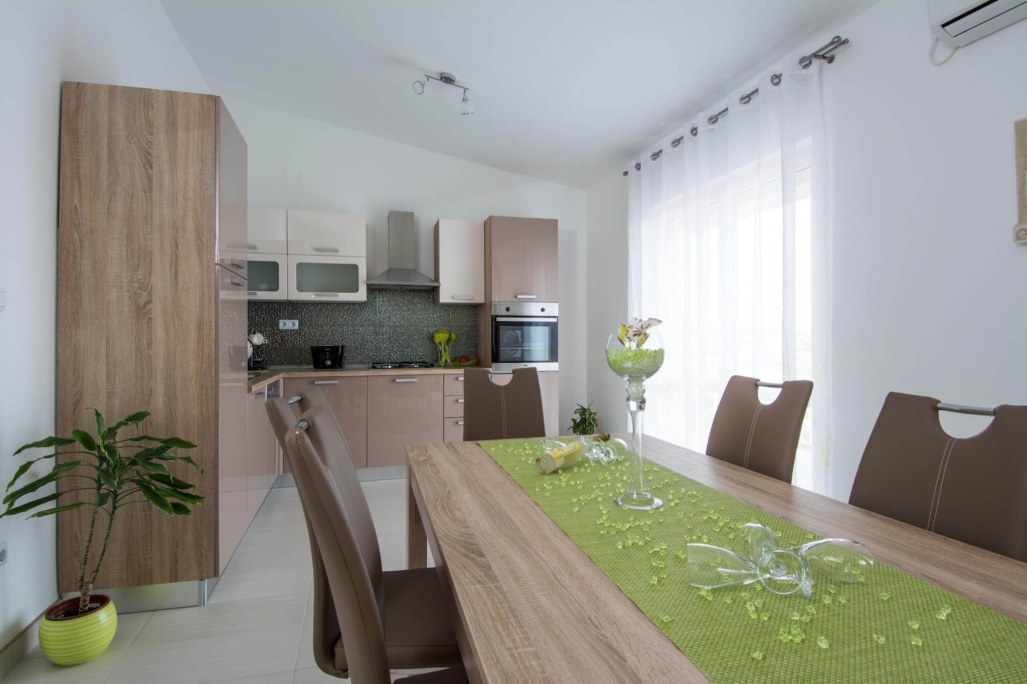 Erleben Sie den perfekten Küstenurlaub in Seget Donji mit diesem einladenden Apartment für bis zu acht Gäste, das maritimen Charme mit modernem Komfort verbindet. Nur 500 Meter vom kristallklaren Wasser und Sandstrand sowie 550 Meter vom Stadtzentrum entfernt, bietet dieses Ferienhaus Ruhe und Komfort – ideal für einen erholsamen Urlaub. Der großzügige, offene Wohn- und Essbereich ist mit einem Flachbild-Sat-TV und einem Doppelschlafsofa ausgestattet. Die moderne Küche ist komplett ausgestattet, um Ihre kulinarischen Wünsche zu erfüllen. Drei gut ausgestattete Schlafzimmer sorgen für erholsame Nächte. Eines verfügt über ein Etagenbett und einen Balkon, ein weiteres über ein Doppelbett mit Terrassenzugang und das dritte über zwei Einzelbetten und einen Balkon. Genießen Sie Ihre private Terrasse oder den gemeinschaftlichen Grillplatz. Klimaanlage, Waschmaschine und Privatparkplatz sorgen für einen angenehmen Aufenthalt. Entdecken Sie den Charme der nahegelegenen Altstadt von Trogir, einem UNESCO-Weltkulturerbe mit historischem Charme und lebendigem Ambiente. Bewundern Sie den Renaissance-Palast Cipiko oder entspannen Sie am Bene Beach, einem malerischen Ort zum Schwimmen und Sonnenbaden. Genießen Sie authentische dalmatinische Gerichte in der Konoba Trs oder genießen Sie frische Meeresfrüchte mit Meerblick im Restaurant Bocel. Ob Sie auf Entdeckungsreise oder purer Entspannung sind – dieses Küstenparadies bietet den idealen Rückzugsort in Kroatien.