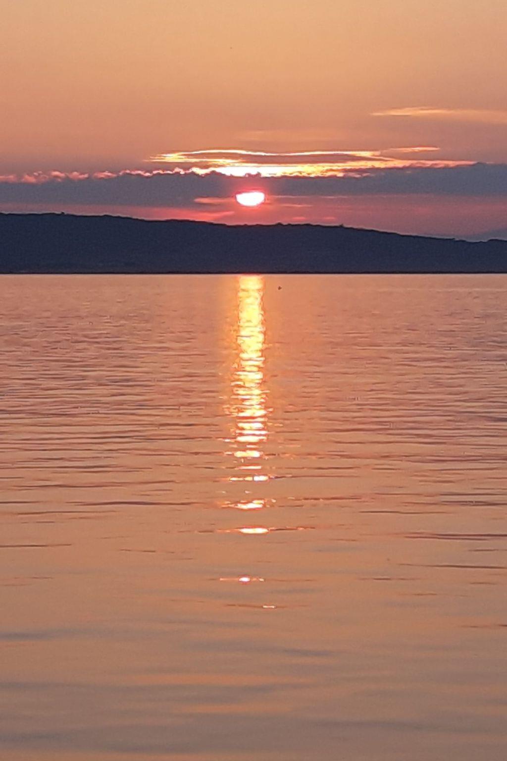 Von der Terrasse aus, die mit einer Sitzgarnitur mit Tisch ausgestattet ist, blicken Sie auf die grüne Umgebung mit dem Meer im Hintergrund.