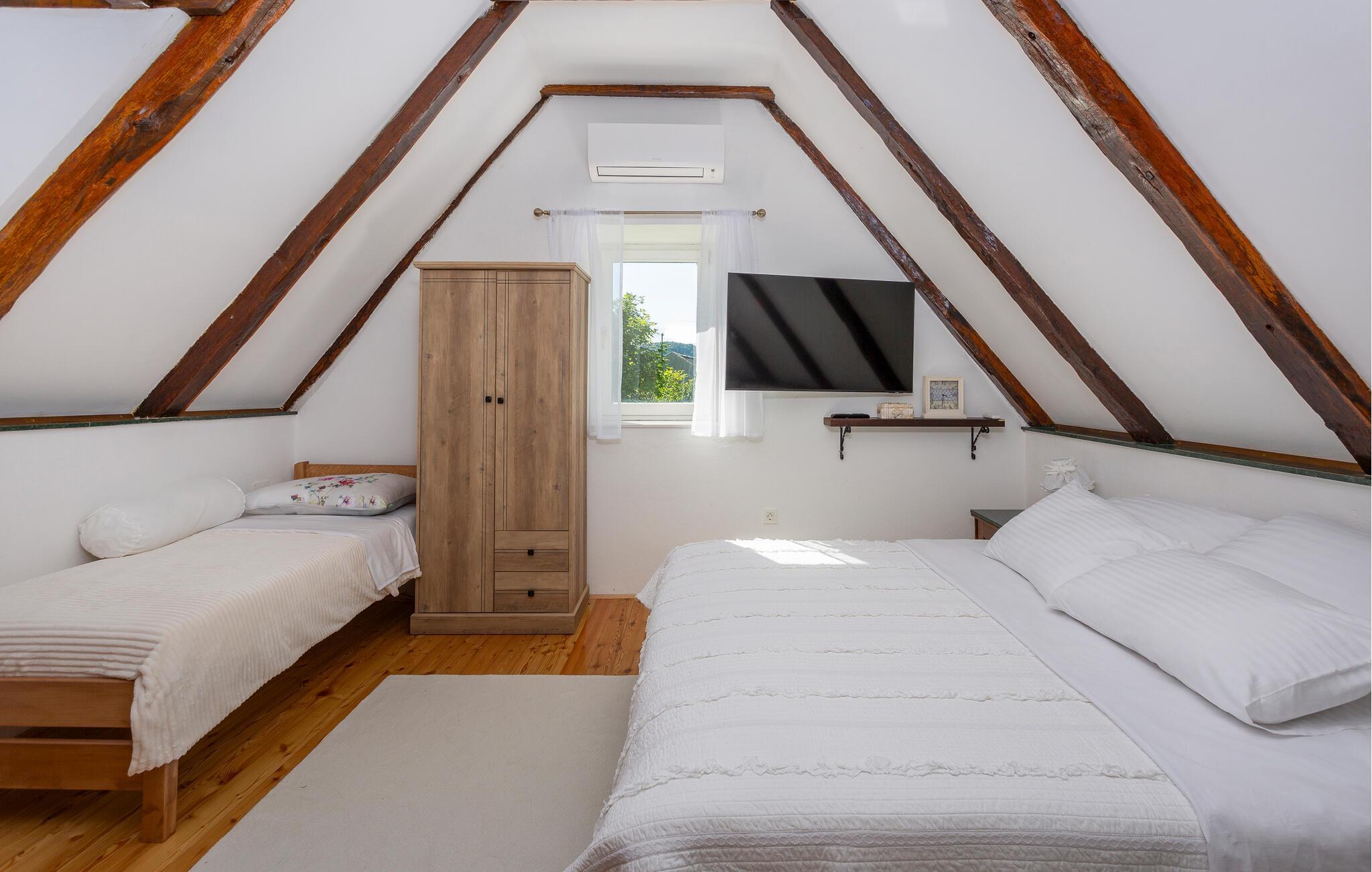 In der Nähe von Senj empfängt Sie dieses ansprechende Ferienhaus mit klassischer Einrichtung und gemütlichen Giebeldachzimmern, die Ihnen erholsame Nächste versprechen. Hier finden Sie alles vor, was Sie für Ihren unbeschwerten Urlaub brauchen und treten vom oberen Stockwerk auf die große Terrasse, auf der Sie zu Mahlzeiten oder zum Sonnenbaden zusammenkommen können.