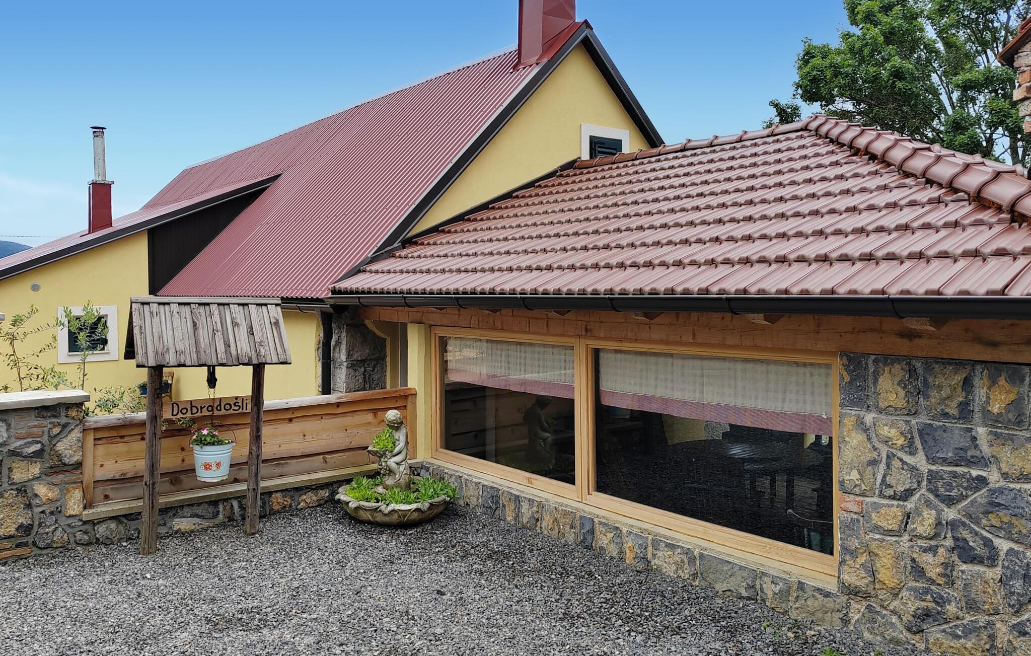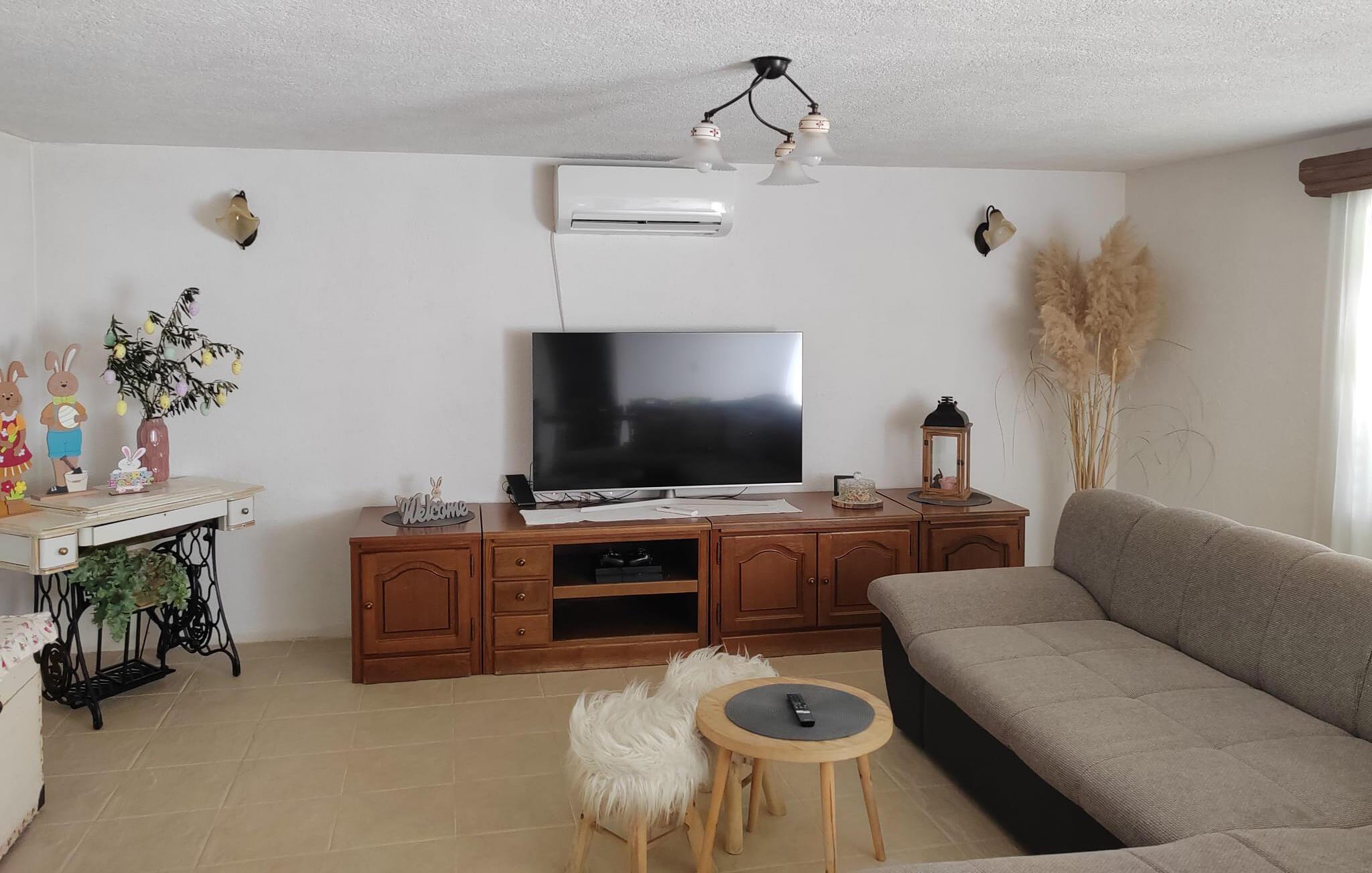 Dieses einladende Ferienhaus kombiniert rustikale Gemütlichkeit mit modernen Annehmlichkeiten. Freuen Sie sich auf gesellige Mahlzeiten im urigen Essbereich und genießen Sie das traditionelle Ambiente mit sichtbaren Holzbalken und gepflegten Steinwänden. Machen Sie es sich auf der komfortablen Couch im hellen und modern eingerichteten Wohnzimmer bequem und streamen Sie einen spannenden Film.