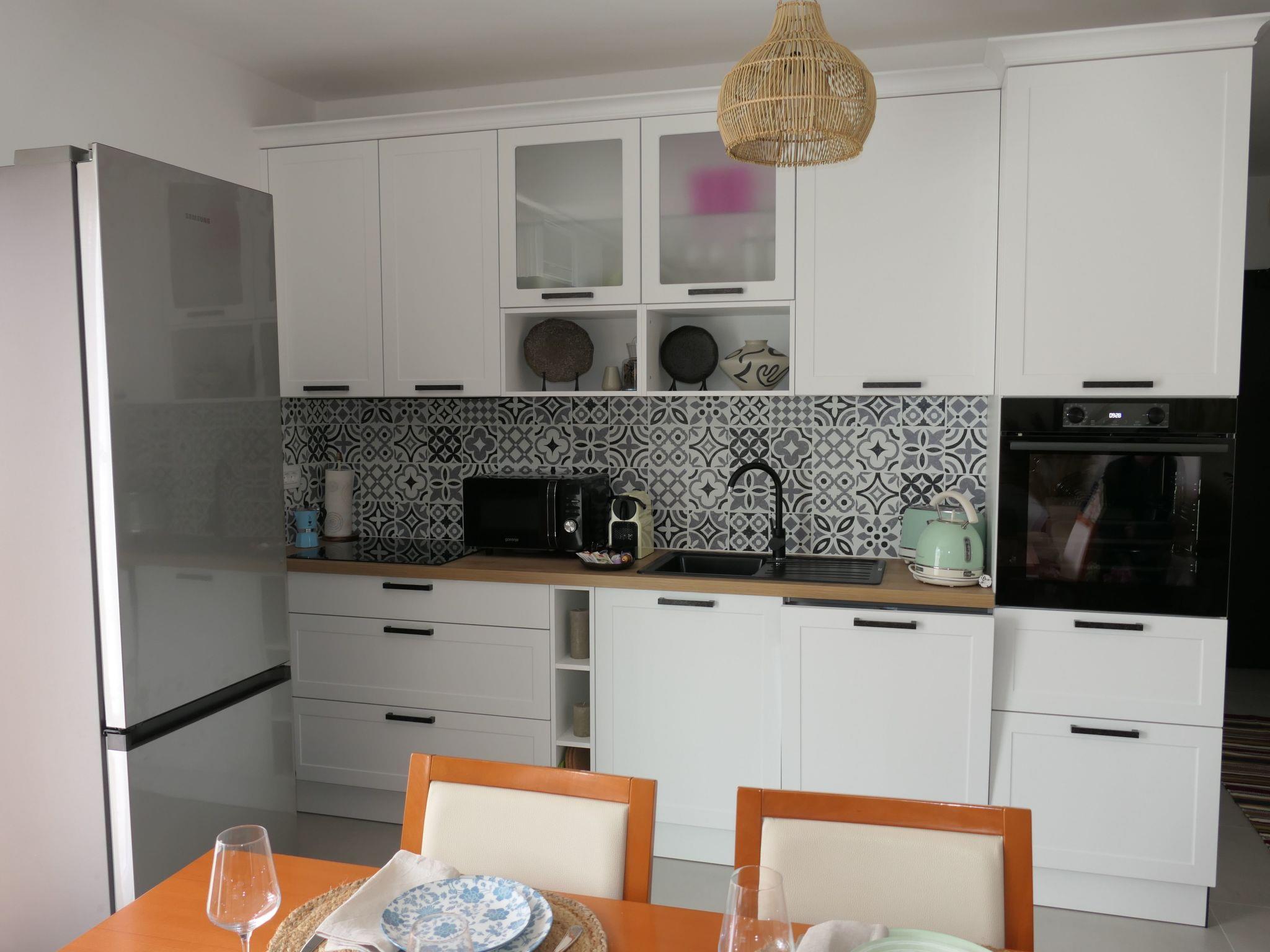 Mikrowelle, Ofen, Toaster, Herd, zwei verschiedene Kaffeemaschinen, Geschirrspüler, Waschmaschine, Bettwäsche, Handtücher, Toilettenpapier und Waschmittel.