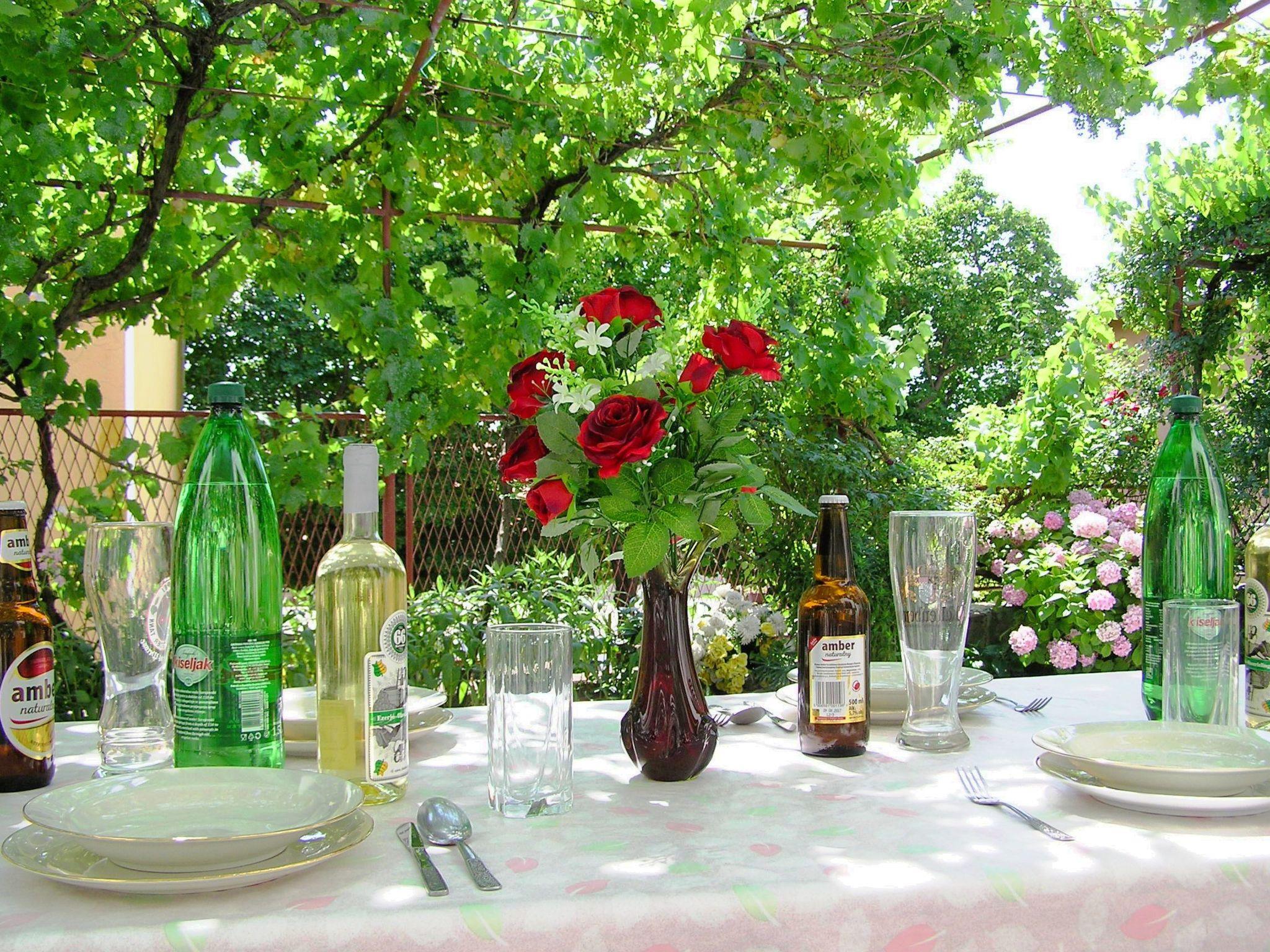 Der komplett eingezäunte Gartenbereich zur gemeinschaftlichen Nutzung ist mit viel Grün und Pflanzen geschmückt. Auf der schattigen Terrasse mit Überdachung aus Weinreben können Sie einen gemütlichen Grillabend verleben. Hier stehen ein Tisch mit zwei Bänken, 4 Stühle und ein Holzkohlegrill für Sie bereit.