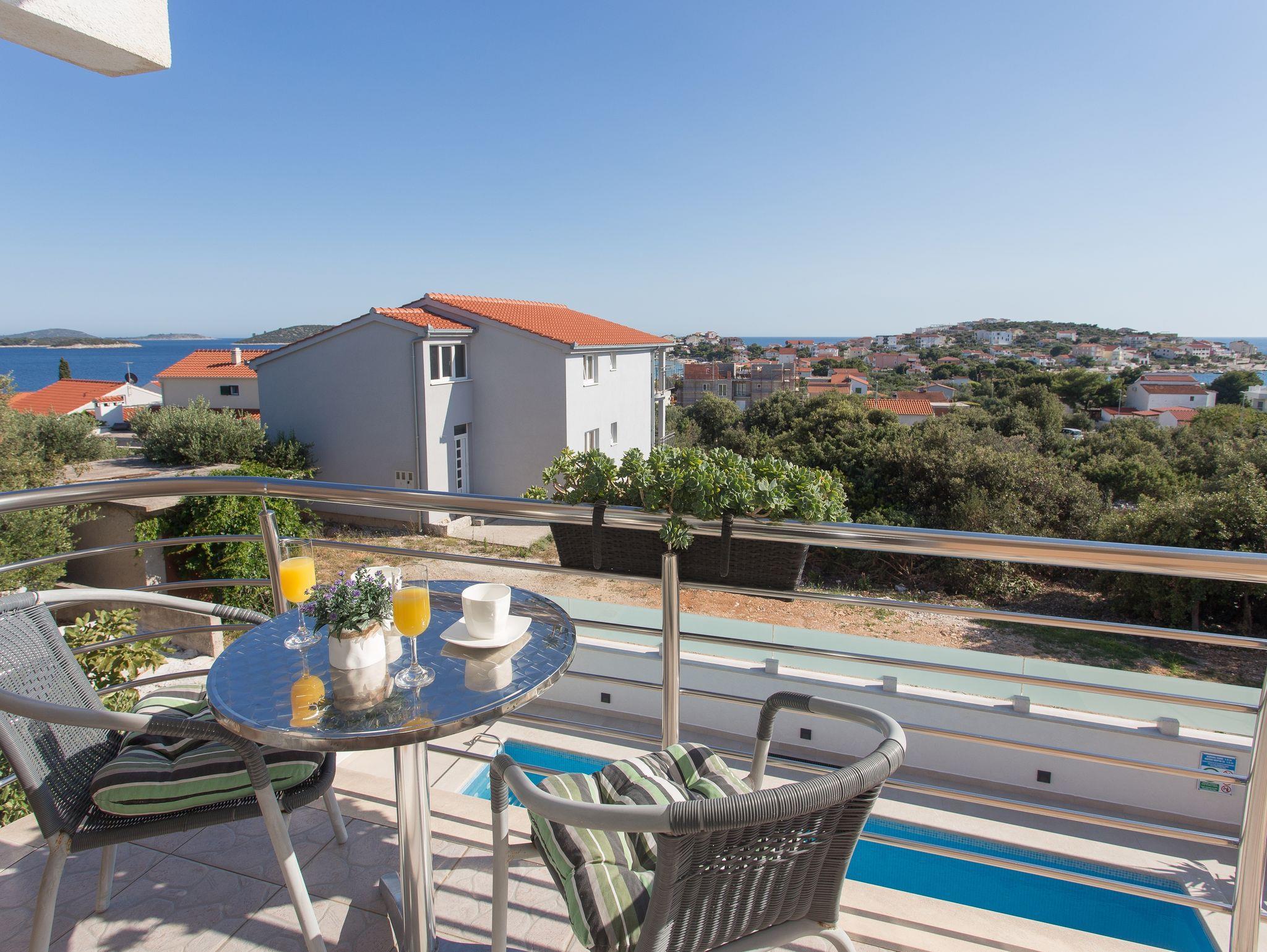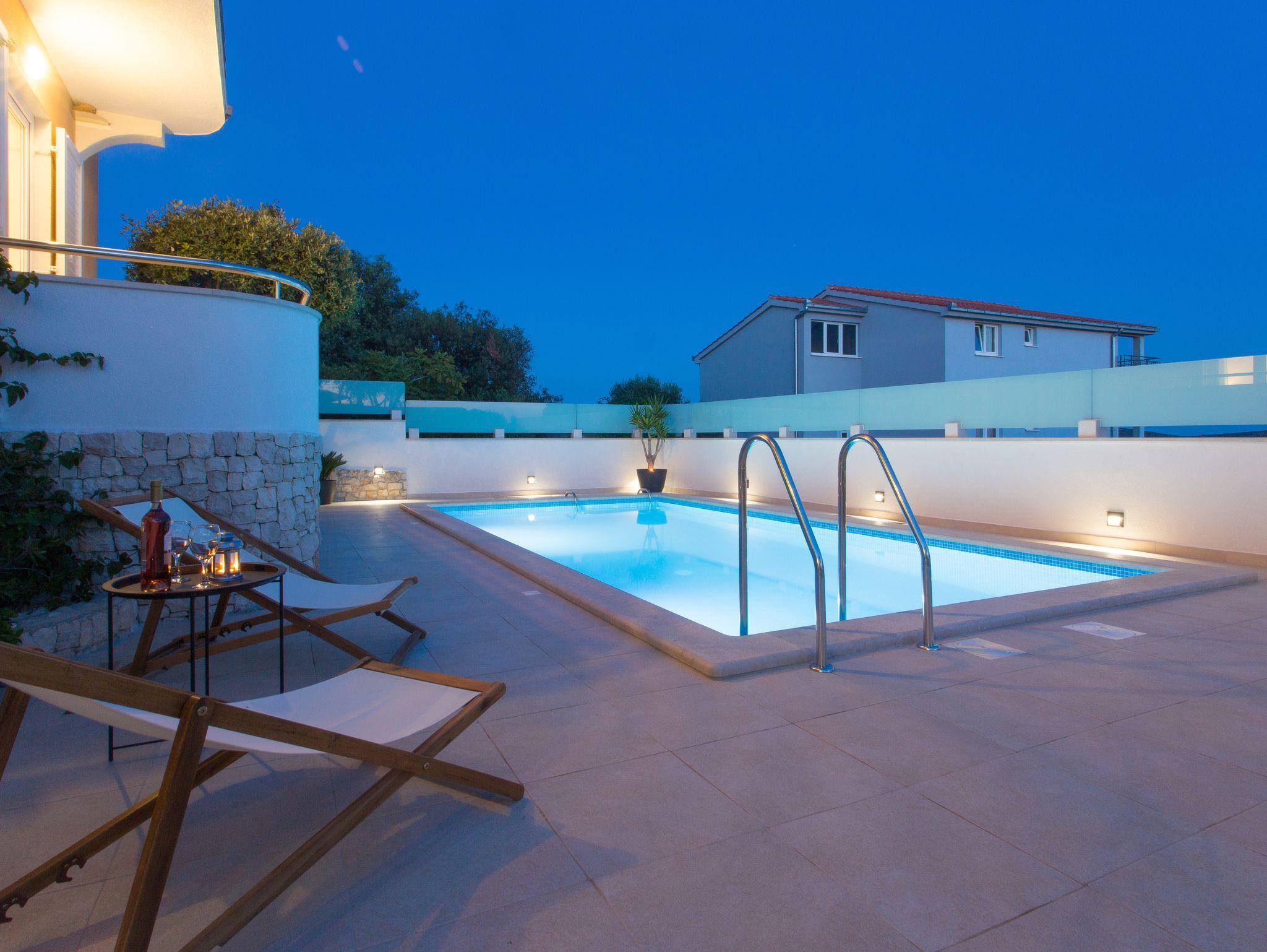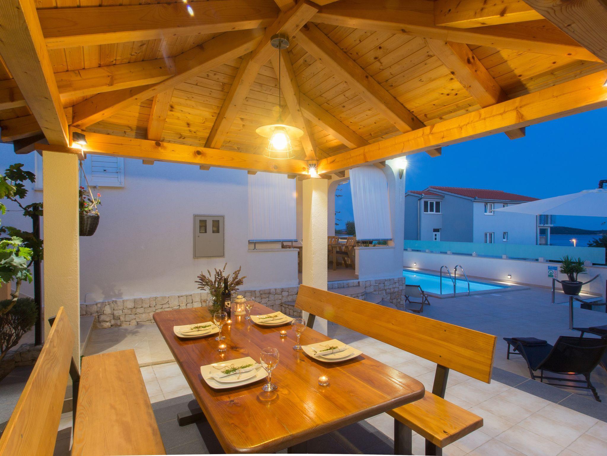 Haus bietet Platz für 8 Gäste. Die Betten sind in Schlafzimmern, die es 3 gibt, und in Wohnzimmer, innerhalb einer Gesamtfläche von 97m2, angeordnet. Die Gäste haben eine eigene Terrasse zur Verfügung, auf der sie in warmen Sommernächten genießen können. Das Haus bietet Meerblick. Für vollen Genuss und Entspannung gibt es einen privaten Grill für Gäste dieser Unterkunft. Während ihres Aufenthalts können sich Gäste im privaten Schwimmbad entspannen. IM PREIS INBEGRIFFEN: Kurtaxe, Endreinigung, Klimatisierung, Pool, Parkplatz, Internet, Bootsanlegeplatz, Bügeleisen, Bügelbrett, Föhn, Sonnenschirm. Die Verfügbarkeit zusätzlicher Dienstleistungen in Ihrem reservierten Termin und die Preise derselben (falls nicht aufgeführt) müssen im Voraus überprüft werden. Zusätzliche Dienstleistungen die in der Zahlungsaufforderung nicht aufgeführt sind werden direkt beim Vermieter bezahlt, angenommen der Gast nutzt auch diese.
