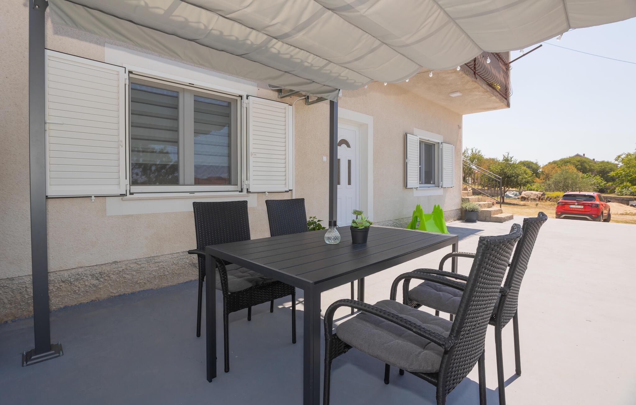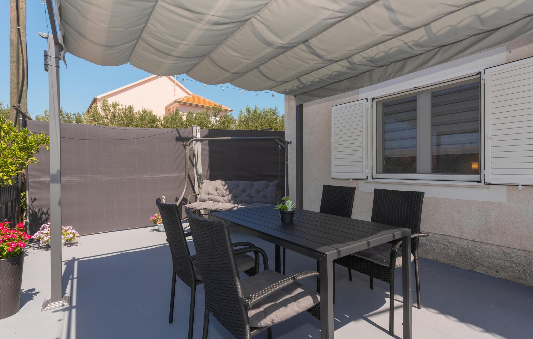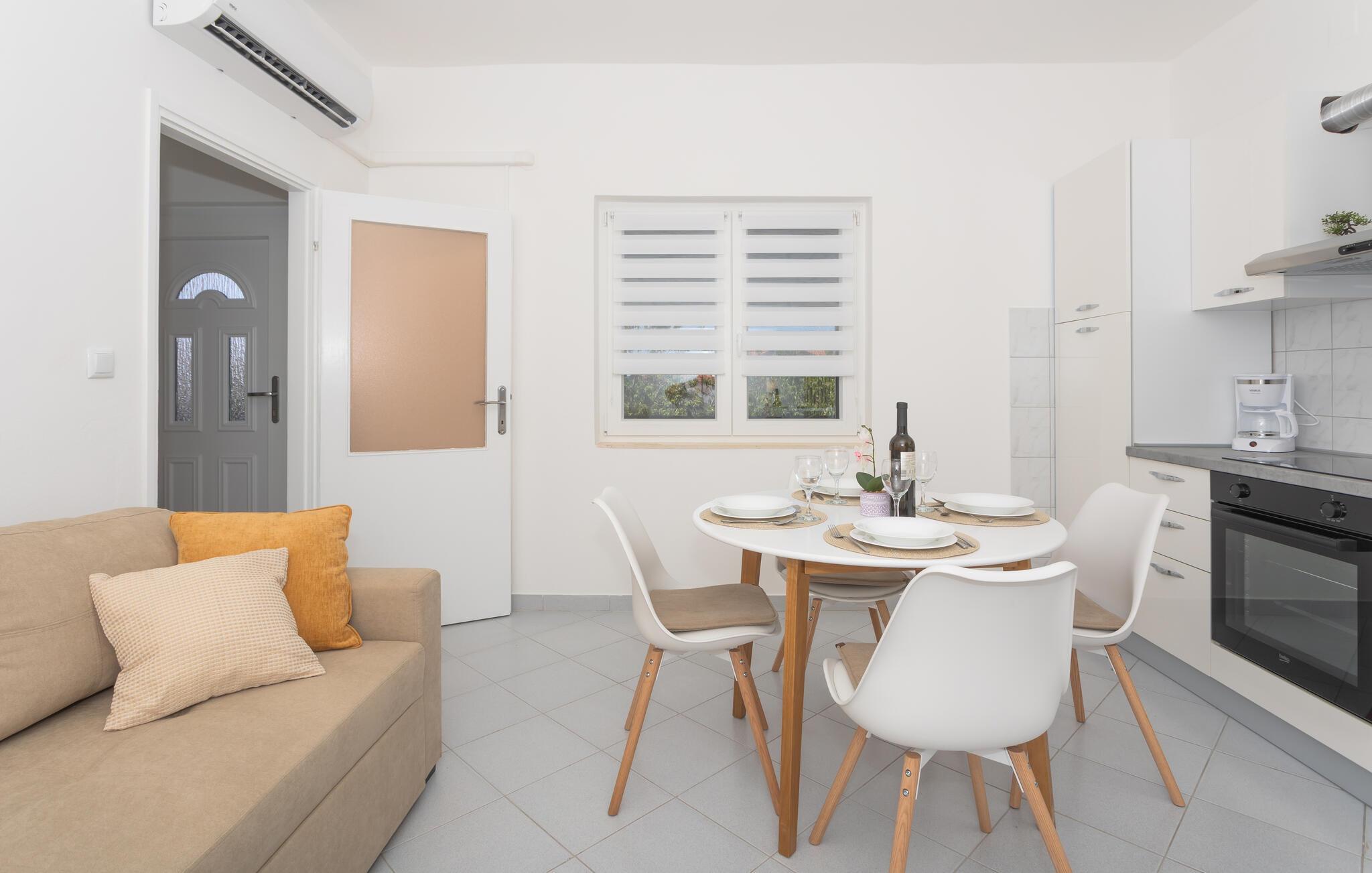 Ideal für Paare oder eine kleine Familie geeignet, begrüßt Sie Ihre wunderschön renovierte Wohnung in Razine zu einem komfortablen Aufenthalt. Genießen Sie Ihr Frühstück auf der überdachten Terrasse, die mit einem Esstisch und bequemen Sitzgelegenheiten ausgestattet ist. Hier ist auch viel Platz zum Entspannen und für gemütliche Abende im Freien. Schwingen Sie sich in die Hängeschaukel und lassen Sie den Blick über den Garten und den gepflegten Außenbereich schweifen. Der schöne Wohnbereich lädt zum Verweilen ein. Und in der offen gestalteten Essküche können Sie im Laufe des Tages köstliche Mahlzeiten zubereiten.
