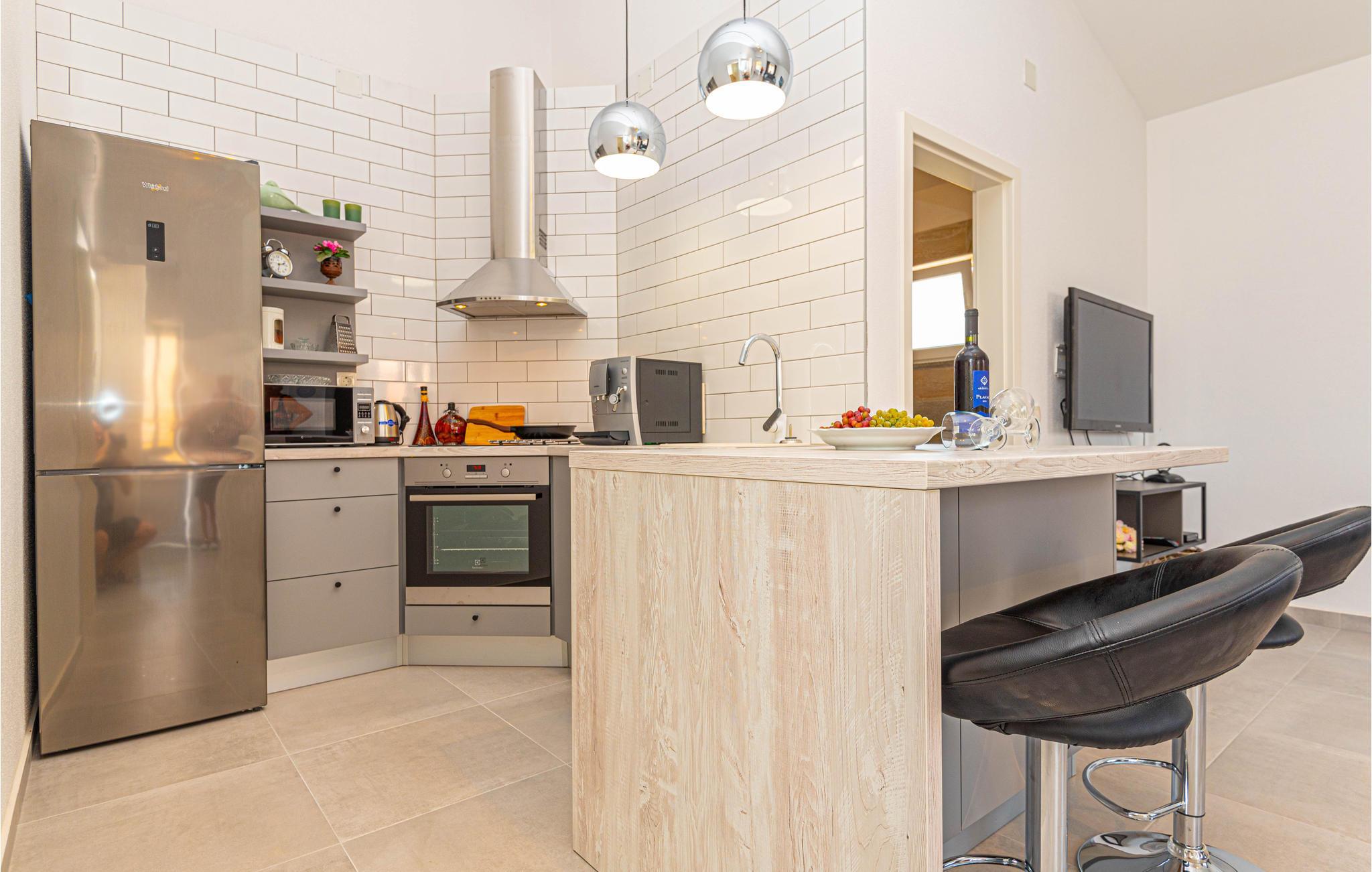 In einer kleinen Stadt, in der Nähe von Bilice und nicht weit vom malerischen Städtchen Sibenik, befindet sich diese schön eingerichtete Ferienwohnung. Die Wohnung befindet sich im ersten Stock eines Einfamilienhauses und bietet genügend Komfort für einen Familienurlaub. Die Wohnfläche verteilt sich auf zwei Schlafzimmer, ein Badezimmer und eine Essküche mit einem weiteren Schlafplatz.