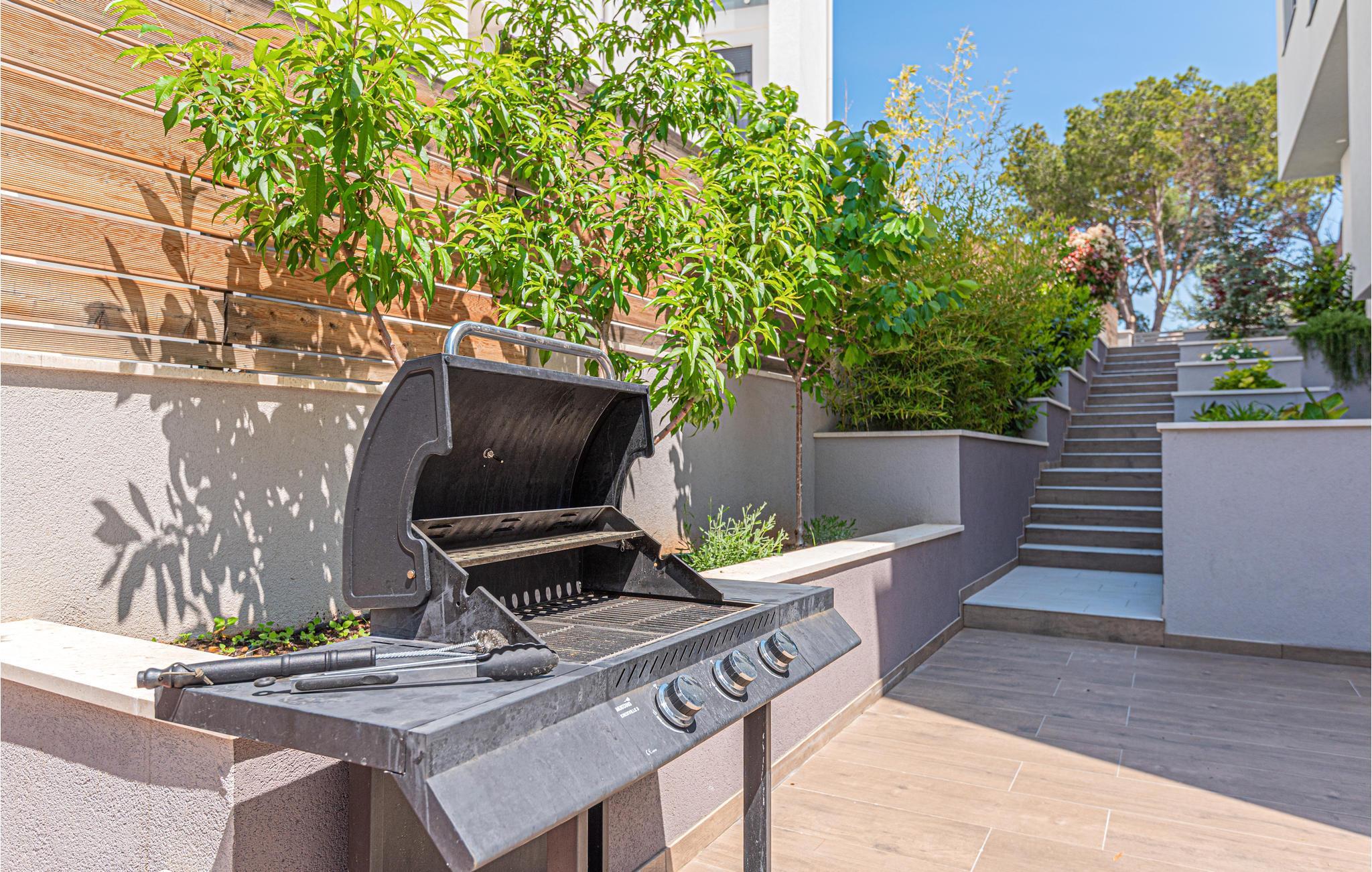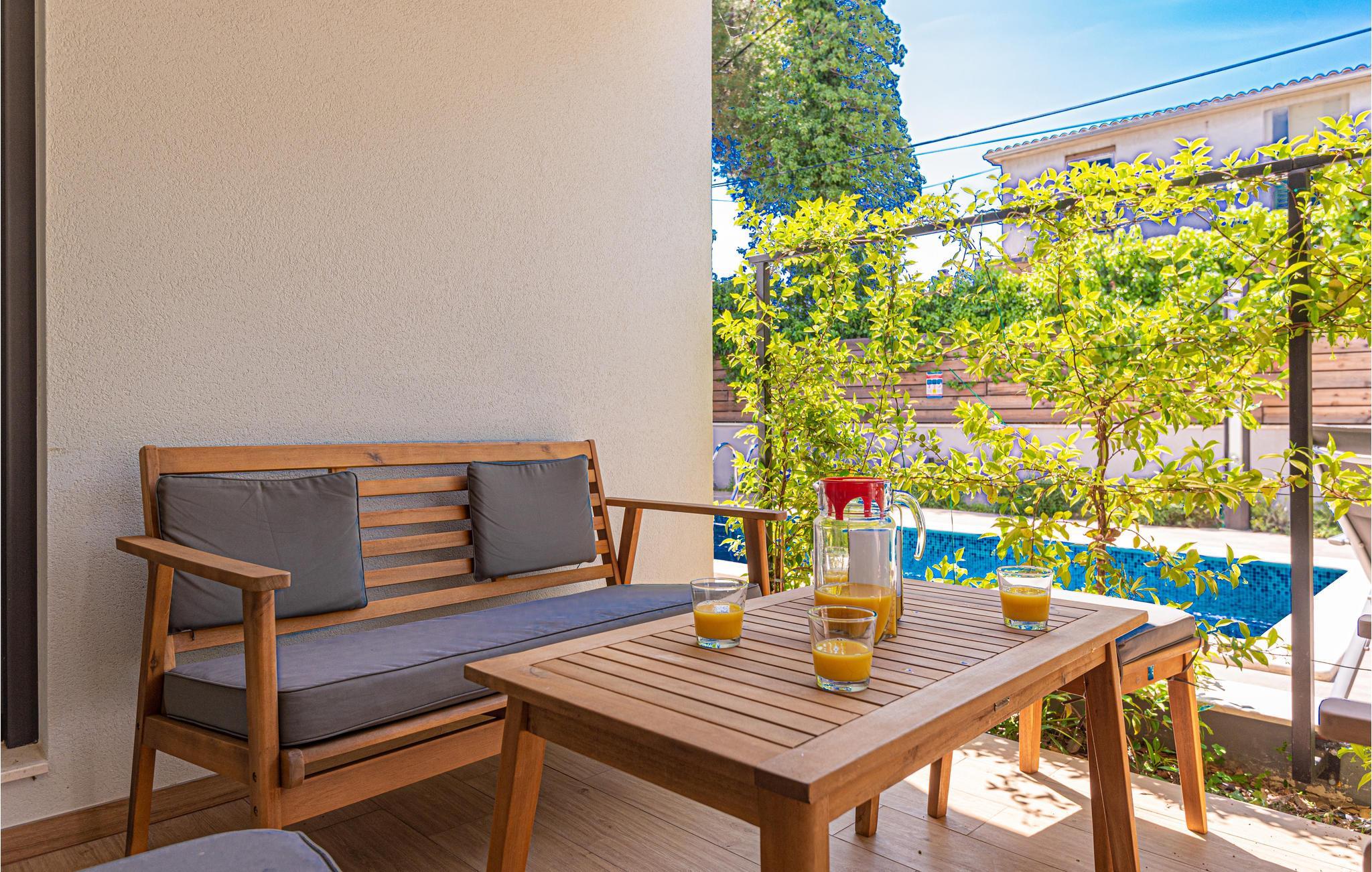 Auf der geräumigen Terrasse mit Sonnendeck können Sie sich in den heißen Sommermonaten im Pool erfrischen. Außerdem gibt es einen Grill, auf dem Sie verschiedene Köstlichkeiten für Familie und Freunde zubereiten können.