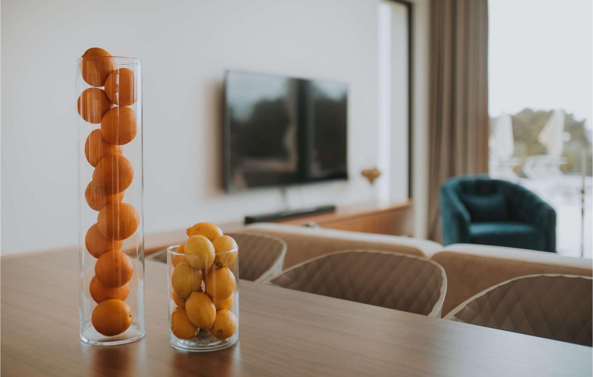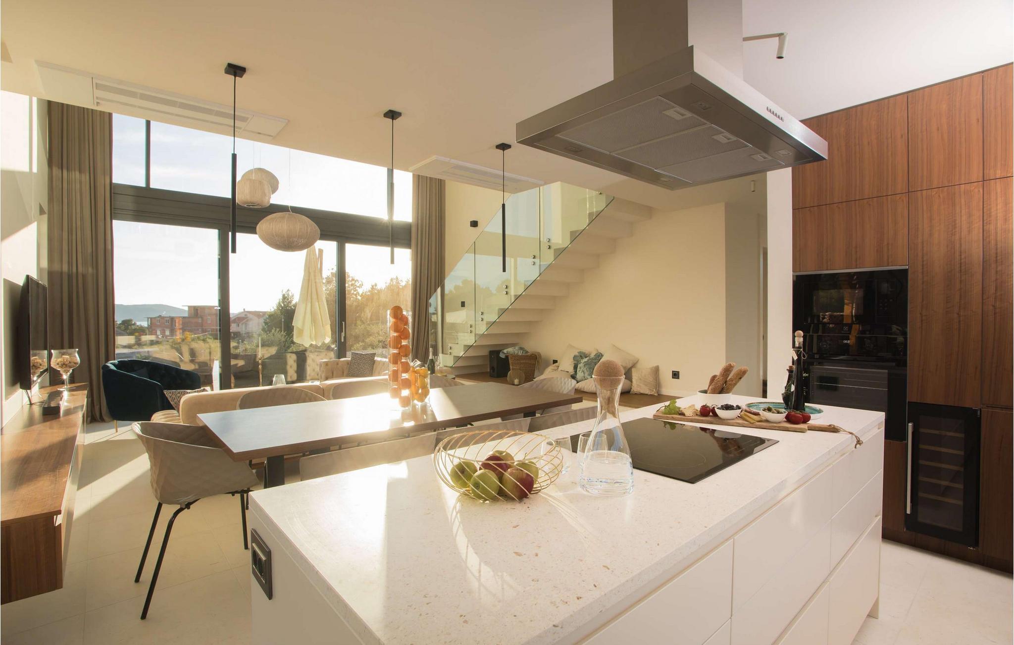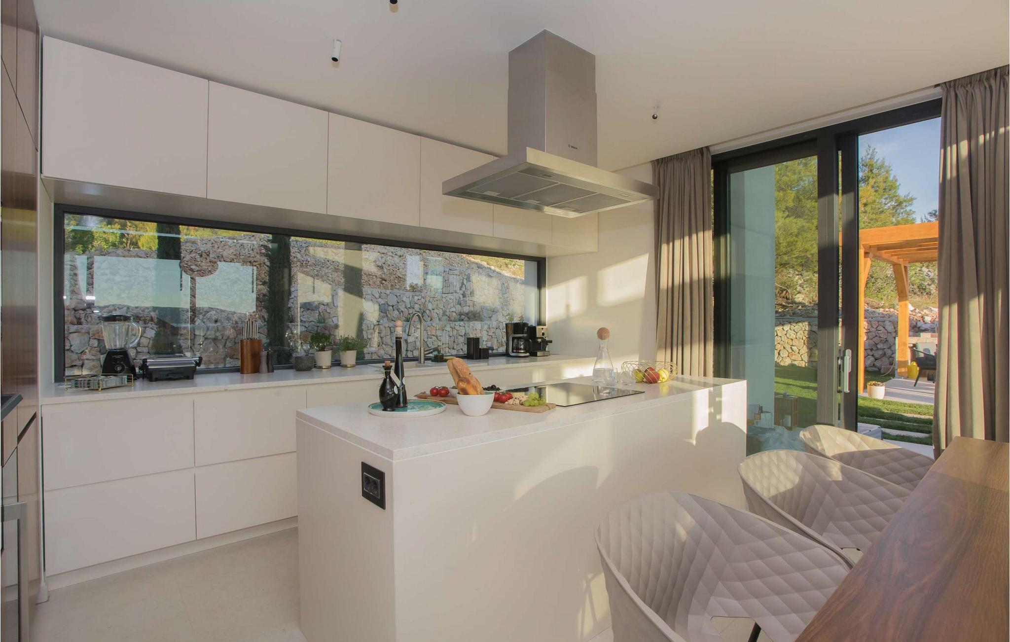 Die atemberaubende Villa Maris heißt Sie nur einen Spaziergang von der Küste entfernt willkommen und verwöhnt Sie mit höchstem Komfort sowie einem großzügigen, stilvoll eingerichteten Interieur. Große Fensterfronten versorgen den Innenbereich mit reichlich natürlichem Tageslicht und bieten einen herrlichen Blick auf das Meer und die Inseln. Freuen Sie sich auf geselliges Kochen in der voll ausgestatteten, minimalistisch gestalteten Küche und auf harmonische Mahlzeiten in einem einzigartigen Ambiente. Plaudern Sie nach einem erlebnisreichen Tag im einladenden Wohnzimmer oder ziehen Sie sich mit einem guten Buch an Ihren persönlichen Lieblingsort zurück.