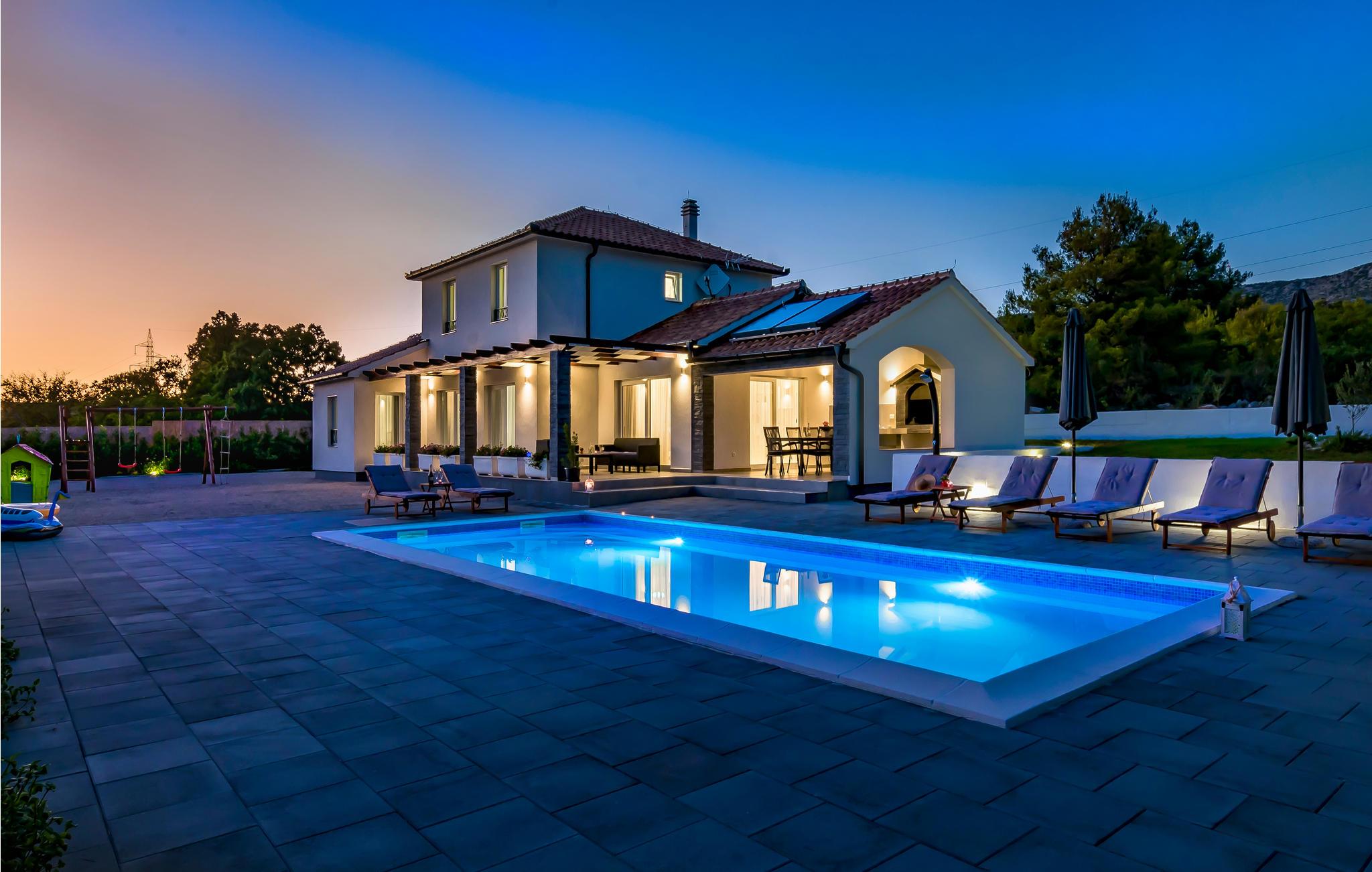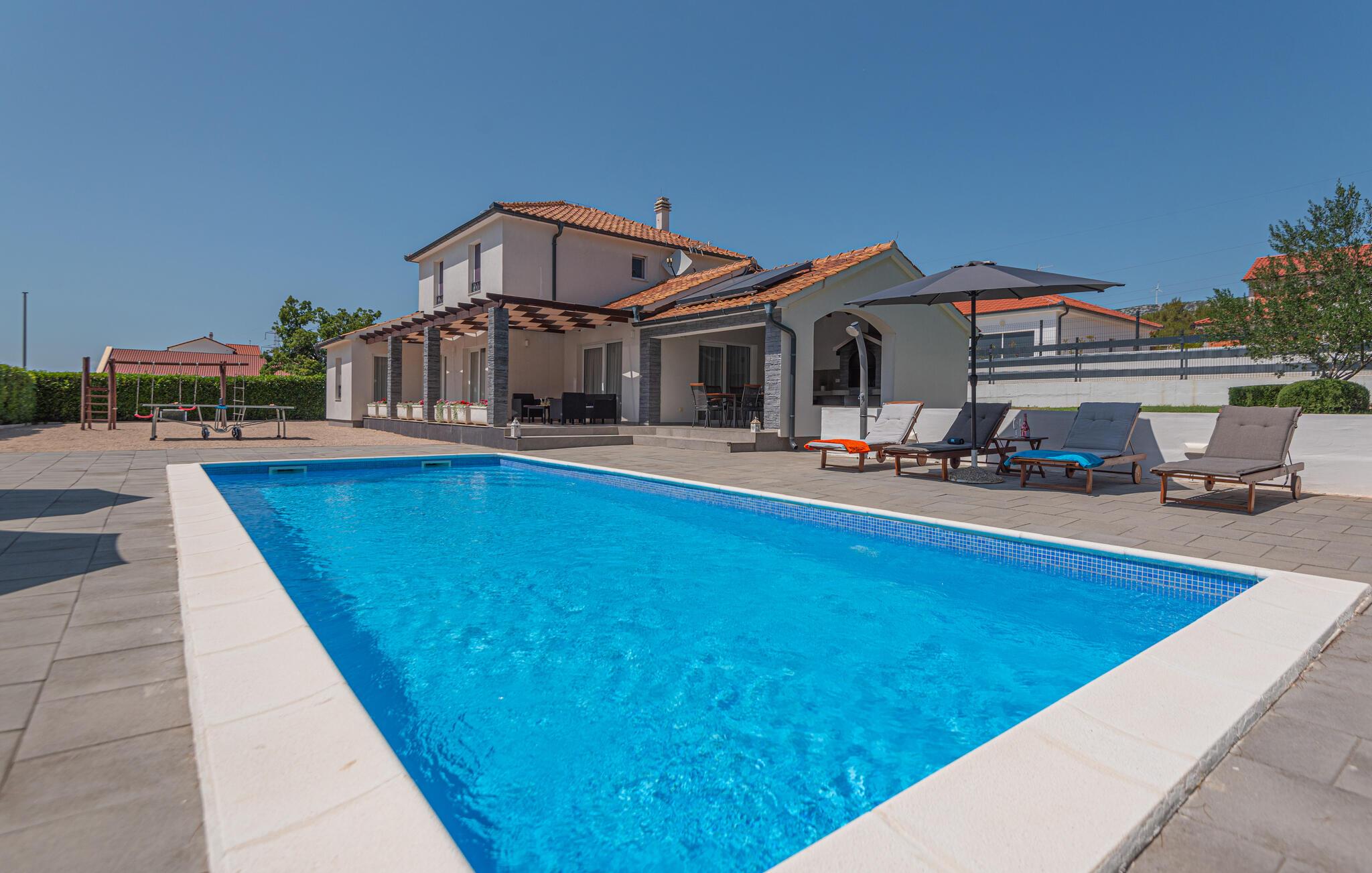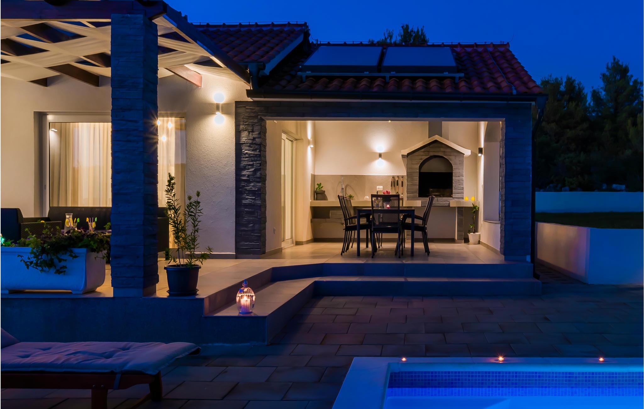 Diese helle und moderne sowie elegant eingerichtete Ferienhaus mit Pool befindet sich in Dubrava im Hinterland von Sibenik. Umgegeben von Natur und auf einem großzügigen Grundstück gelegen, eignet sich das Haus perfekt für einen erholsamen Urlaub mit Familie oder Freunden. Das Dachgeschoss mit zwei Schlafzimmern und Bädern ist durch Innentreppen mit dem Erdgeschoss verbunden. Die überdachte Terrasse bietet einen schönen Grill. Hier können Sie bei einer guten Mahlzeit herrliche Stunden mit Ihren Lieben im Freien verbringen. Auf der Poolterrasse finden Sie die perfekte Entspannungszone vor. Besuchen Sie die schöne und lebendige Stadt Sibenik, den Nationalpark Krka und das Städtchen Skradin.