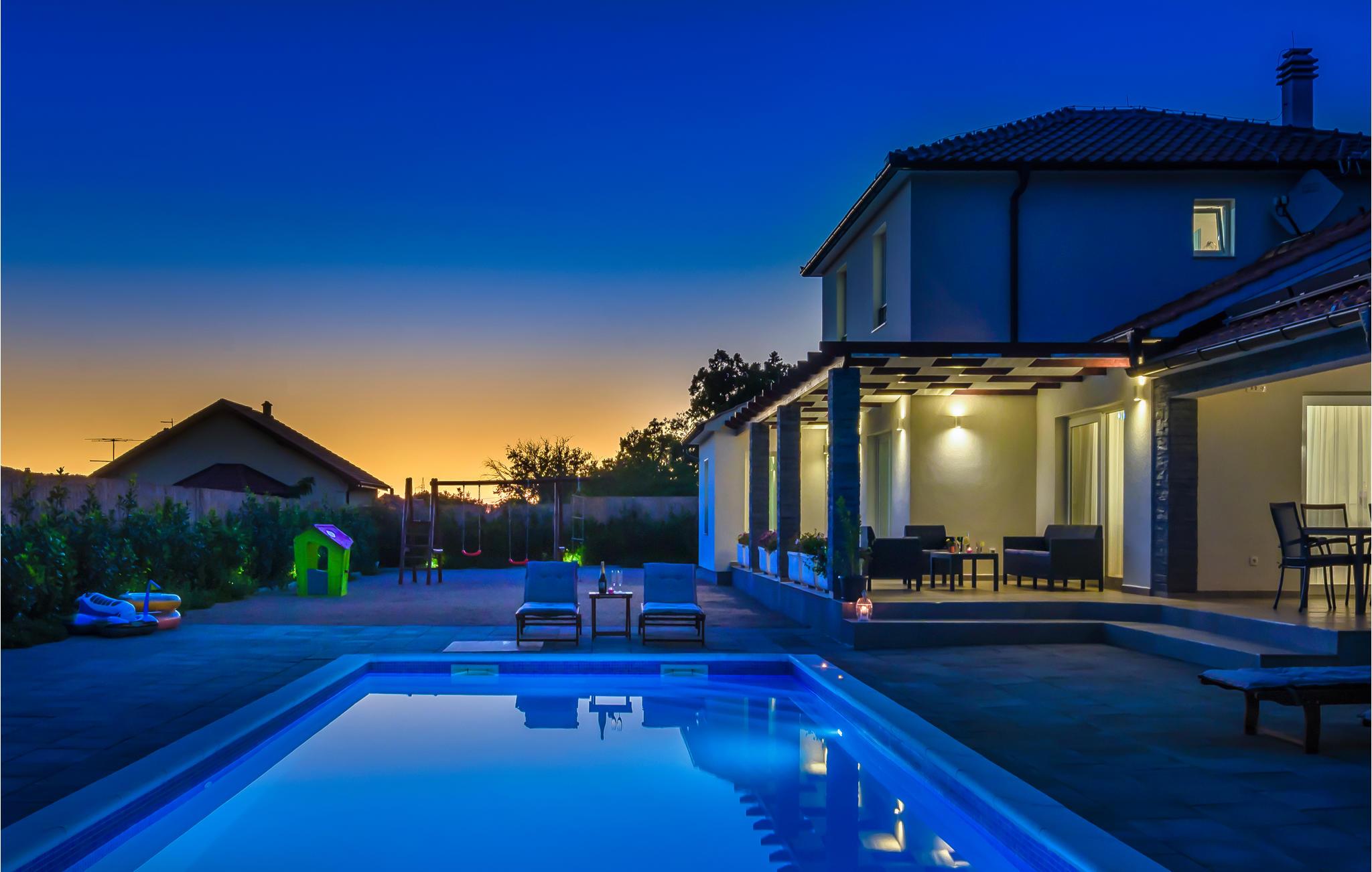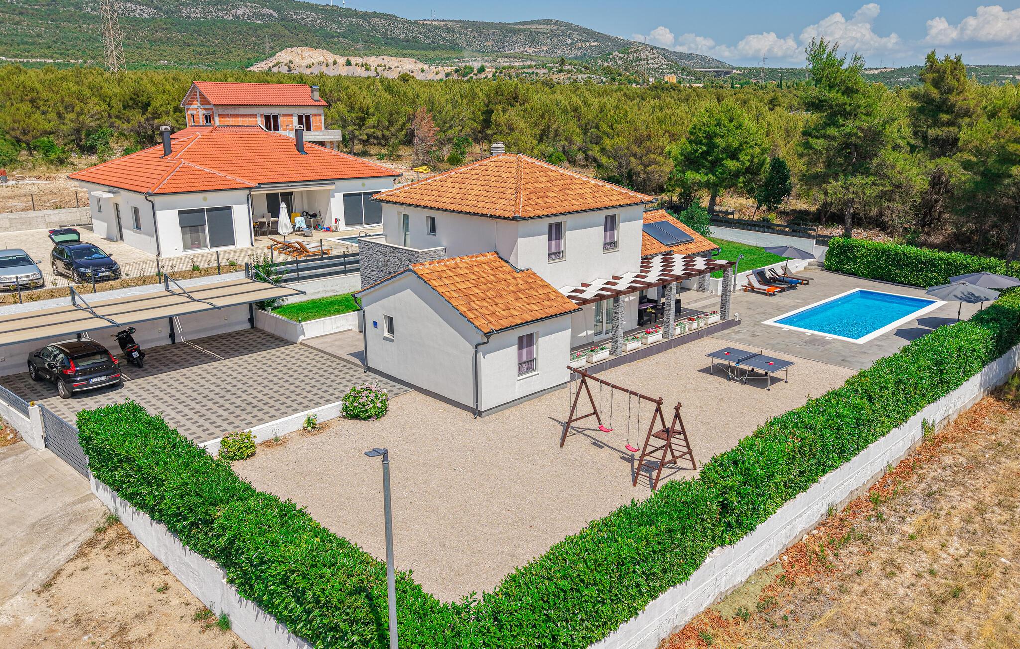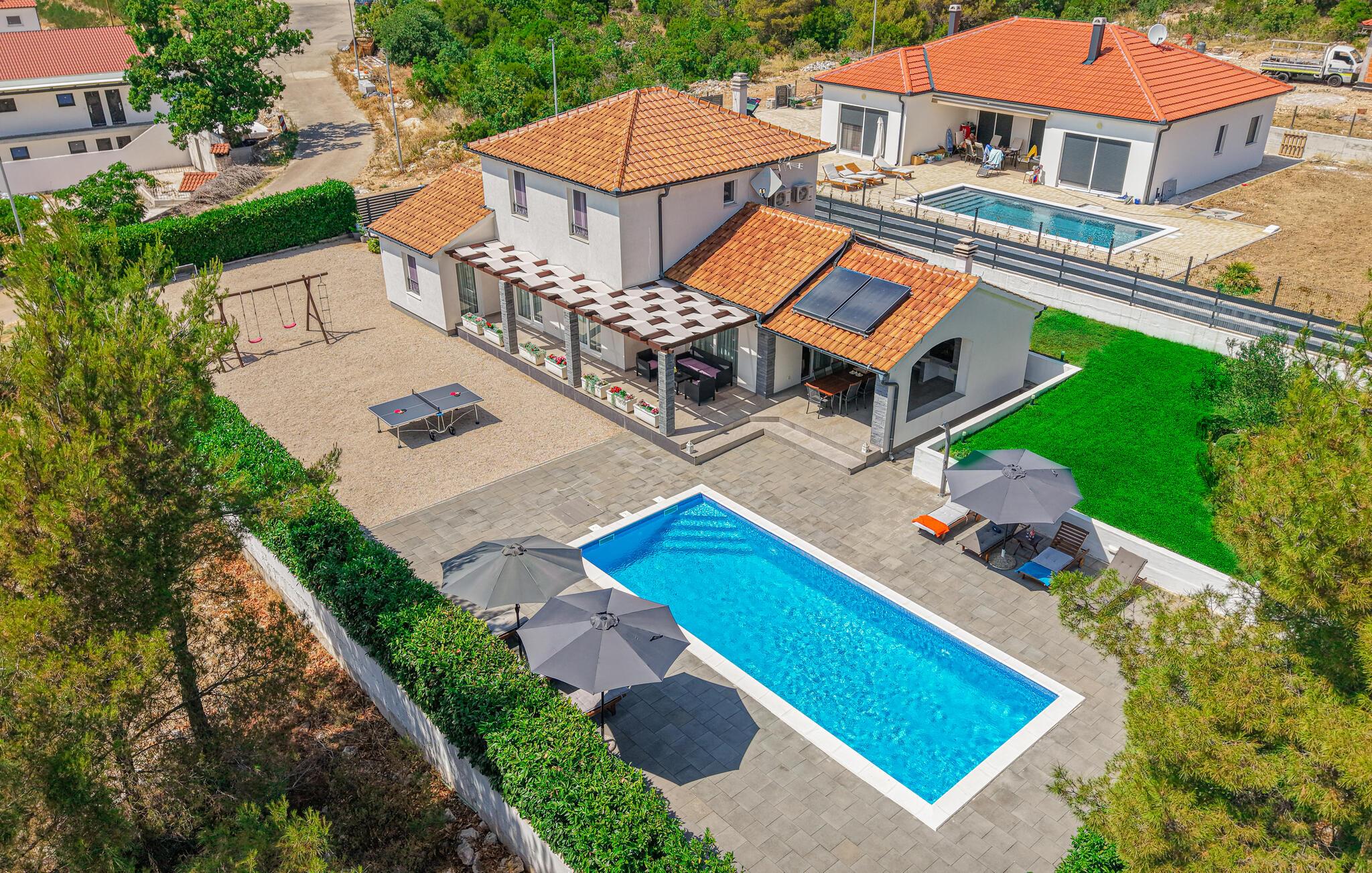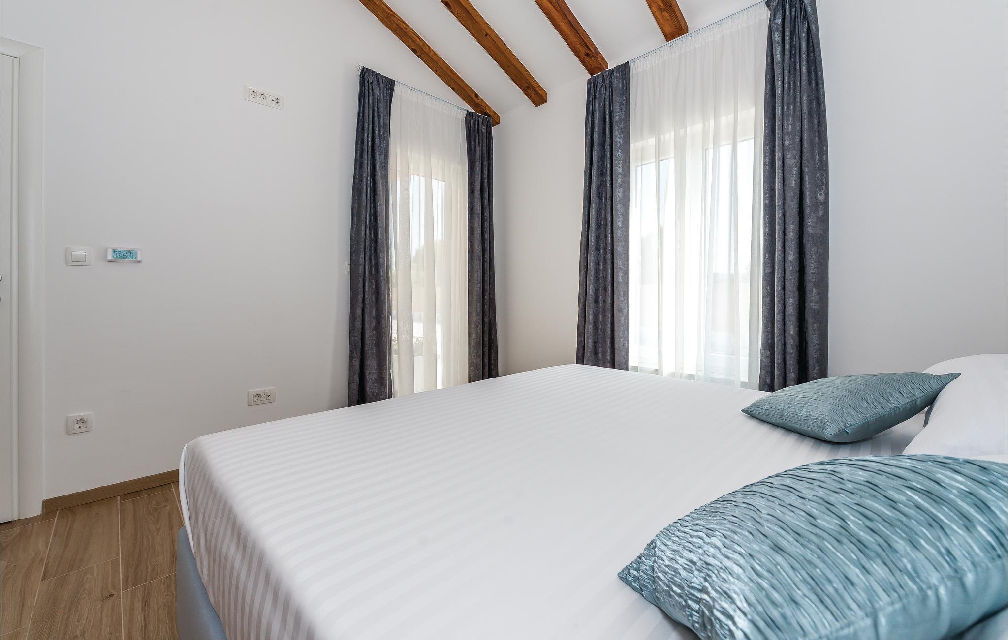 Diese helle und moderne sowie elegant eingerichtete Ferienhaus mit Pool befindet sich in Dubrava im Hinterland von Sibenik. Umgegeben von Natur und auf einem großzügigen Grundstück gelegen, eignet sich das Haus perfekt für einen erholsamen Urlaub mit Familie oder Freunden. Das Dachgeschoss mit zwei Schlafzimmern und Bädern ist durch Innentreppen mit dem Erdgeschoss verbunden. Die überdachte Terrasse bietet einen schönen Grill. Hier können Sie bei einer guten Mahlzeit herrliche Stunden mit Ihren Lieben im Freien verbringen. Auf der Poolterrasse finden Sie die perfekte Entspannungszone vor. Besuchen Sie die schöne und lebendige Stadt Sibenik, den Nationalpark Krka und das Städtchen Skradin.