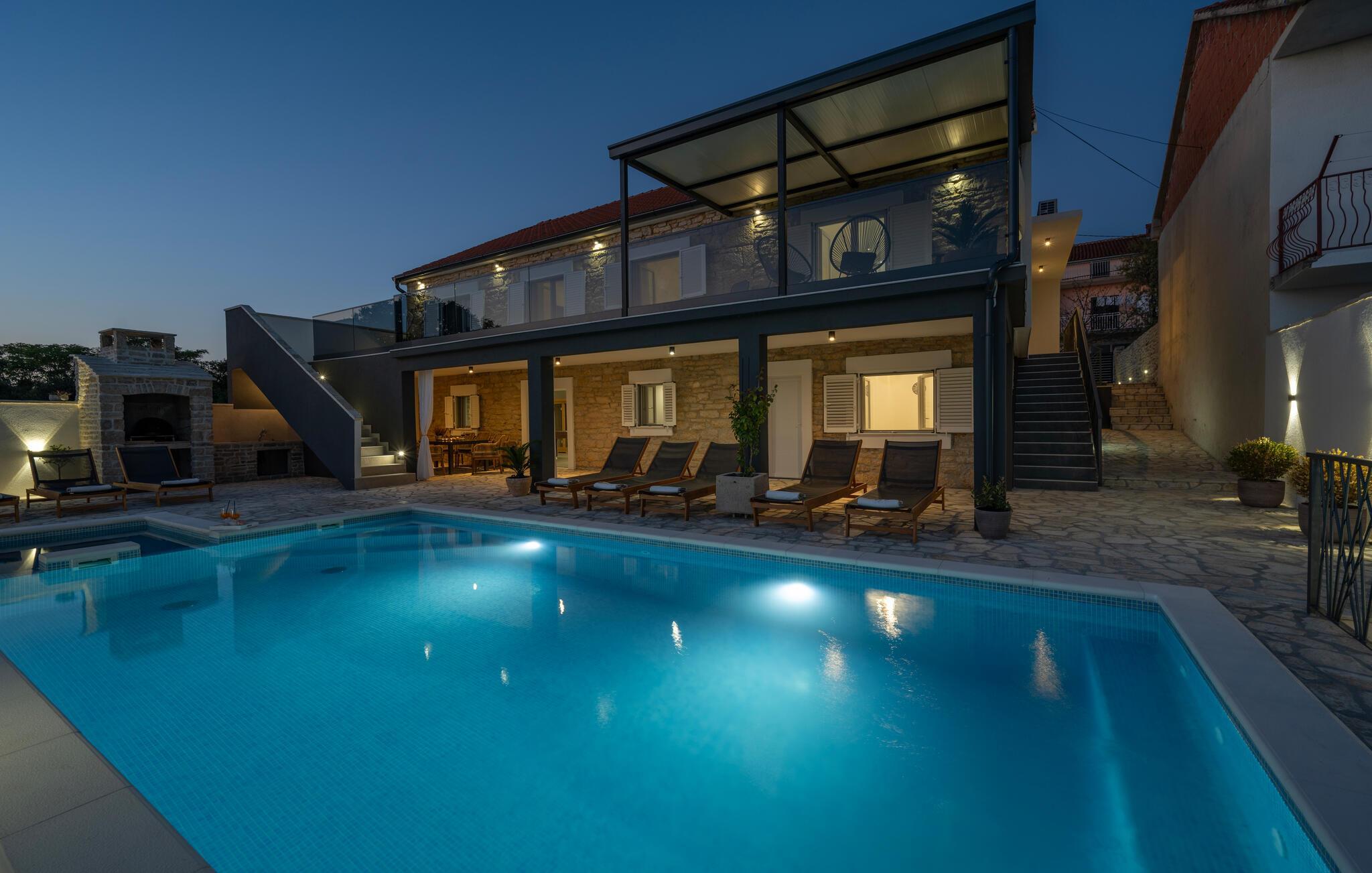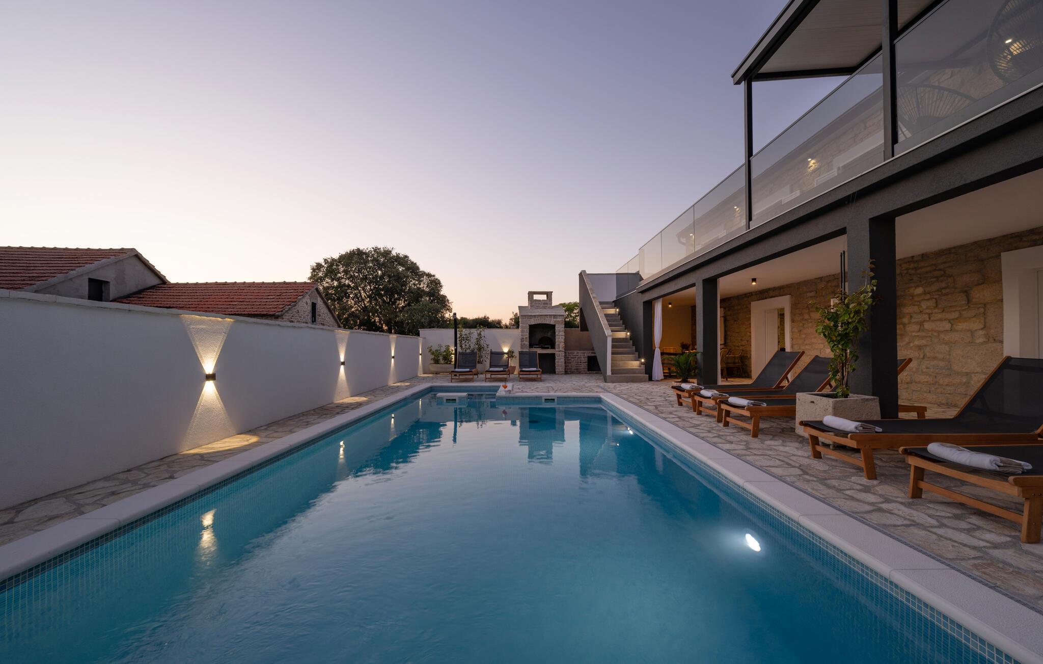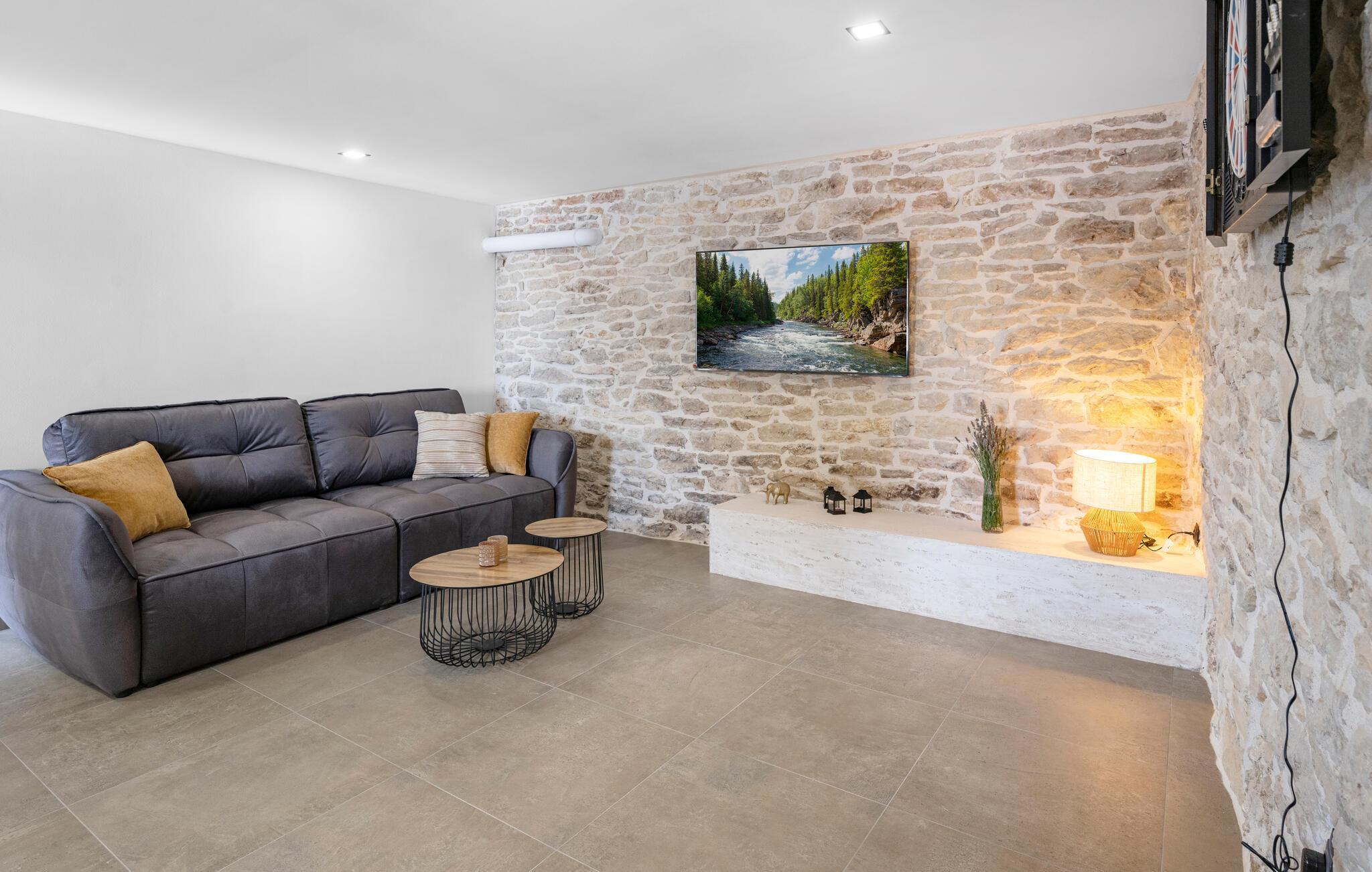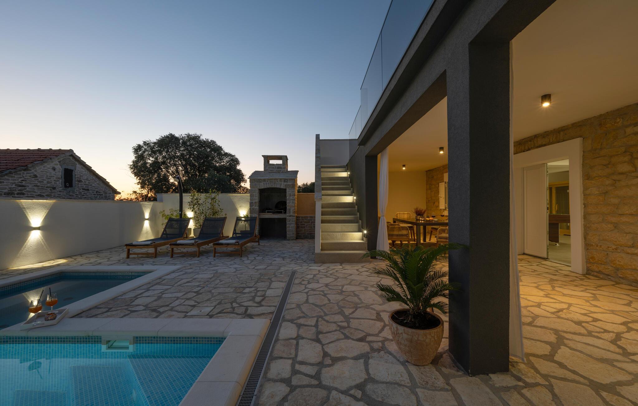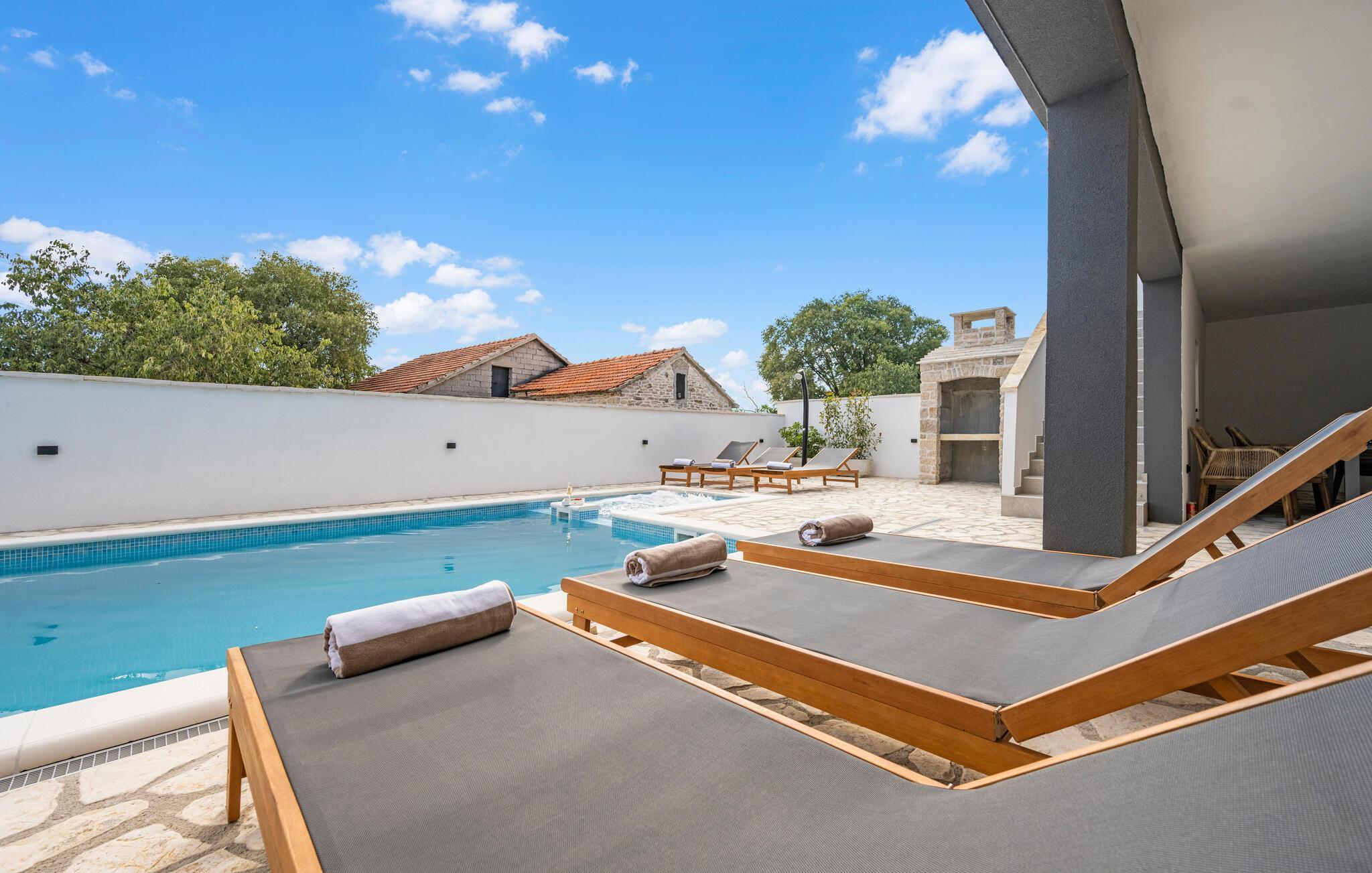 Genießen Sie einen erholsamen Urlaub in Ihrem modernen Ferienhaus in Plastovo, einem charmanten Dorf unweit des Nationalparks Krka. Dieses elegante Haus bietet Ihnen einen Hauch von Luxus. Entspannen Sie auf der großen Terrasse, die mit einem großzügigen Pool und bequemen Sonnenliegen ausgestattet ist. Beginnen Sie Ihren Tag mit einem erfrischenden Sprung ins kühle Nass und genießen Sie die friedliche Umgebung. Der stilvolle Innenbereich des Hauses lädt zum Verweilen ein. Machen Sie es sich auf dem gemütlichen Sofa im Wohnzimmer bequem und genießen Sie die moderne Einrichtung. In der gut ausgestatteten Küche können Sie Ihre Lieblingsgerichte zubereiten und diese am Esstisch mit der Familie oder Freunden genießen.