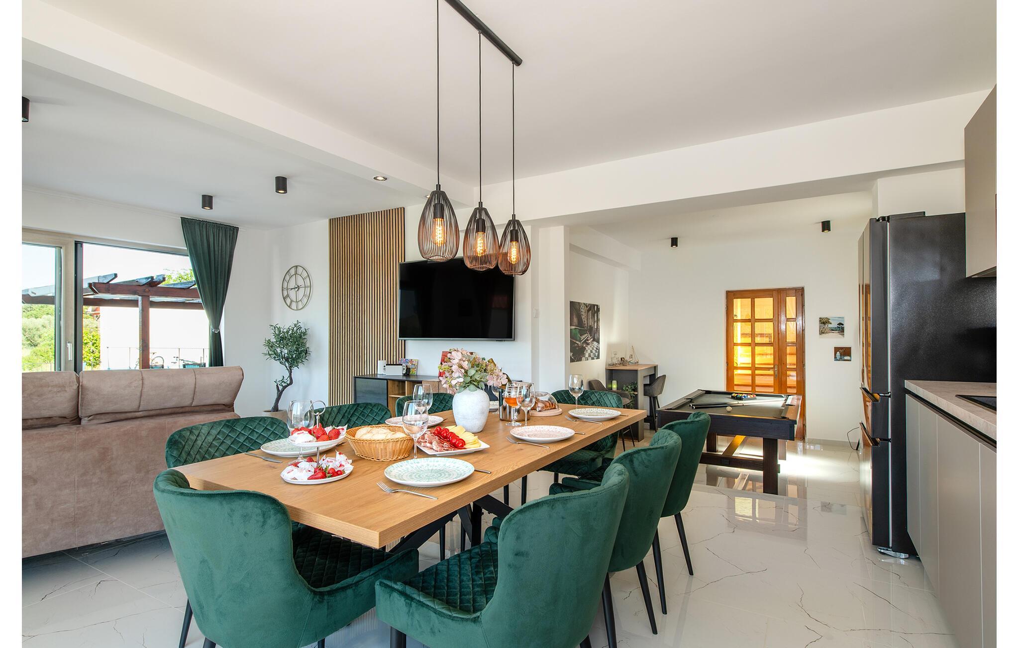 Die wunderschöne Villa Plenca liegt in einem kleinen dalmatinischen Dorf in der Nähe der Stadt Sibenik. Diese charmante Villa inmitten unberührter Natur bietet Ihnen einen bezaubernden Blick auf die Landschaft, den Sie beim Entspannen an privatem Pool vor der Villa genießen können. Im Außenbereich befindet sich auch eine schöne überdachte Terrasse mit einem Esstisch und einem Grill, damit Sie die sommerliche Atmosphäre mit Familie und Freunden in vollen Zügen genießen können. Ihren ersten Morgenkaffee können Sie in der Sitzecke beim Pool genießen.