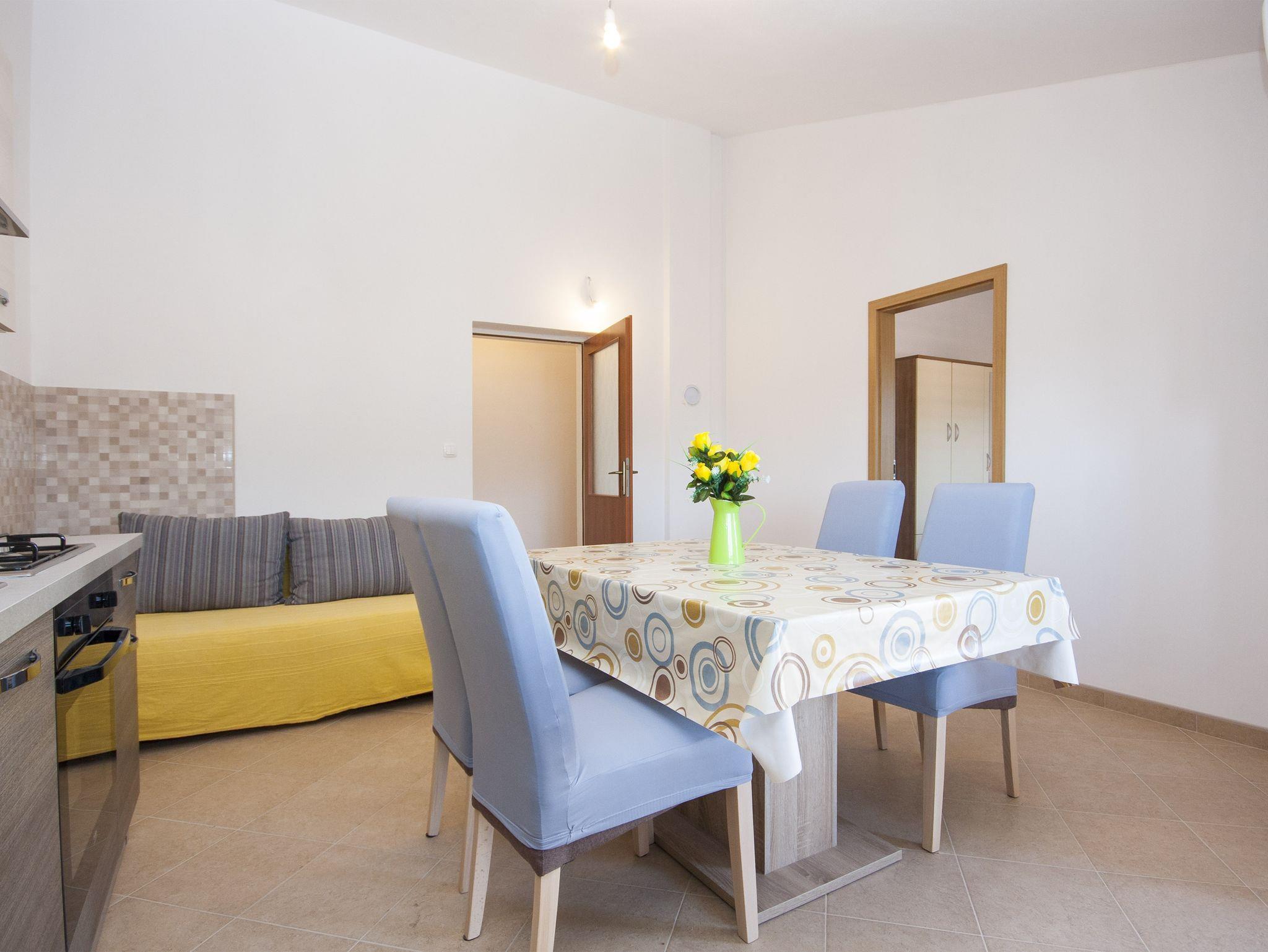 Ferienwohnung bietet Platz für 4 Gäste. Die Betten sind in Schlafzimmern, die es 1 gibt, und in Esszimmer, innerhalb einer Gesamtfläche von 43m2, angeordnet. Die Gäste haben eine eigene Terrasse zur Verfügung, auf der sie in warmen Sommernächten genießen können. Das Apartment bietet Meerblick. Es ist erlaubt, Speisen auf dem Gemeinschafts-Grill vorzubereiten. IM PREIS INBEGRIFFEN: Kurtaxe, Endreinigung, Klimatisierung, Parkplatz, Internet. VERBINDLICHE ZUSÄTZLICHE KOSTEN: Aufzahlung für Kurzaufenthalte (prozentualer Zuschlag pro Nächtigungsanzahl: 30% - 1, 20% - 2, 10% - 3). Die Verfügbarkeit zusätzlicher Dienstleistungen in Ihrem reservierten Termin und die Preise derselben (falls nicht aufgeführt) müssen im Voraus überprüft werden. Zusätzliche Dienstleistungen die in der Zahlungsaufforderung nicht aufgeführt sind werden direkt beim Vermieter bezahlt, angenommen der Gast nutzt auch diese.