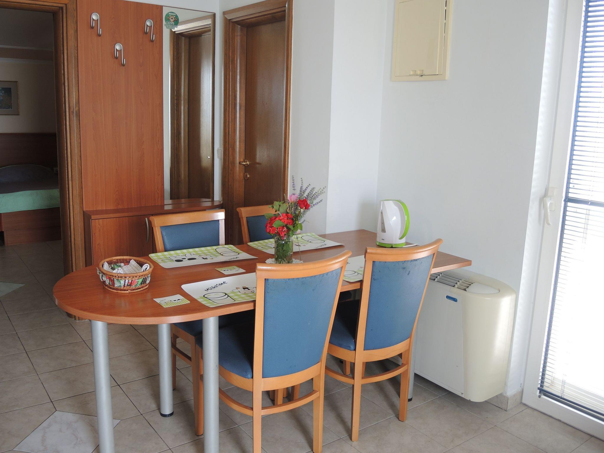 Ferienwohnung bietet Platz für 4 Gäste. Die Betten sind in Schlafzimmern, die es 1 gibt, und in Esszimmer, innerhalb einer Gesamtfläche von 33m2, angeordnet. Die Gäste haben einen eigenen Balkon zur Verfügung, auf der sie in warmen Sommernächten genießen können. Das Apartment bietet Meerblick. Es ist erlaubt, Speisen auf dem Gemeinschafts-Grill vorzubereiten. IM PREIS INBEGRIFFEN: Kurtaxe, Endreinigung, Klimatisierung, Parkplatz, Internet, Bootsanlegeplatz, Bügeleisen, Bügelbrett. VERBINDLICHE ZUSÄTZLICHE KOSTEN: Aufzahlung für Kurzaufenthalte (prozentualer Zuschlag pro Nächtigungsanzahl: 30% - 1, 20% - 2, 10% - 3). UNVERBINDLICHE ZUSÄTZLICHE KOSTEN: Wäschewaschen (12,00 € Waschen). Die Verfügbarkeit zusätzlicher Dienstleistungen in Ihrem reservierten Termin und die Preise derselben (falls nicht aufgeführt) müssen im Voraus überprüft werden. Zusätzliche Dienstleistungen die in der Zahlungsaufforderung nicht aufgeführt sind werden direkt beim Vermieter bezahlt, angenommen der Gast nutzt auch diese.