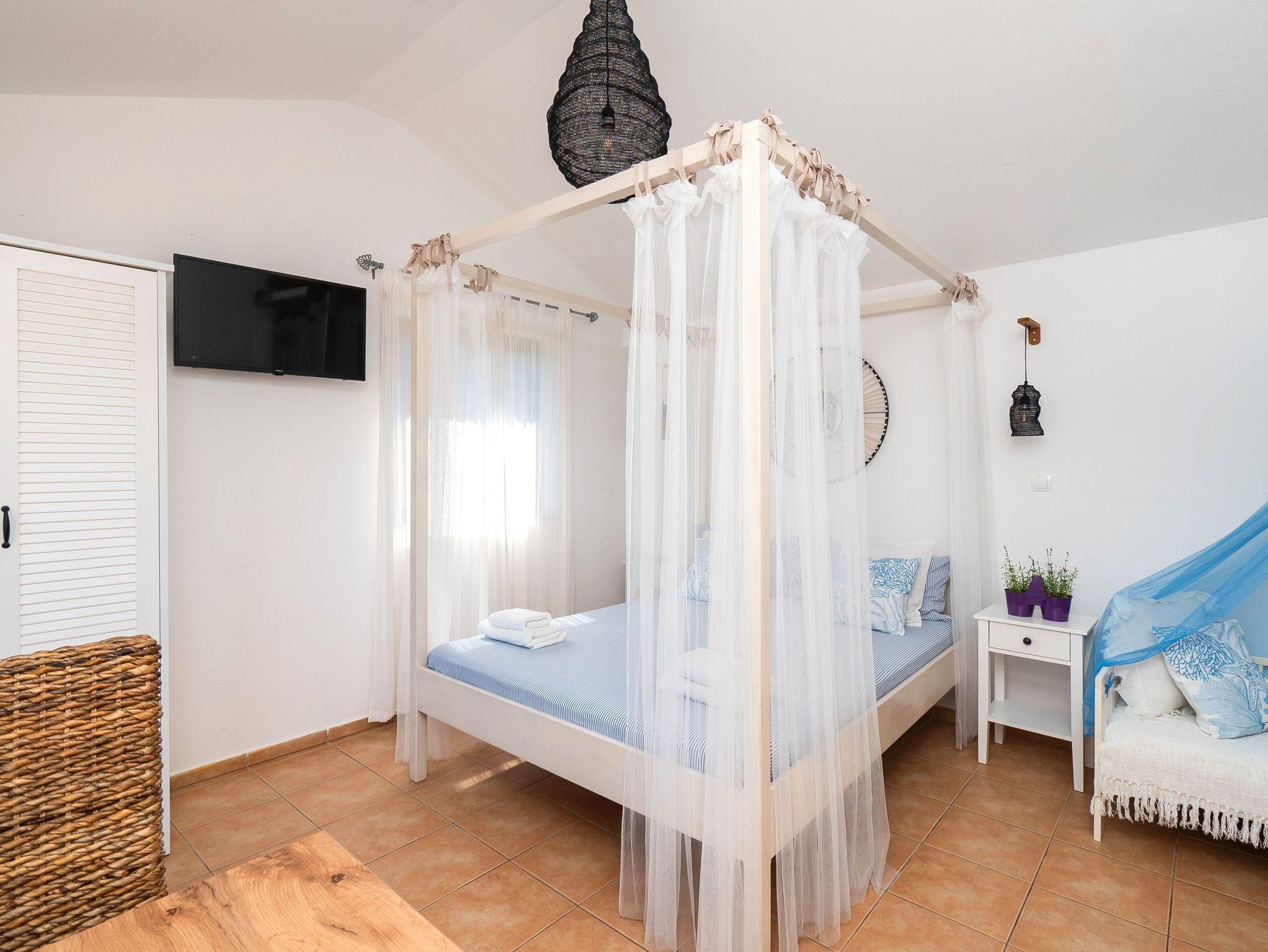 Studio bietet Platz für 2 Gäste. Die Betten sind in Schlafzimmern, die es 1 gibt, innerhalb einer Gesamtfläche von 23m2, angeordnet. Die Gäste haben eine eigene Terrasse zur Verfügung, auf der sie in warmen Sommernächten genießen können. Das Studio-Apartment bietet Meerblick. Es ist erlaubt, Speisen auf dem Gemeinschafts-Grill vorzubereiten. IM PREIS INBEGRIFFEN: Kurtaxe, Endreinigung, Klimatisierung, Parkplatz, Internet, Wäschewaschen, Kinderbett, Bügeleisen, Bügelbrett, Föhn, Liegestühle. UNVERBINDLICHE ZUSÄTZLICHE KOSTEN: Bootsanlegeplatz (10,00 € pro Nacht). Die Verfügbarkeit zusätzlicher Dienstleistungen in Ihrem reservierten Termin und die Preise derselben (falls nicht aufgeführt) müssen im Voraus überprüft werden. Zusätzliche Dienstleistungen die in der Zahlungsaufforderung nicht aufgeführt sind werden direkt beim Vermieter bezahlt, angenommen der Gast nutzt auch diese. Ermäßigung auf den Grundpreis: Gratistag 21=19 (bei einem Aufenthalt von 21 Tagen oder mehr erhalten Sie 2 Gratistage für den Aufenthalt bis 31.12.26).