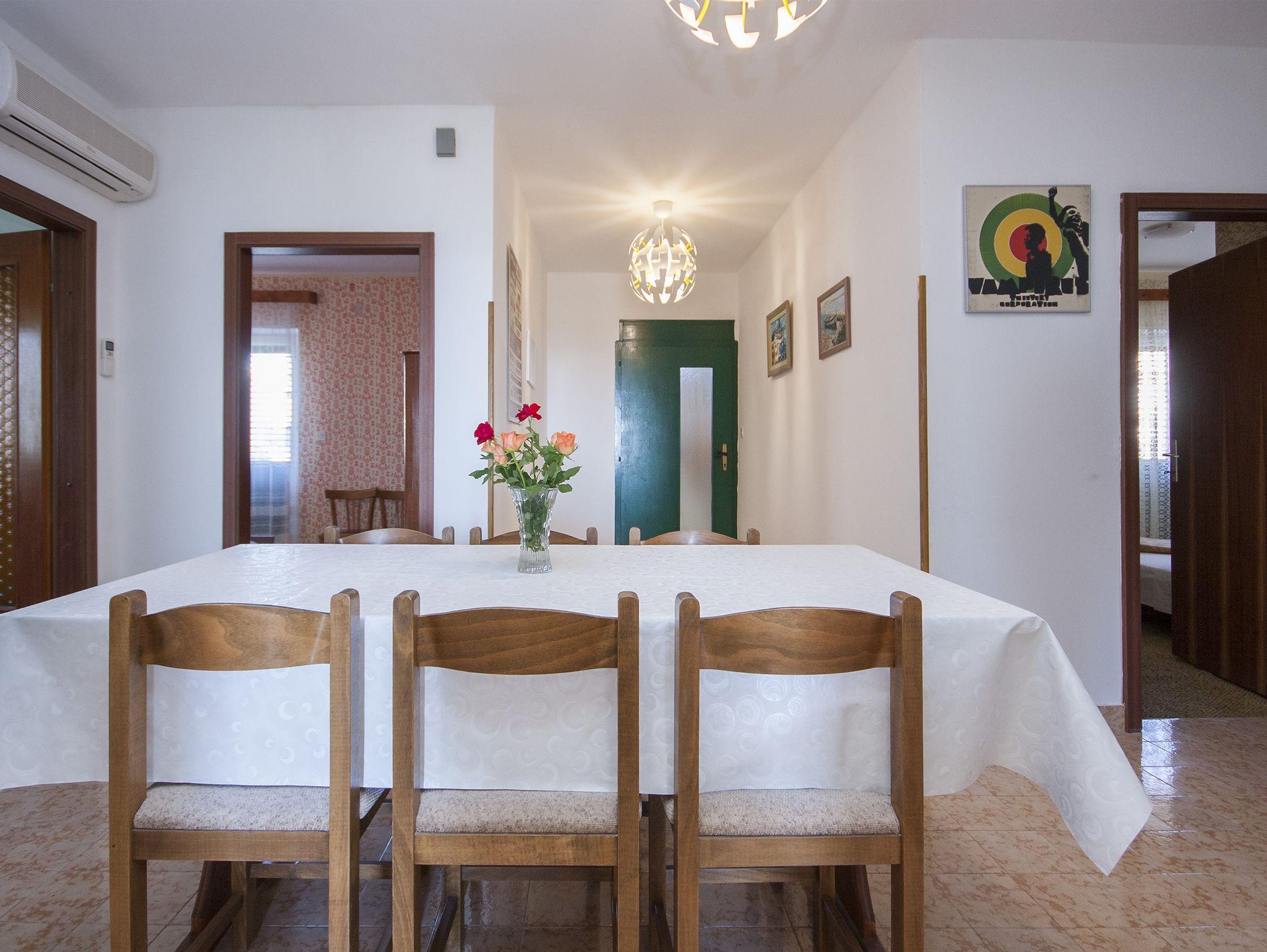 Ferienwohnung bietet Platz für 10 Gäste. Die Betten sind in Schlafzimmern, die es 5 gibt, innerhalb einer Gesamtfläche von 111m2, angeordnet. Die Gäste haben eine eigene Terrasse zur Verfügung, auf der sie in warmen Sommernächten genießen können. Das Apartment bietet Meerblick. Es ist erlaubt, Speisen auf dem Gemeinschafts-Grill vorzubereiten. IM PREIS INBEGRIFFEN: Kurtaxe, Endreinigung, Klimatisierung, Parkplatz, Internet. VERBINDLICHE ZUSÄTZLICHE KOSTEN: Aufzahlung für Kurzaufenthalte (prozentualer Zuschlag pro Nächtigungsanzahl: 30% - 1, 20% - 2, 10% - 3). UNVERBINDLICHE ZUSÄTZLICHE KOSTEN: Wäschewaschen (5,00 € Waschen). Die Verfügbarkeit zusätzlicher Dienstleistungen in Ihrem reservierten Termin und die Preise derselben (falls nicht aufgeführt) müssen im Voraus überprüft werden. Zusätzliche Dienstleistungen die in der Zahlungsaufforderung nicht aufgeführt sind werden direkt beim Vermieter bezahlt, angenommen der Gast nutzt auch diese.