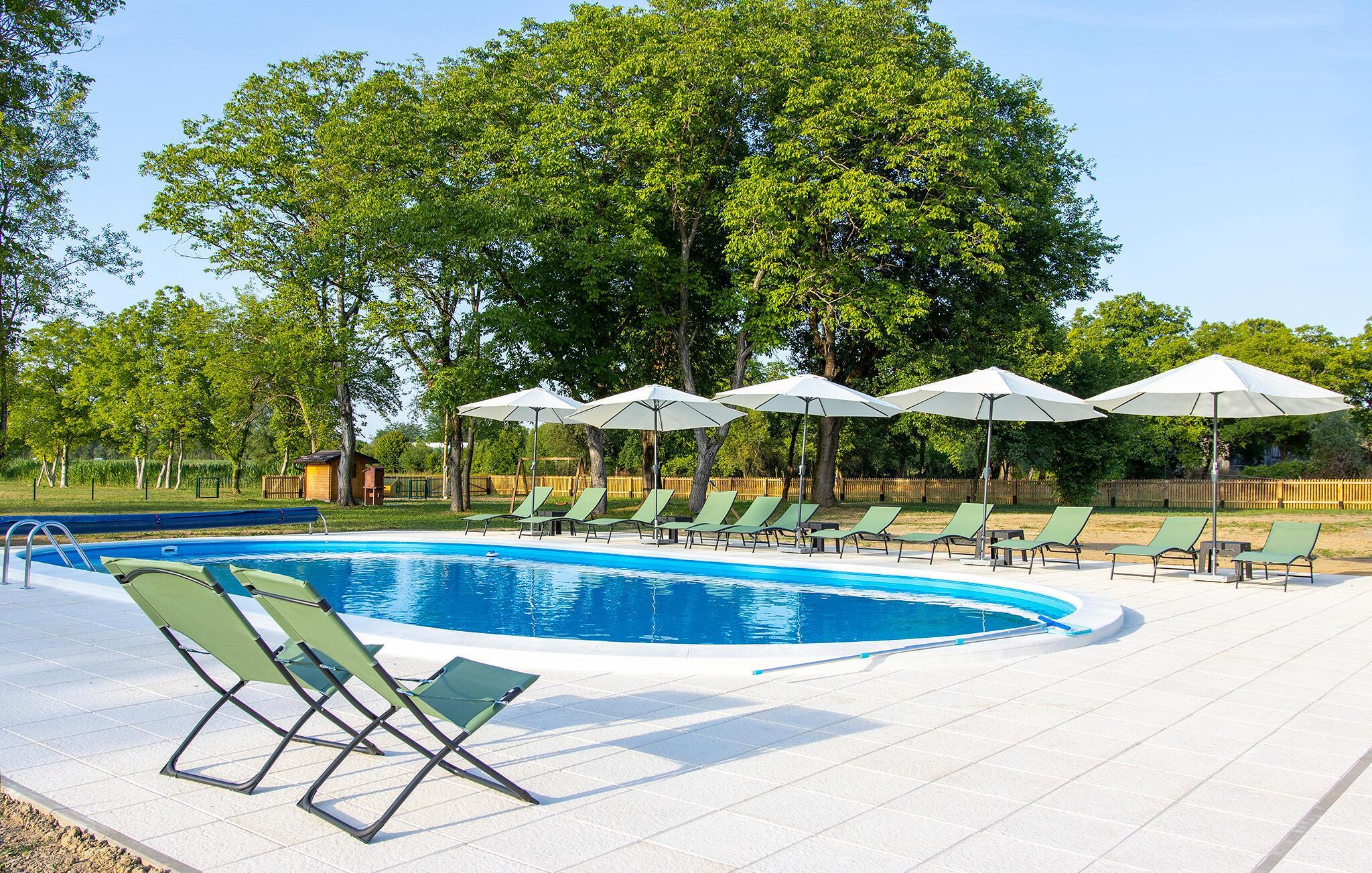 Treten Sie hinaus und entdecken Sie das großzügige Außengelände mit gepflegtem Garten, Sonnenliegen am runden Pool und einem großzügigen Essbereich im Schatten hoher Bäume. Spielen Sie Volleyball oder Fußball oder grillen Sie gemeinsam an den gemauerten Grillstellen. Kinder finden hier auch zahlreiche Spielmöglichkeiten.