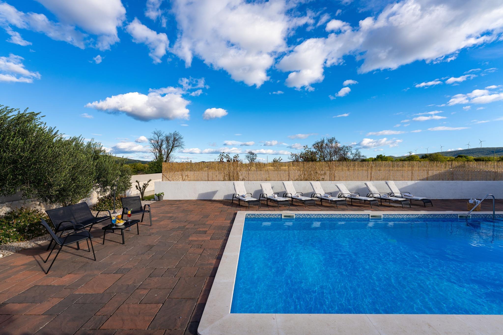Dieses schöne Ferienhaus liegt in der ruhigen Landschaft in der Nähe von Sibenik, nur 15 km vom nächsten Strand entfernt und in der Nähe des Nationalparks Krka. Umgeben von unberührter Natur bietet es absolute Privatsphäre und eine entspannte Atmosphäre, ideal für Familien oder Freunde, die einen ruhigen Rückzugsort suchen. Mit seinem privaten Swimmingpool, überdachten Terrassen und einem Kinderspielplatz garantiert das Anwesen einen komfortablen und unbeschwerten Urlaub für bis zu sieben Gäste. Das geräumige Interieur erstreckt sich über zwei Etagen und verfügt über vier klimatisierte Schlafzimmer, zwei Badezimmer und eine zusätzliche Toilette. Die offene Küche ist komplett ausgestattet und verbunden mit einem hellen Wohn- und Essbereich, der sich zur Terrasse hin öffnet. Im Außenbereich können die Gäste einen 50 m² großen privaten Pool, einen charmanten Grillplatz aus Stein und zwei überdachte Terrassen genießen, die sich ideal für Mahlzeiten im Freien eignen. Zu den Unterhaltungsmöglichkeiten gehören eine Tischtennisplatte, Darts und Brettspiele, während die Kleinen sich auf ihrem eigenen Spielplatz vergnügen können. Ein privater Parkplatz, schnelles WLAN und eine Klimaanlage im gesamten Haus sorgen für zusätzlichen Komfort. Die Lage der Unterkunft ist ideal, um Dalmatien zu erkunden. Der Nationalpark Krka ist nur 8 km entfernt, und bekannte Restaurants wie das mit einem Michelin-Stern ausgezeichnete Konoba Vinko und Konoba Campanelo befinden sich in der Nähe. Die Stadt Sibenik ist in 20 Minuten zu erreichen, während Zadar und Split beide weniger als eine Stunde entfernt sind. Dieses ruhige Landhaus bietet eine perfekte Mischung aus Entspannung, Privatsphäre und einfacher Erreichbarkeit der Küste und kultureller Sehenswürdigkeiten.