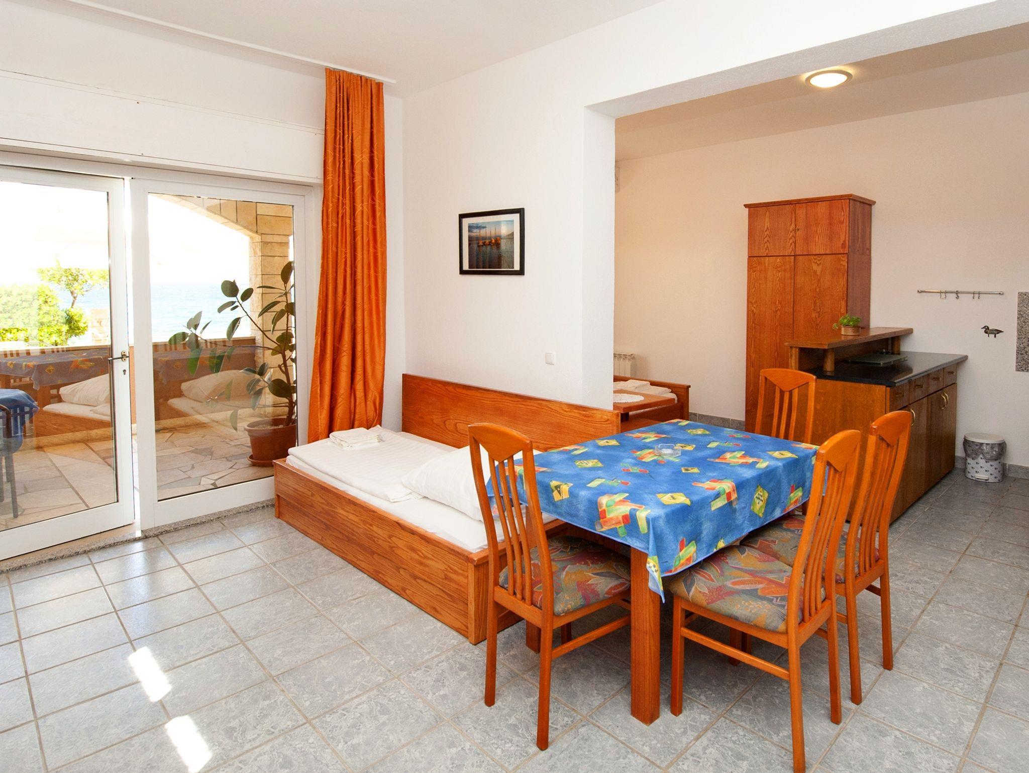 Studio bietet Platz für 4 Gäste. Die Betten sind in Schlafzimmern, die es 1 gibt, und in Esszimmer, innerhalb einer Gesamtfläche von 41m2, angeordnet. Die Gäste haben eine eigene Terrasse zur Verfügung, auf der sie in warmen Sommernächten genießen können. Das Studio-Apartment bietet Meerblick. Es ist erlaubt, Speisen auf dem Gemeinschafts-Grill vorzubereiten. IM PREIS INBEGRIFFEN: Kurtaxe, Endreinigung, Klimatisierung, Parkplatz, Internet, Kinderbett, Bügeleisen, Bügelbrett. VERBINDLICHE ZUSÄTZLICHE KOSTEN: Aufzahlung für Kurzaufenthalte (prozentualer Zuschlag pro Nächtigungsanzahl: 30% - 1, 20% - 2, 10% - 3). Die Verfügbarkeit zusätzlicher Dienstleistungen in Ihrem reservierten Termin und die Preise derselben (falls nicht aufgeführt) müssen im Voraus überprüft werden. Zusätzliche Dienstleistungen die in der Zahlungsaufforderung nicht aufgeführt sind werden direkt beim Vermieter bezahlt, angenommen der Gast nutzt auch diese.