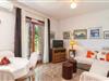 Draußen erwartet Sie eine großzügige Terrasse, die mit ihrem Panoramablick auf das Meer und die umliegenden Inseln begeistert. Genießen Sie hier Ihr Frühstück im Freien oder lassen Sie den Tag bei einem Glas Wein ausklingen. Für Abkühlung sorgt der Poolbereich mit Liegestühlen, umgeben von Olivenbäumen und den rustikalen Steinmauern.