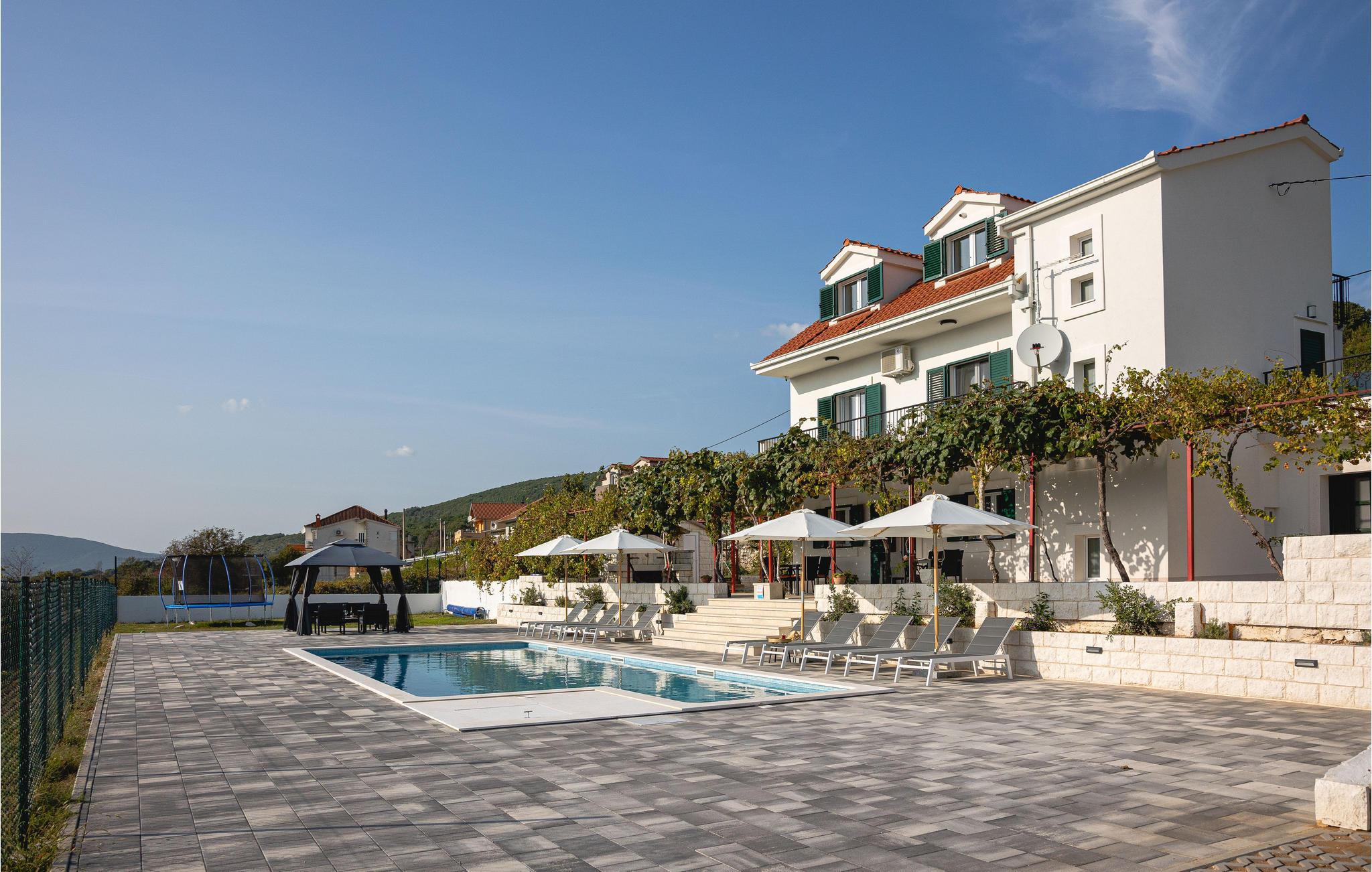 Freuen Sie sich auf Entspannung, Ruhe und Komfort und genießen dabei einen großartigen Ausblick auf die Landschaft Dalmatiens. Willkommen in diesem hellen und geschmackvoll eingerichteten Ferienhaus, das keine Wünsche unerfüllt lässt. Komfort wird hier großgeschrieben und macht es Ihnen einfach Ihren hektischen Alltag hinter sich zu lassen und einfach die Beine hochzulegen. Das Wohnzimmer, die Küche und das Esszimmer können dabei zentraler Treffpunkt der ganzen Gruppe werden. Sie können aber auch im privaten Fitnessbereich Ihrem Sportprogramm nachgehen oder bei Spiel und Spaß Tischkicker und Tischtennis spielen oder im Swimmingpool baden. Kommen Sie auch zu einem kühlen Getränk oder kleinen Snacks auf den Terrassen zusammen und planen Ihre bevorstehenden Urlaubstage.