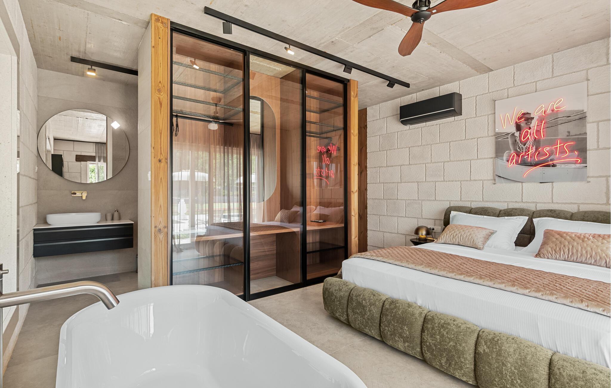 Diese moderne, ebenerdig erbaute Villa verwöhnt Sie mit zahlreichen Extras und einem stilvoll eingerichteten Innenbereich. Extravagante Details und eine durchdachte Beleuchtung sorgen für eine angenehme Wohnatmosphäre. Zaubern Sie kulinarische Highlights in der offenen Küche und zelebrieren Sie Ihre Mahlzeiten mit Blick auf den Pool. Für gemütliche Filmabende und gesellige Spieleabende lädt eine großzügige Sofalandschaft ein.