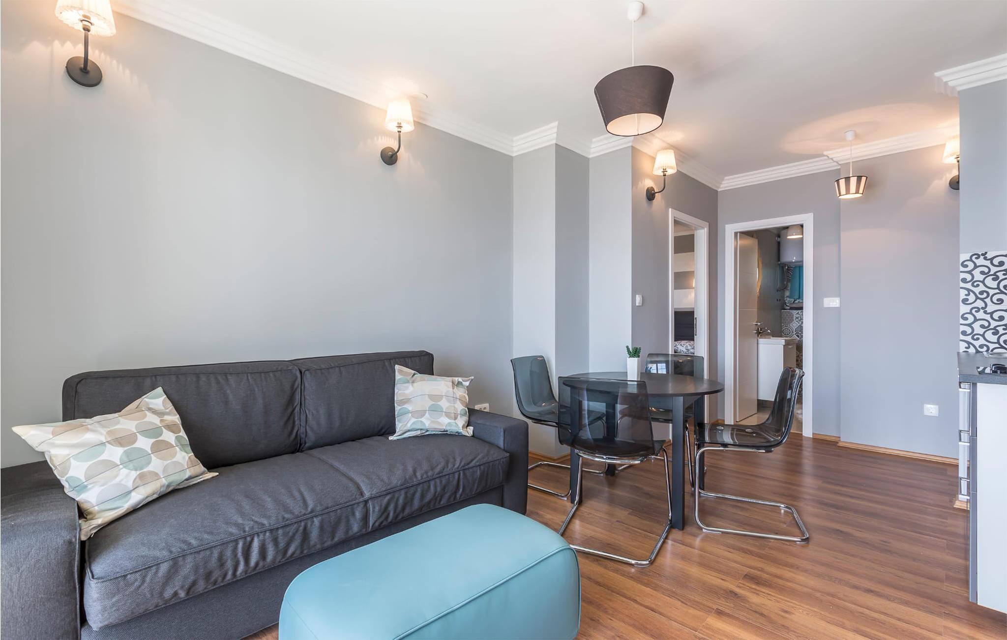 In den modern gestalteten Räumen dieser Ferienwohnung werden Sie sich schon beim Eintreten wohlfühlen. Ansprechende Farben, stilvolle Möbel und eine geschmackvolle Einrichtung bilden den idealen Rahmen für einen erholsamen Urlaub. Hier dürfen Sie auch Ihren Hund mitbringen. Bereiten Sie in der Wohnküche gemeinsam die Mahlzeiten zu und genießen Sie sie an Ort und Stelle. Freuen Sie sich auf gemütliche Abende zusammen auf dem Wohnzimmersofa.