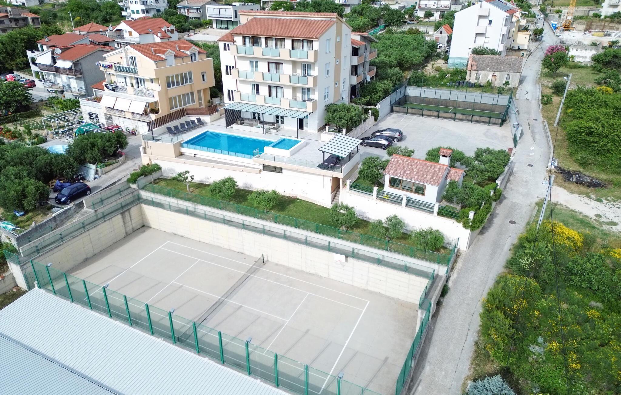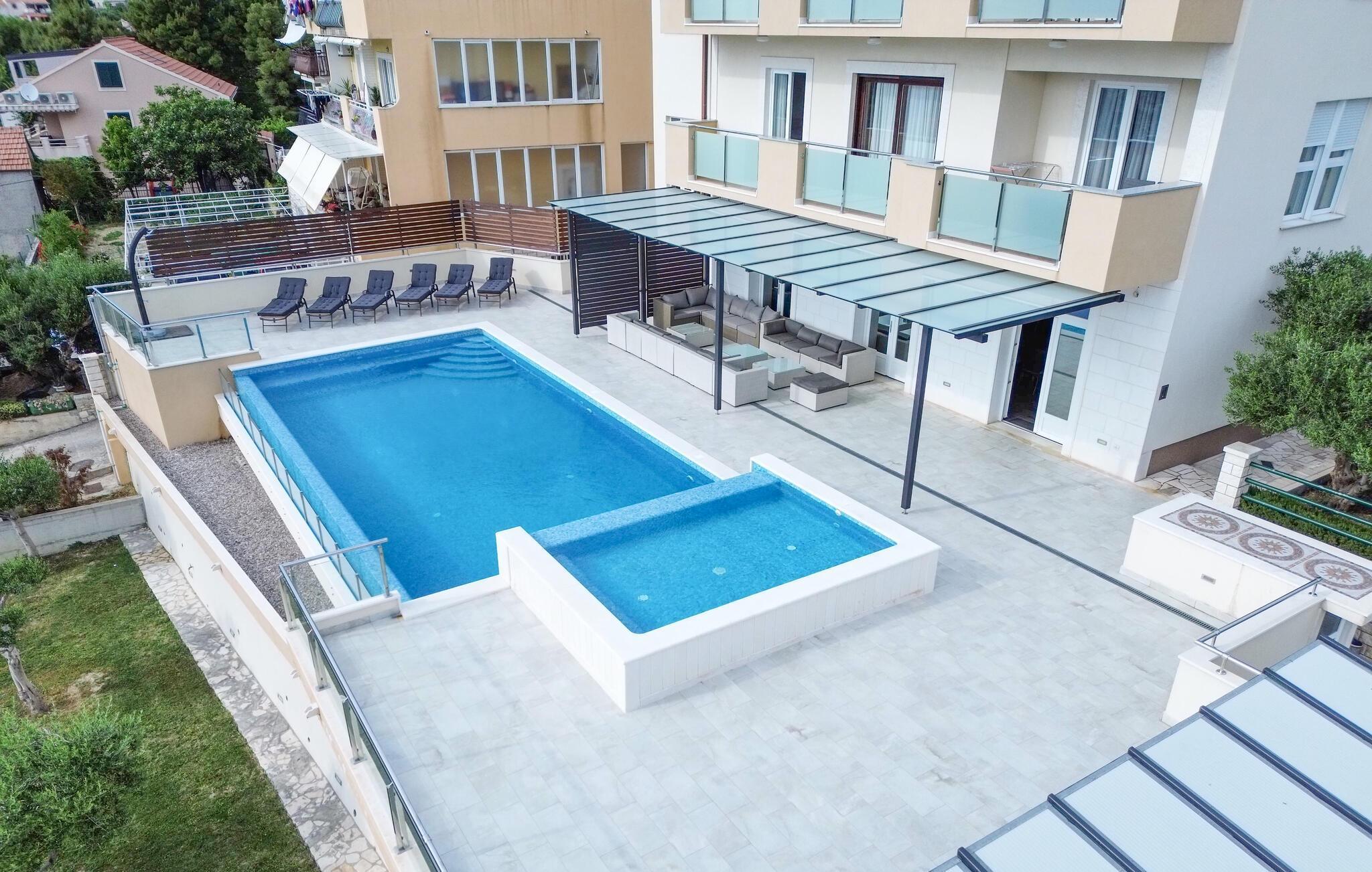 Dieses exklusiv eingerichtete Ferienhaus ist die perfekte Unterkunft für eine größere Gruppe. Im Erdgeschoß befindet sich ein geräumiges Wohnzimmer mit Küche. Von der Terrasse davor haben Sie einen unvergesslichen Ausblick auf Split und das Meer. Der Swimmingpool hat auch einen flachen Teil für Kinder. Auf den Etagen befinden sich drei komplett eingerichtete Wohnungen mit je drei Schlafzimmern. Im Untergeschoß finden Sie ein topp ausgestattetes Fitnessstudio, Billardraum, eine „Konoba“ (auf deutsch: Taverne) und einen Raum für die Weinprobe. Neben dem Pool befindet sich auch die Sauna. Auf dem riesigen Anwesen sind auch ein Tennisplatz, Fußballplatz, ein Häuschen mit Grill und kleiner Sommerküche vorhanden. Möglichkeit der Massage, Maniküre und Pediküre gegen Gebühr und in Absprache mit dem Eigentümer.
